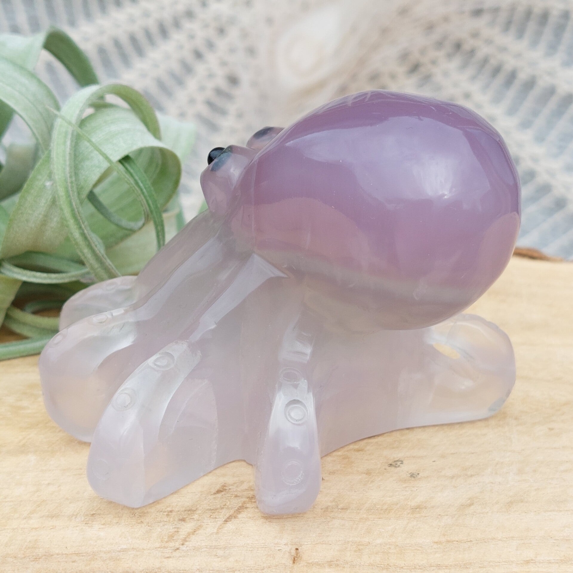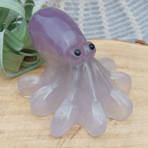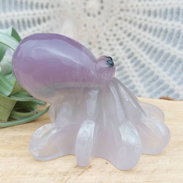 Prachtige Octopus van zacht paars / lavendel kleurige Fluoriet uit Brazilie. Dit prachtig handgeslepen exemplaar is 11x 9x 7cm en 485 gram