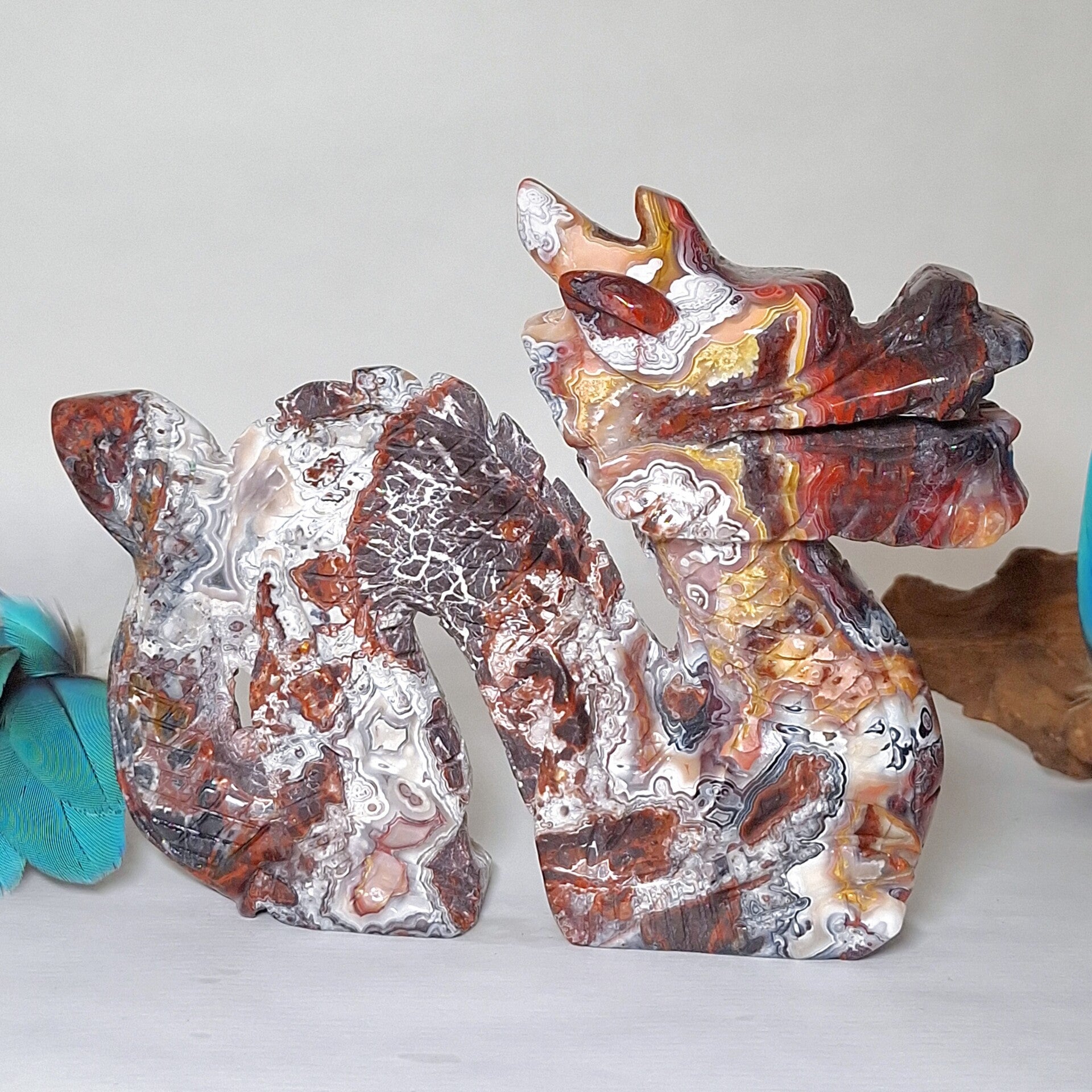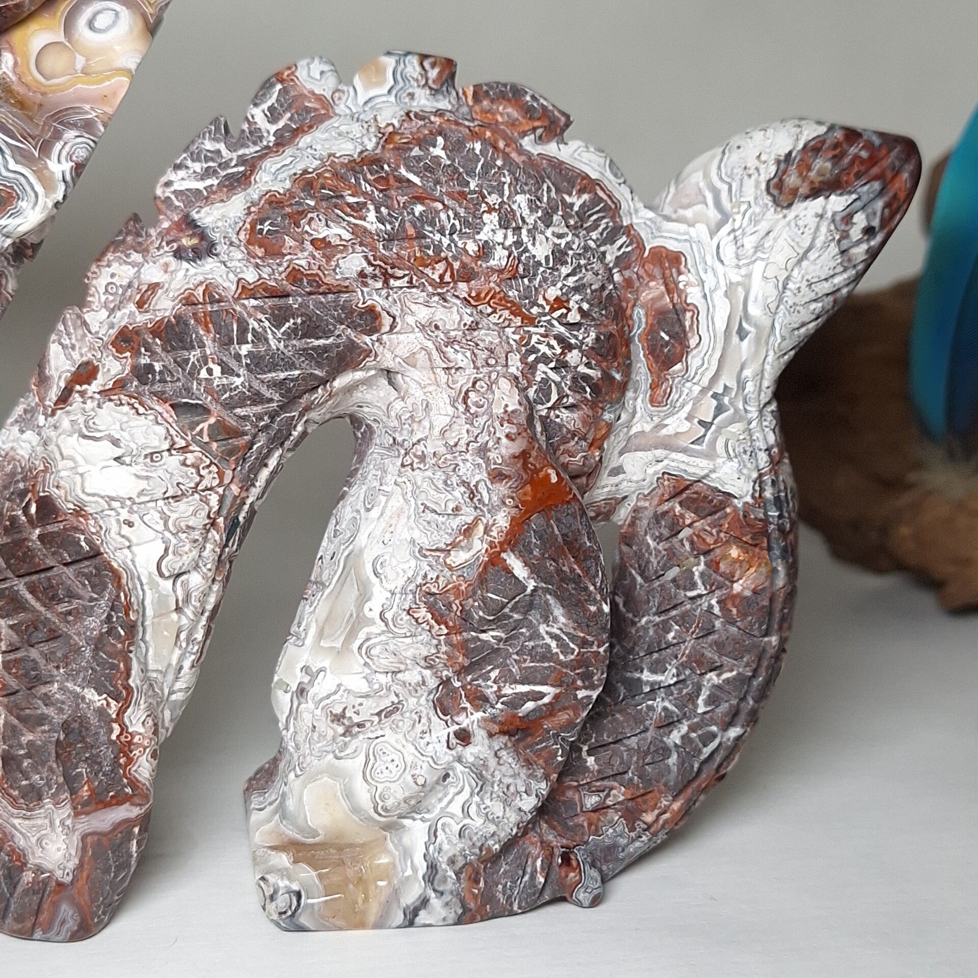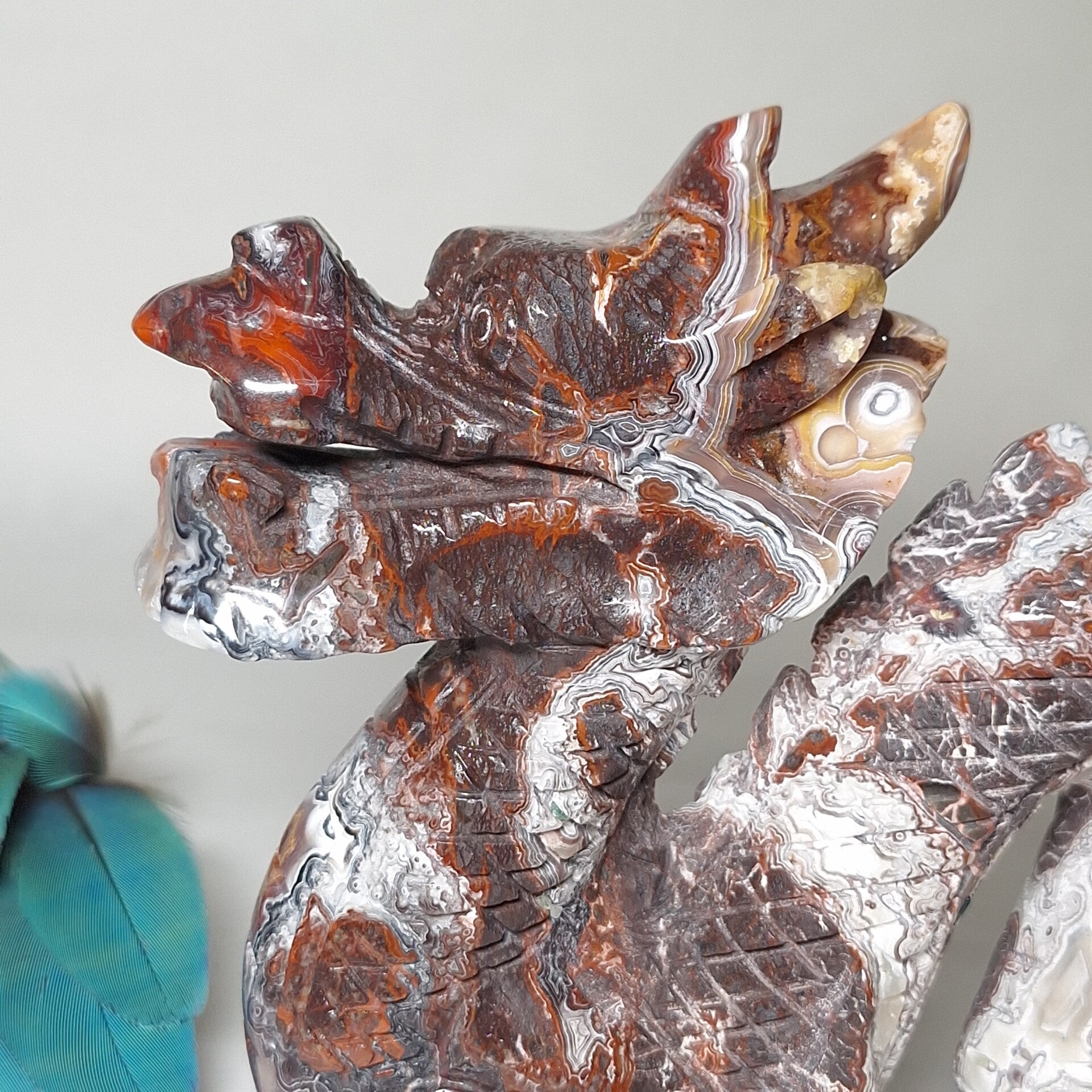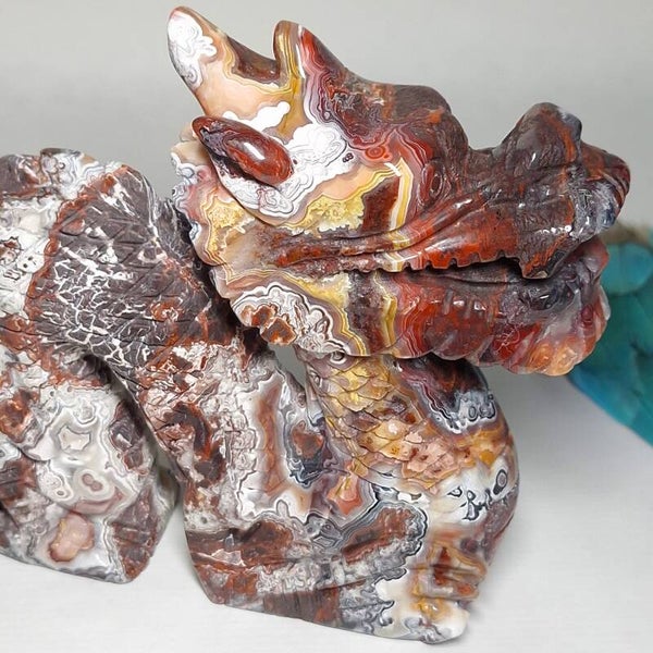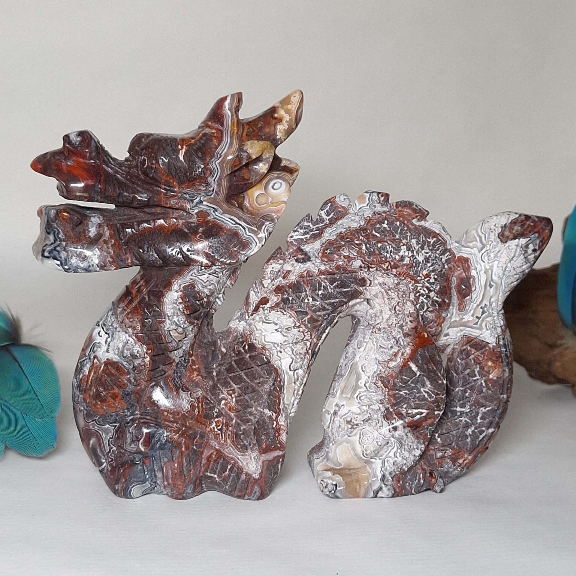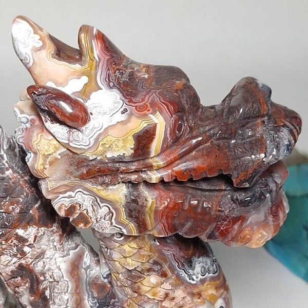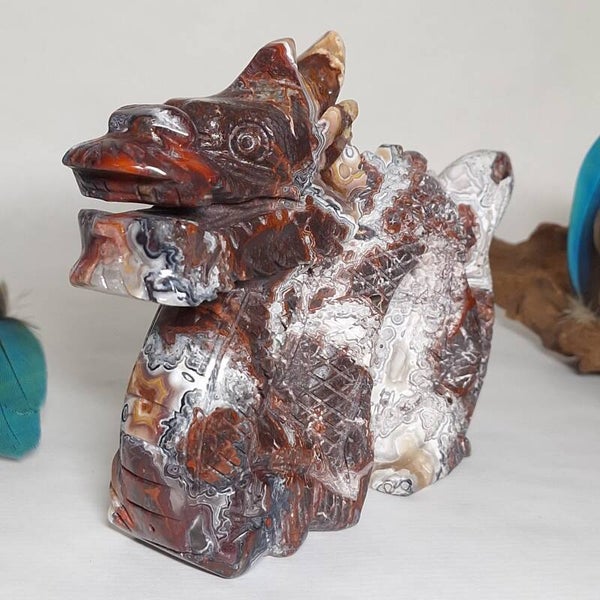 Prachtig mooi handgeslepen beeld van prachtige Mexicaanse Agaat met fantastisch mooie kleuren en patronen. Deze Draak is speciaal voor ons gemaakt door een slijper die liefde heeft voor de natuur en ook veel waarde hecht aan de energetische werking van de "stenen" en hun vorm. Dat deze carving met geduld, zorgvuldig en met liefde is gemaakt is ook te zien en energetisch te voelen. Het is een mooie grote Draak geworden met met prachtige vormgeving en heerlijke energie. Drakenenergie die o.a zacht, krachtig en liefdevol is.