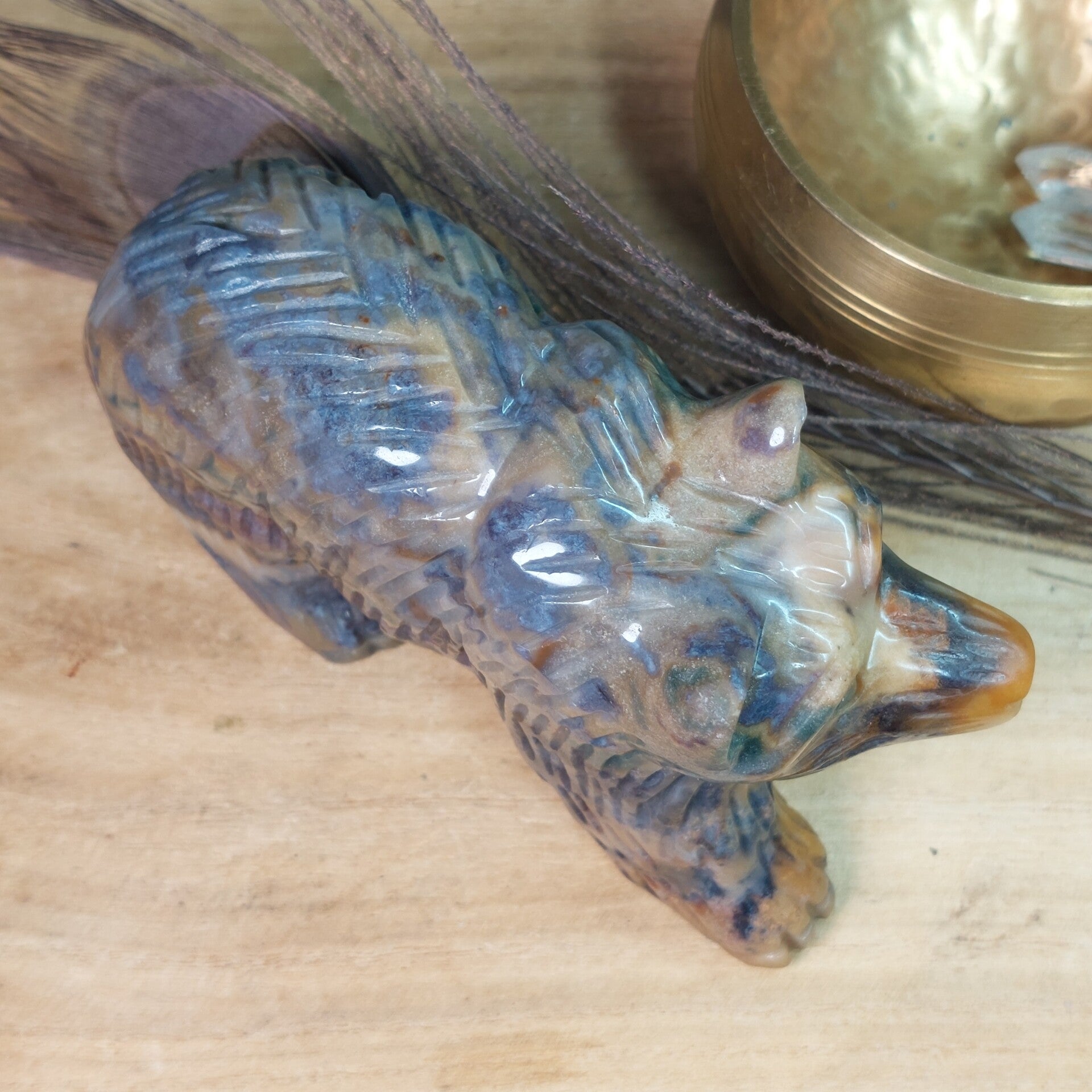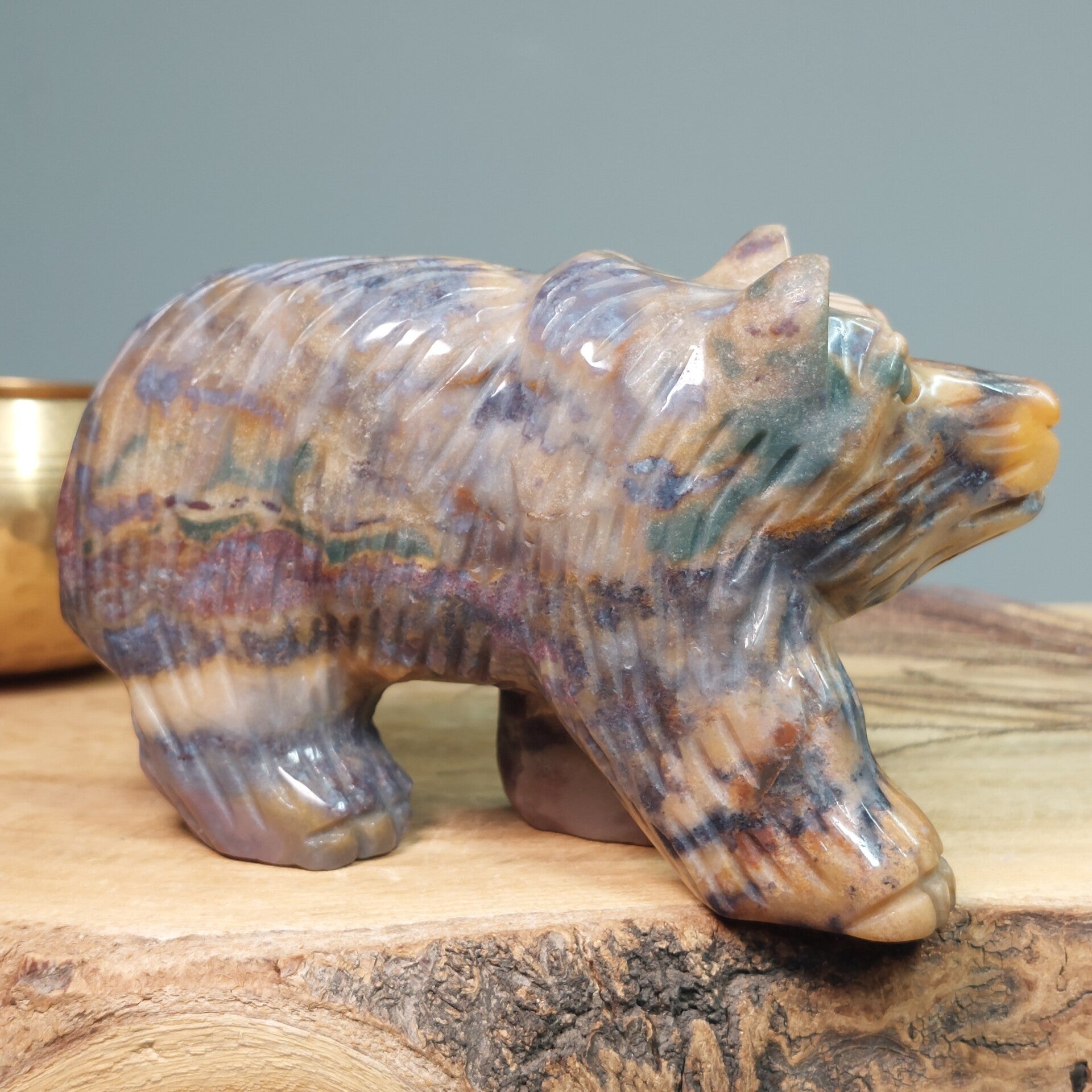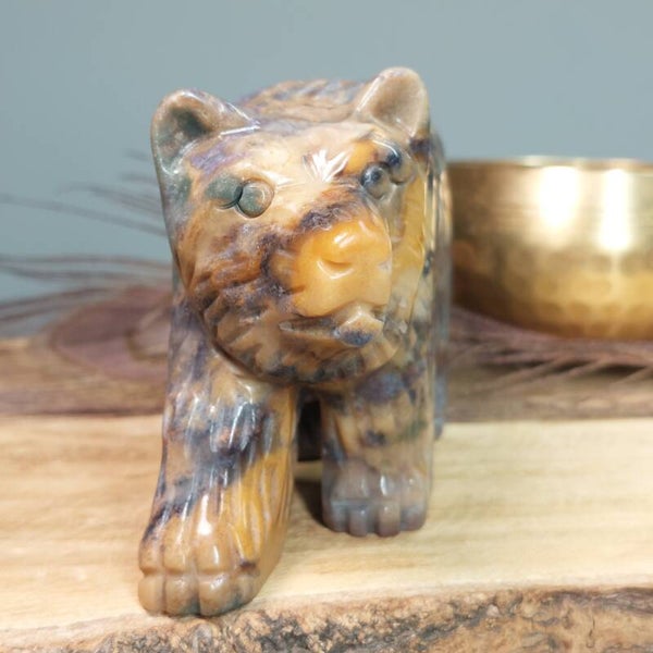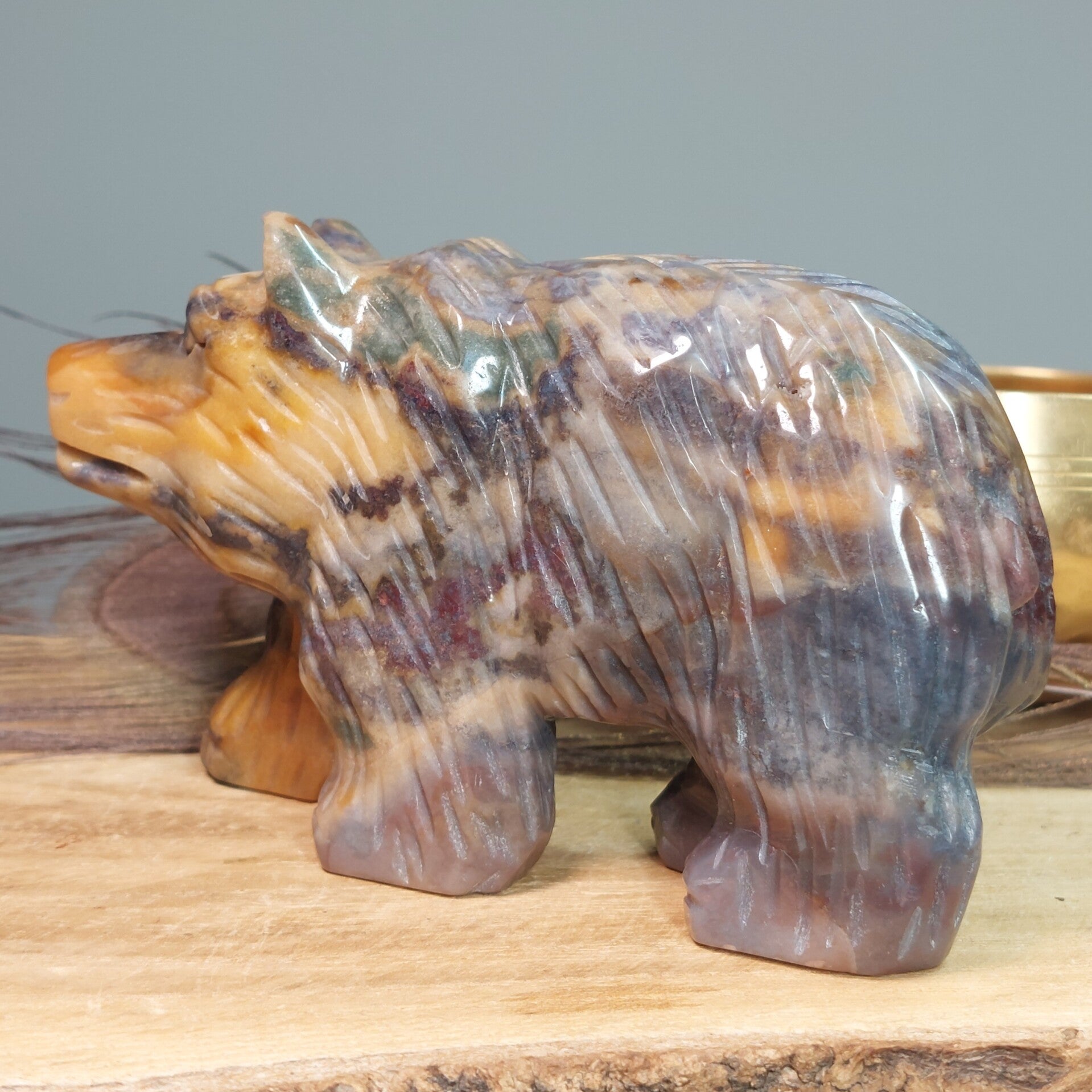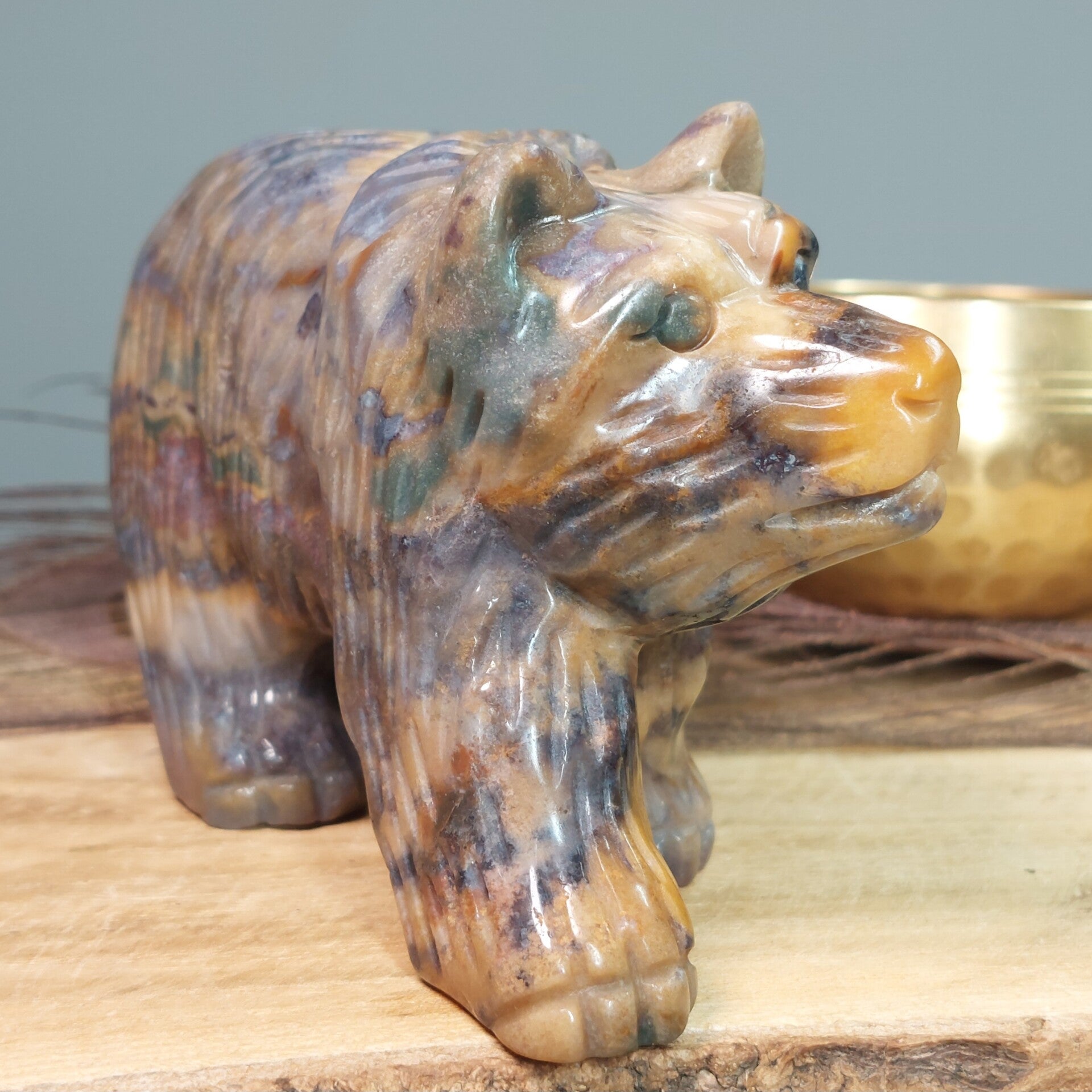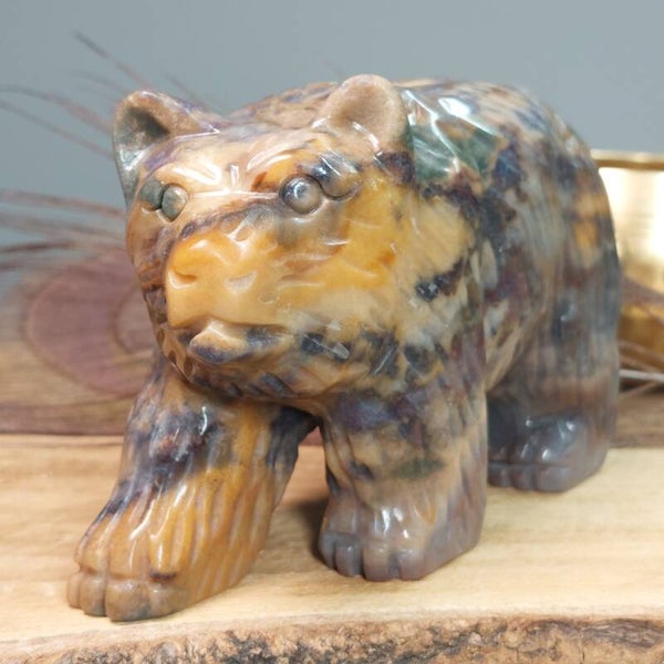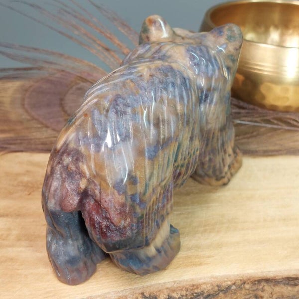 Prachtig handgeslepen Oceaan Jaspis / Zee Jaspis grote beer van een halve kilo en 12,3 cm met een prachtige uitstraling. De beer heeft zeer mooie patronen en kleuren.