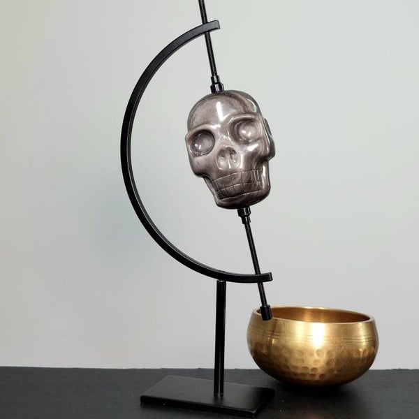 Prachtige skull die aan beide kanten een gezicht heeft dus perfect om ergens neer te zetten als toevoeging op het interieur, van alle kanten even prachtig. De kwaliteit van deze Zilver Obsidiaan is enorm goed, hij heeft volop zilveren gloed aan beide kanten. De standaard is maar liefst 25 cm en de skull zo'n 7 cm.