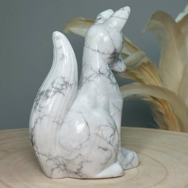 Prachtige Howliet vos die weer fantastisch mooi met de hand is geslepen. Je ziet gewoon de liefde voor "stenen" en slijpen van de kunstenaar terug in deze prachtige vos. De uitstraling en details zijn echt geweldig mooi. Deze mooie (Pool) vos id 644 gram en 14,5cm (van oor tot achterkant staart)