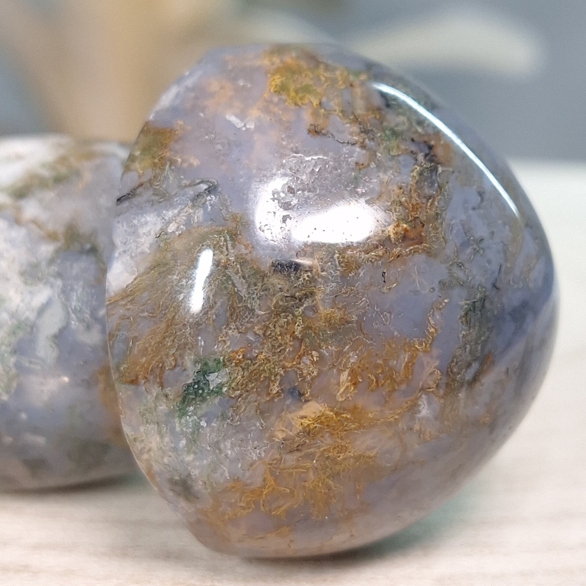 Mosagaat helpt je om zorgen los te laten en te ontspannen. Maakt actief en vitaal. Mosagaat geeft rust en helderheid, maakt bevalling makkelijker, positieve invloed op de ontwikkeling van de foetus, stimuleert wilskracht en werklust, zorgt voor meer uithoudingsvermogen, opent het hart voor universele liefde, geeft energie en helpt om beter te aarde. Mosagaat heeft een positieve werking op de weerstand, het immuunsysteem, hart en bloedvaten en de longen. De energieën zijn bescheiden maar heilzaam. Hij werkt stabiliserend en aardend. De energie van deze steen zorgt ervoor dat lichaam, geest en ziel naar hun natuurlijke evenwicht worden gebracht zodat je meer rust kunt ervaren op alle niveaus. Mos agaat helpt je te herstellen na ziekte en om weer tot jezelf te komen na een periode van emotionele onrust. Mosagaat werkt goed tegen angsten en stress. Helpt tegen straling. Mosagaat is heel goed voor mensen met schrik en angsten en fobieën of straatvrees, door het dragen krijg je meer eigenwaarde en gevoel van onaantastbaarheid, hij helpt je om overal weer de schoonheid van in te zien. Deze steen is zeer goed voor alle mensen die met planten en gewassen werken.Het is een steen voor een nieuw begin en helpt bij het opheffen van blokkades. Bij een scheiding, overlijden of intens verdriet geeft de mosagaat een steuntje in de rug, hij helpt je ook bij het afscheid nemen van het verleden en geeft rust in lichaam en geest. Mosagaat is een steen van rijkdom en trekt overvloed aan.Hij helpt ook mensen die erg in hun hoofd zitten bij hun gevoel te komen. De steen helpt om met andere mensen om te gaan en deze ruimte tot groei te geven. Geestelijk bevordert hij zelfexpressie en communicatie. Deze optimistische steen is zeer behulpzaam voor mensen die depressief zijn vanwege hun levensomstandigheden of door een onbalans in de hersenen, hij geeft dan inzicht in de achterliggende oorzaken. Mosagaat is goed bij ongemakken aan de neus_ en keelholten, ook zorgt hij voor het beter oplossen van slijm, ontkrampt de maag, darmen en blaas. Ook goed voor de seksuele organen en maakt ze gelijktijdig actief. De steen gaat ontstekingen tegen, reinigt de bloedsomloop en versterkt het immuunsysteem. Goed voor het lymfesysteem en als elixer op de huid aangebracht behandelt Mosagaat schimmelinfecties en andere huidinfecties. Goed voor huid, haren en bevordert spijsvertering