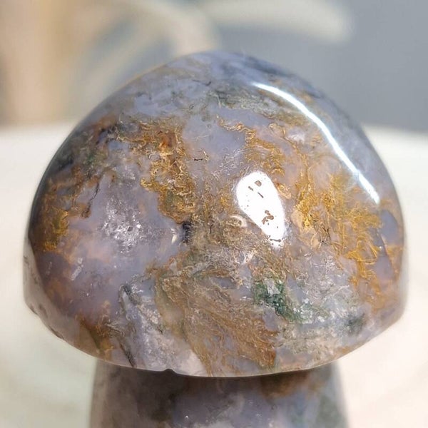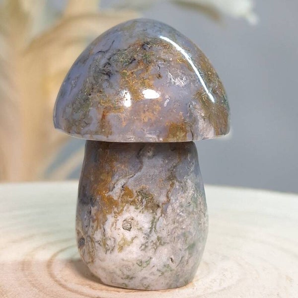 Prachtige paddenstoel met Blauwe Chalcedoon en diverse kleuren Mosagaat. Mooi formaat van 6 cm