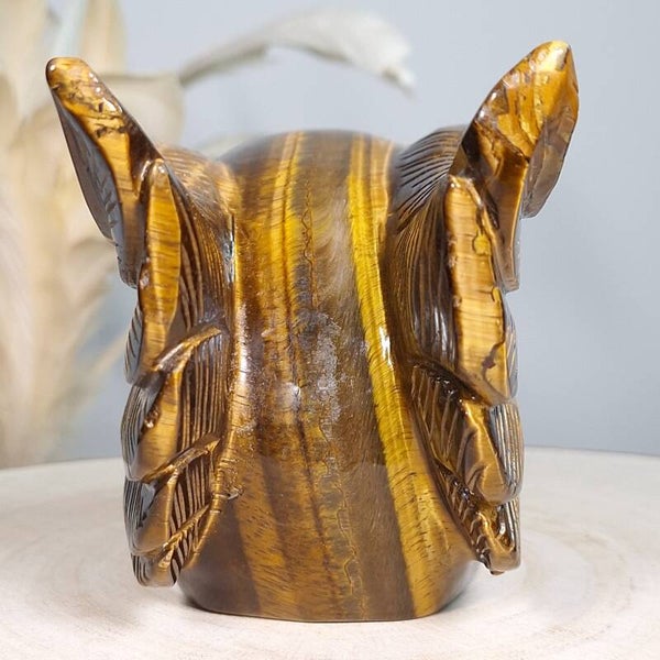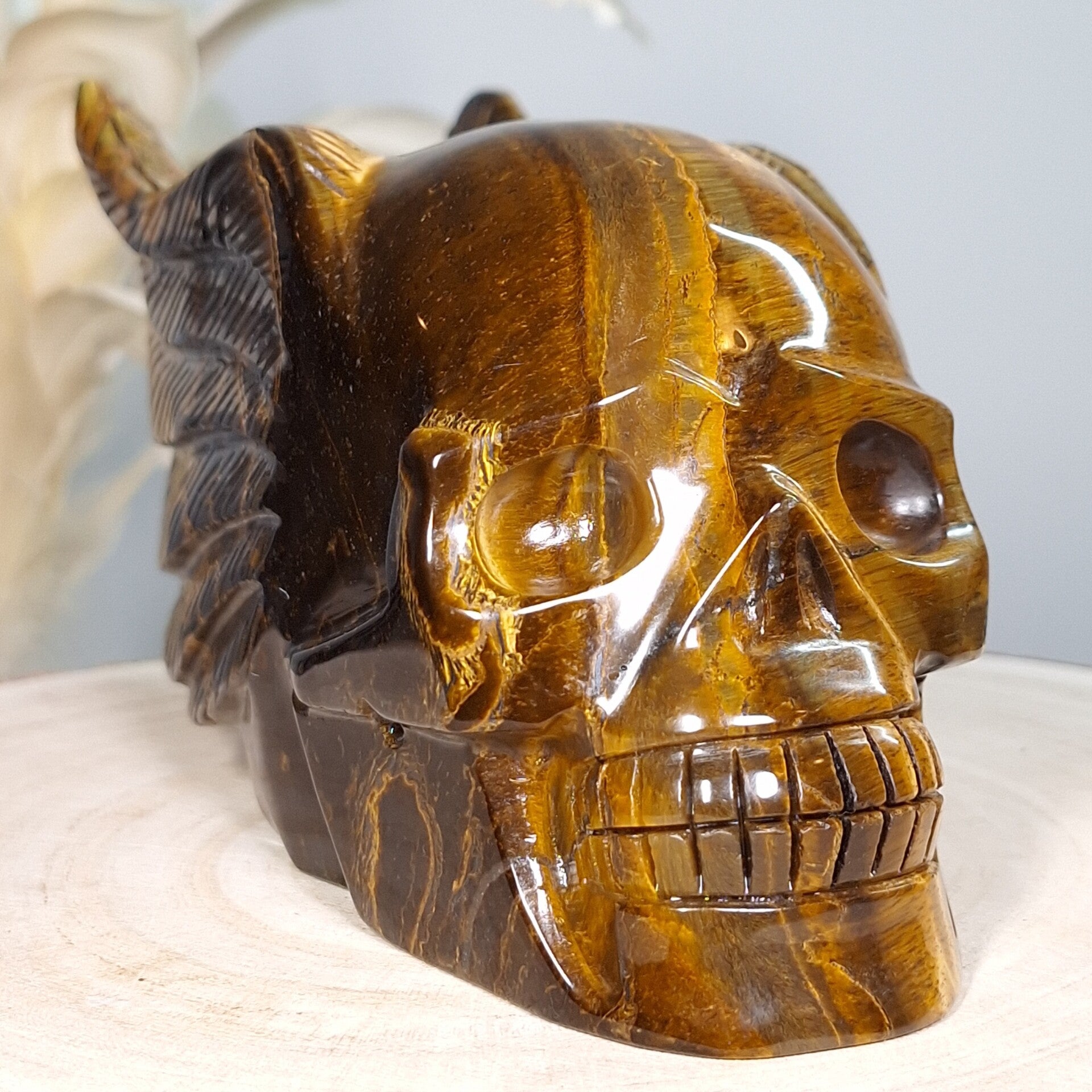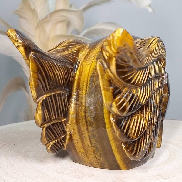 Prachtige grote handgeslepen skull van gemaakt van Afrikaanse Tijgeroog met prachtige "flash" en mooie patronen 18cm. De skull is van prachtige kwaliteit en erg gedetailleerde waardoor er vele uren/ dagen werk in zit om deze te maken. Het is een flinke skull van 18cm en 1,3 kilo met een heerlijke energie die voor bescherming mag zorgen en prachtig mag gaan stralen stralen in Welker ruimte dan ook.