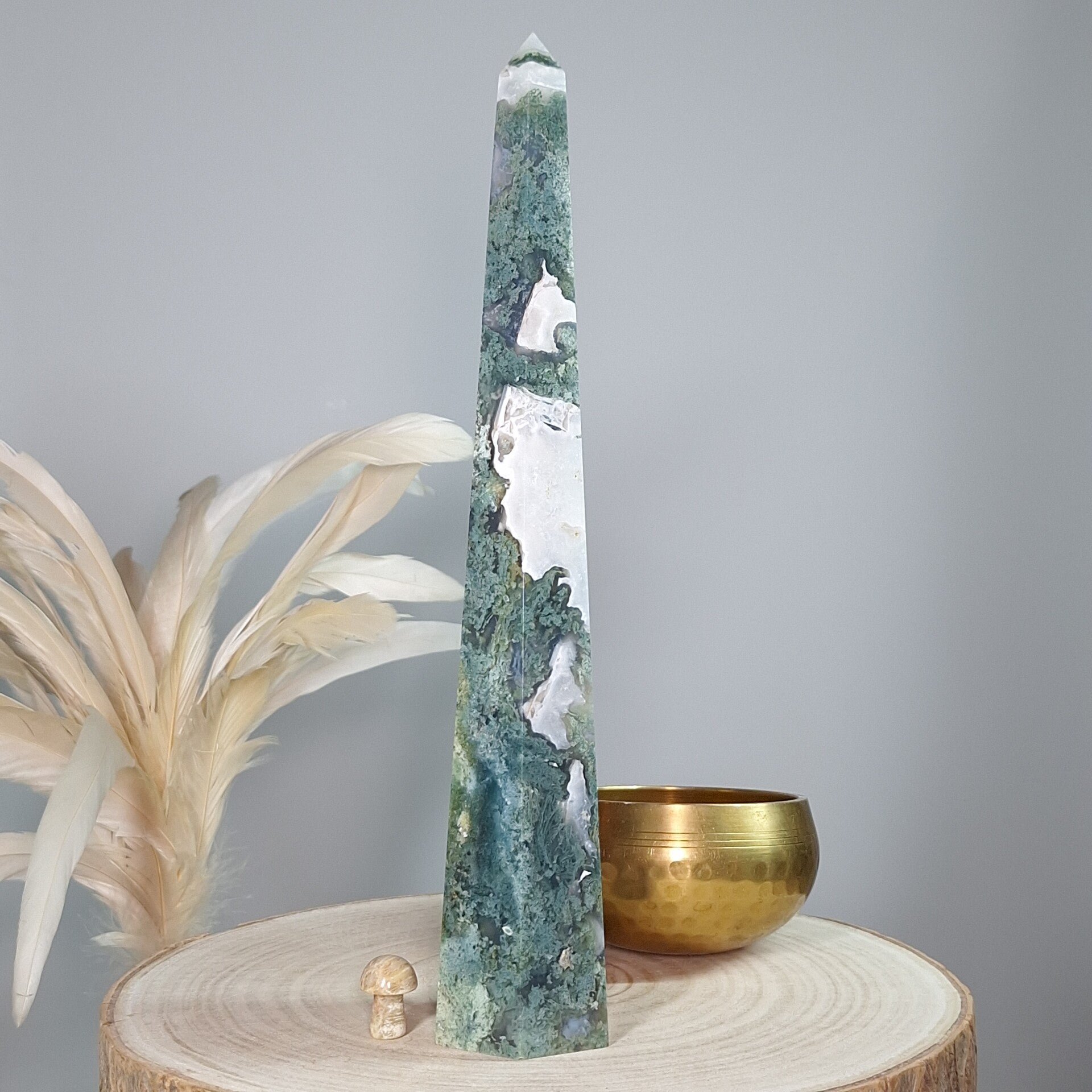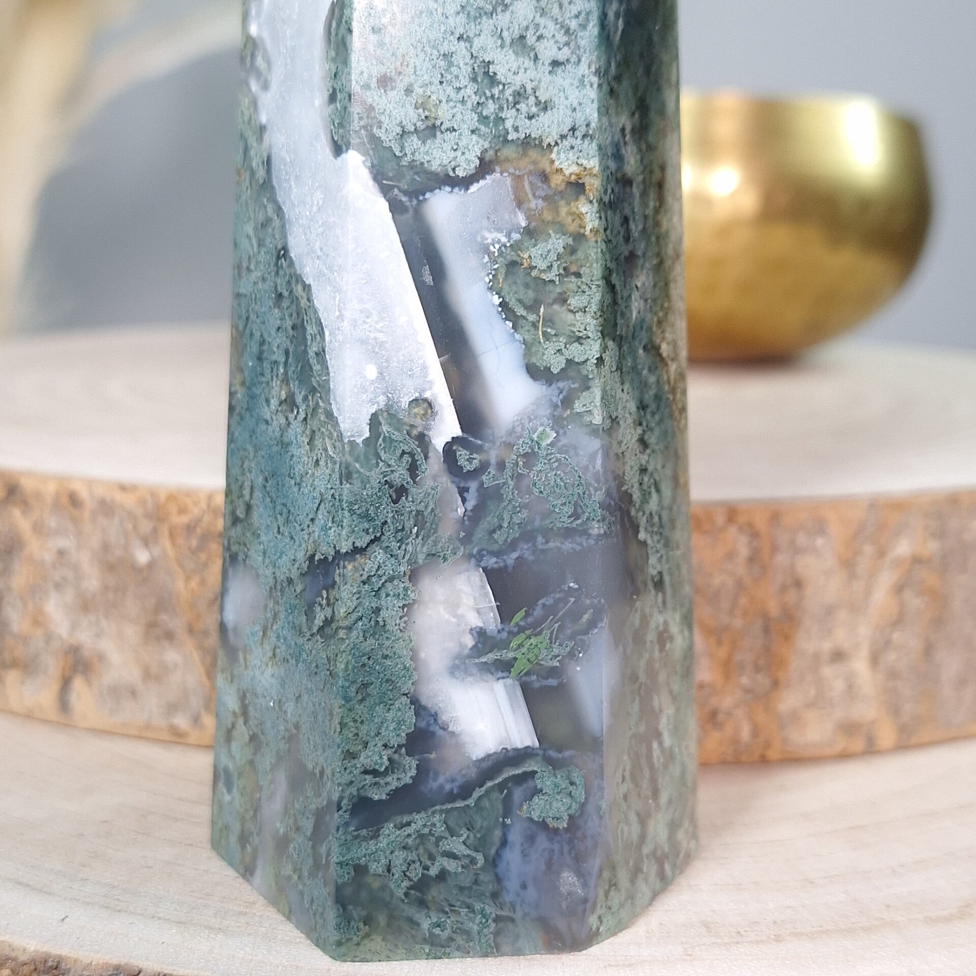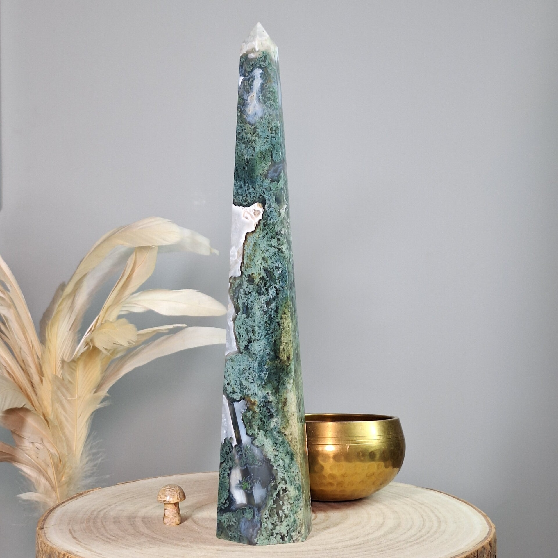 Mosagaat XL toren. Prachtige vormgeving, patronen en kwaliteit. 25,5 cm Fantastisch mooie grote elegante toren van Mosagaat met prachtige patronen. Je raakt niet uitgekeken op de mosachtige insluitsels, echt heerlijk om in weg te dromen. Zeer mooi als aanvulling op het interieur, thuis, op kantoor, praktijk salon of school voor meer sfeer, rust, harmonie en positieve energie.