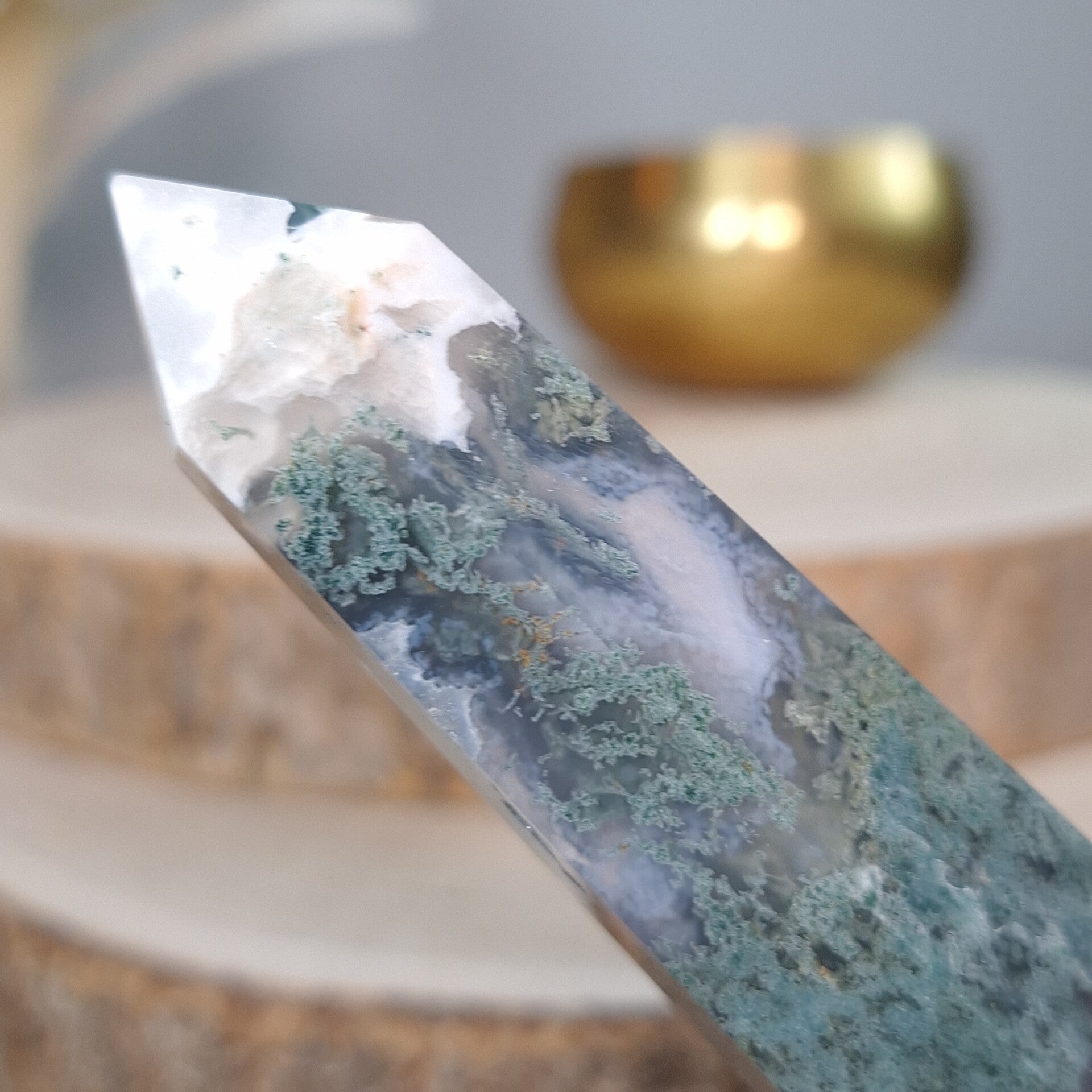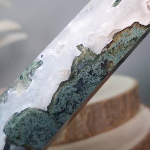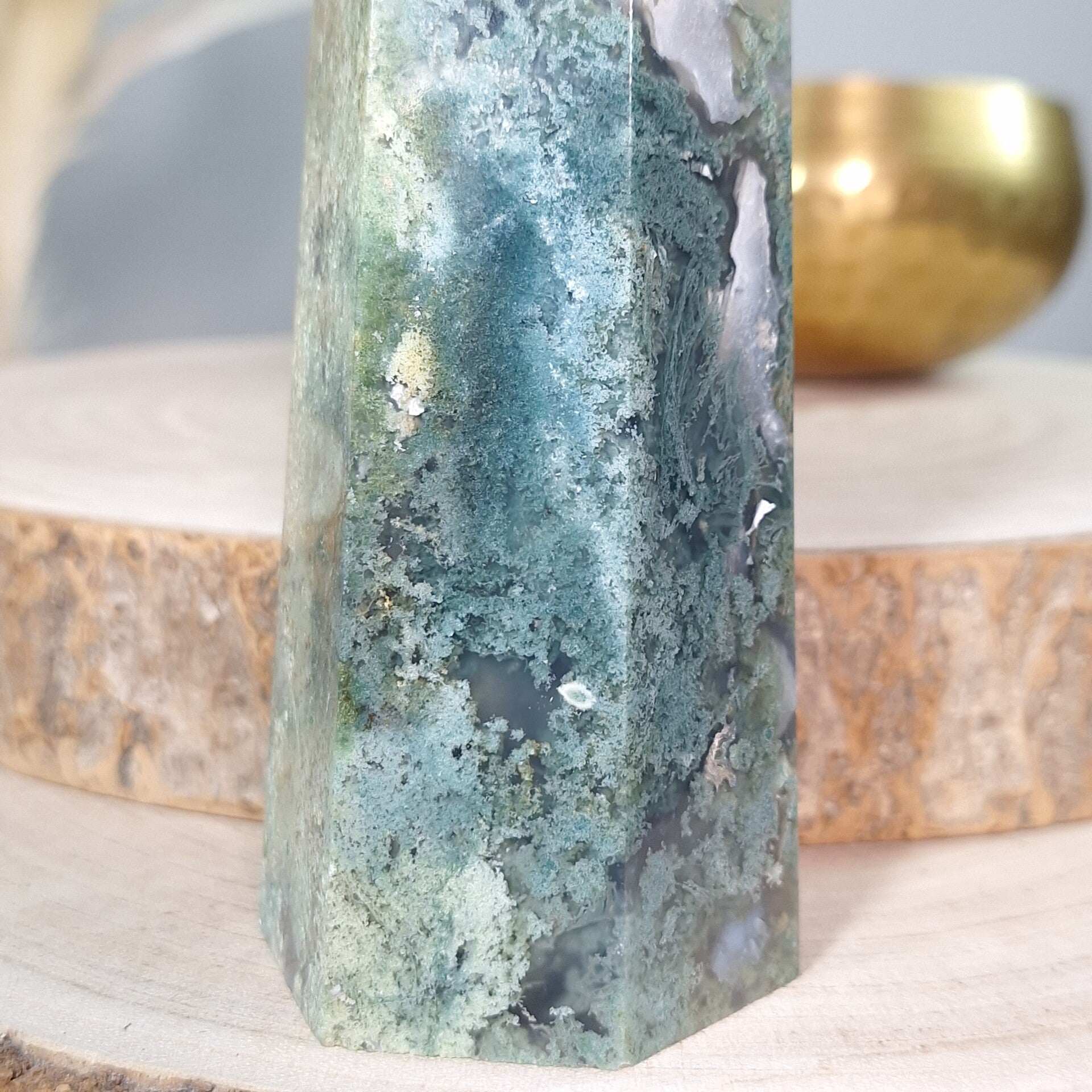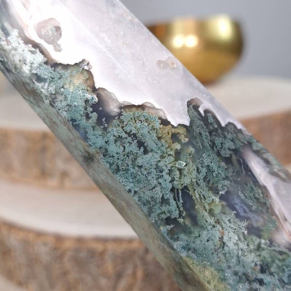 Mosagaat XL toren. Prachtige vormgeving, patronen en kwaliteit. 25,5 cm Fantastisch mooie grote elegante toren van Mosagaat met prachtige patronen. Je raakt niet uitgekeken op de mosachtige insluitsels, echt heerlijk om in weg te dromen. Zeer mooi als aanvulling op het interieur, thuis, op kantoor, praktijk salon of school voor meer sfeer, rust, harmonie en positieve energie.