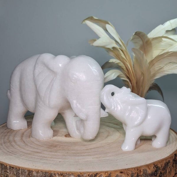 Fantastische mooie rustgevende witte "reus" met baby olifant. Een echte reus is deze prachtige olifant met bijna 3 kilo en 20cm. Samen zijn ze een ware eyecatcher voor het interieur. Voor o.a thuis, kantoor, praktijk en salon. Prachtige set van ouder en kind voor een zeer voordelige prijs.