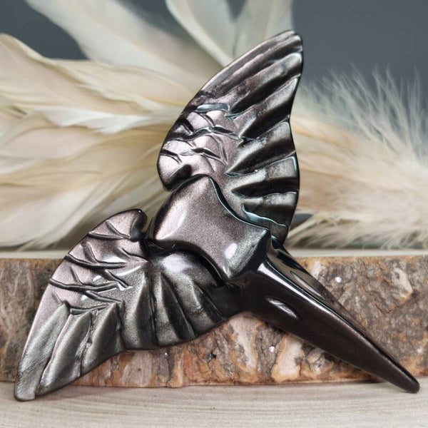 Prachtige Raven skull with wings met enorm veel "flash" prachtig exemplaar van enorm mooie kwaliteit Zilver Obsidiaan. 11,5 x 8,5cm Momenteel is er nep Goud en Zilver Obsidiaan in omloop, dit is (uiteraard) de natuurlijke variant.