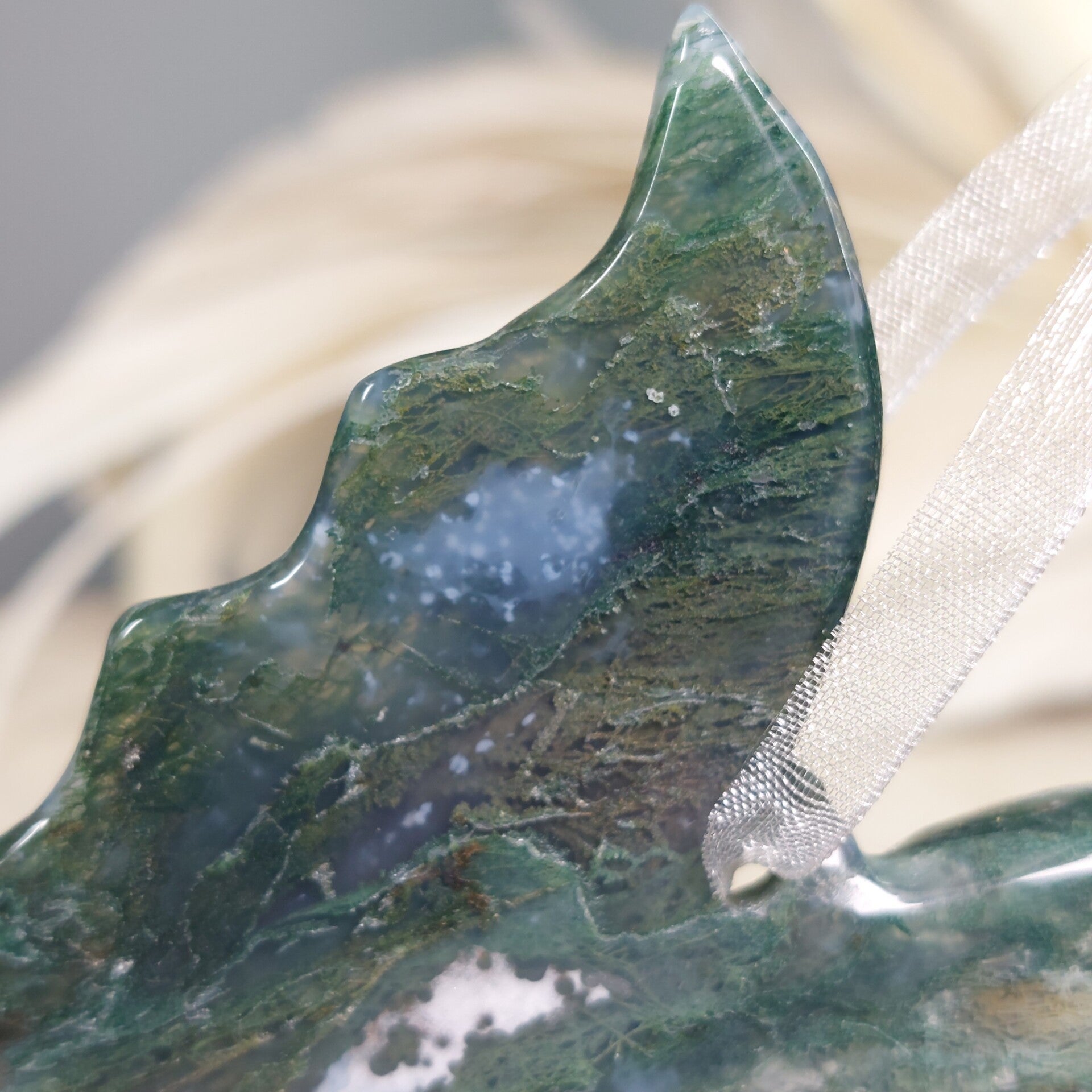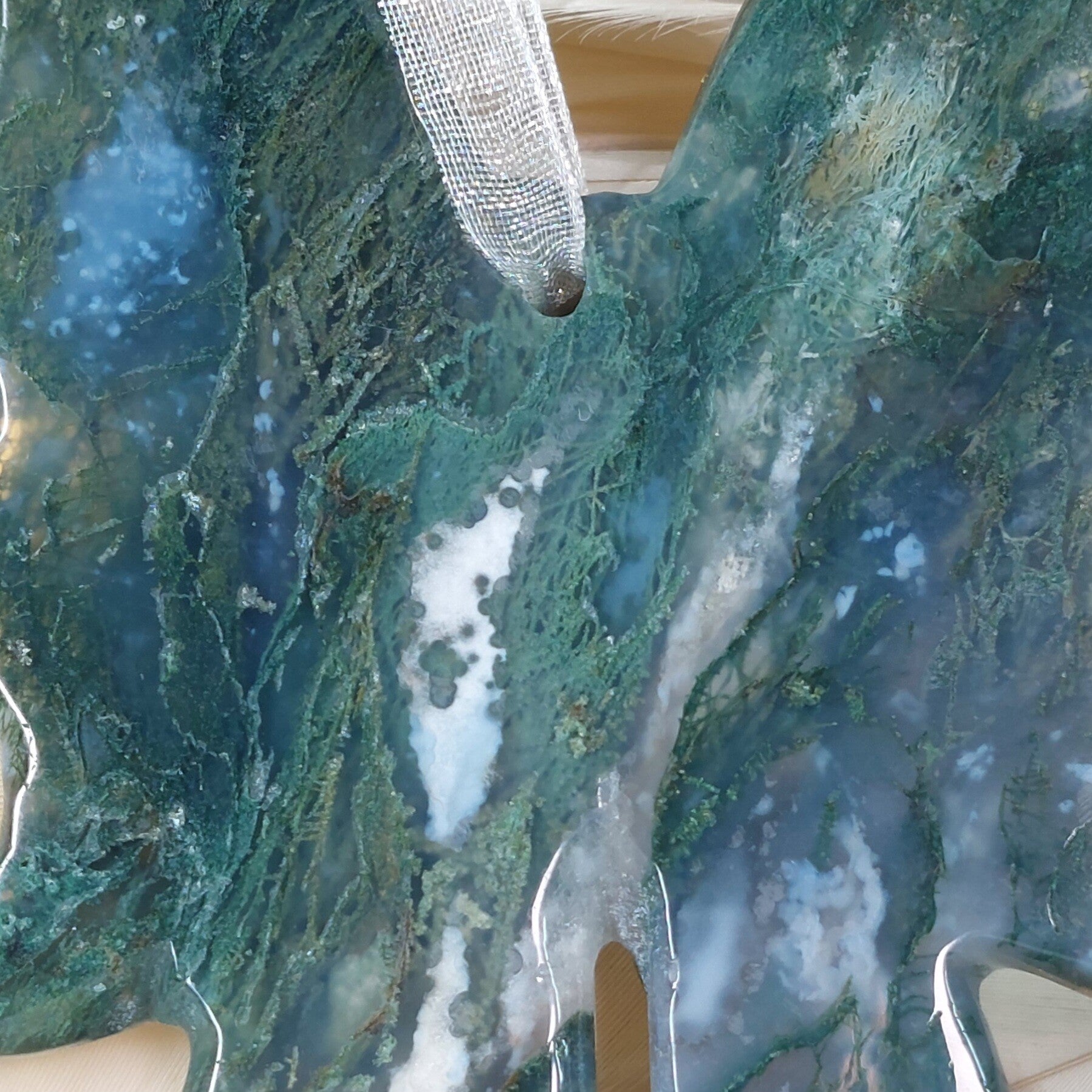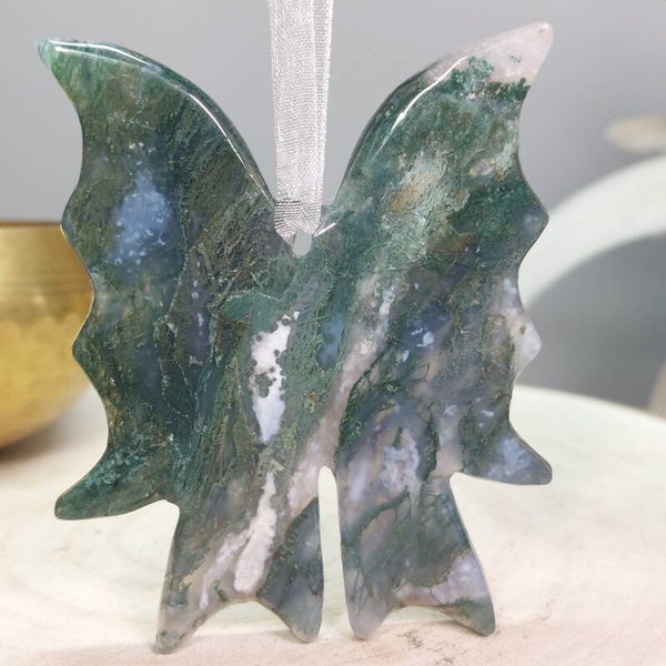 Prachtige Mosagaat vlinder met fantastische patronen. Wordt geleverd in cadeaudoosje. Door de opening bovenaan de vlinder is deze vlinder ook als hanger te gebruiken, voor o.a in de kerstboom, aan de muur, als raamdecoratie etc en als je van grote juwelen hangers houdt is deze zelfs ook als sieraad te gebruiken. Prachtige kwaliteit Mosagaat. Diagonaal is deze vlinder 9,5 cm en 8x6,5cm