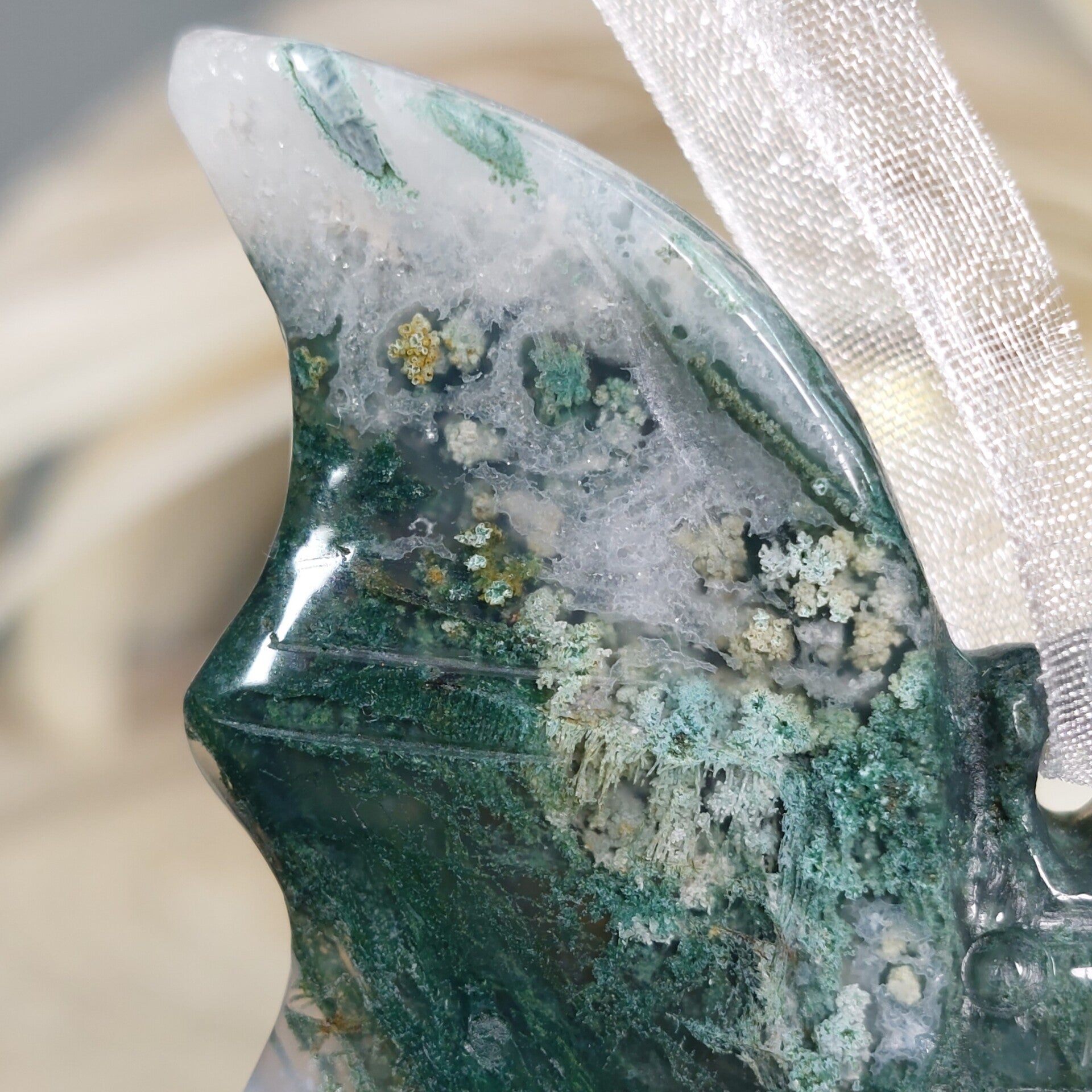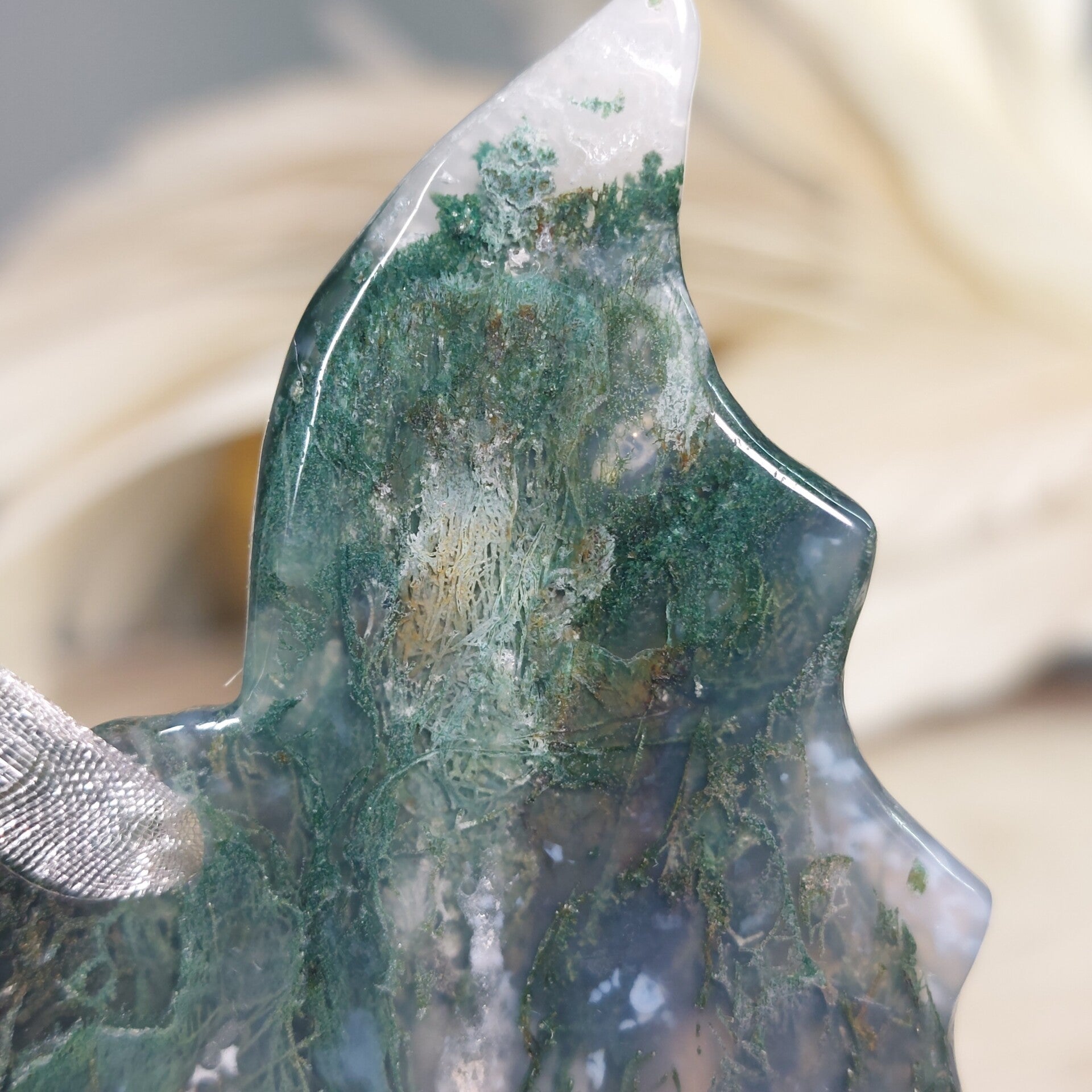 Mosagaat helpt je om zorgen los te laten en te ontspannen. Goed voor huid, haren en bevordert spijsvertering. Maakt actief en vitaal. Mosagaat geeft rust en helderheid, maakt bevalling makkelijker, positieve invloed op de ontwikkeling van de foetus, stimuleert wilskracht en werklust, zorgt voor meer uithoudingsvermogen, opent het hart voor universele liefde, geeft energie en helpt om beter te aarde. Mosagaat heeft een positieve werking op de weerstand, het immuunsysteem, hart en bloedvaten en de longen. De energieën zijn bescheiden maar heilzaam. Hij werkt stabiliserend en aardend. De energie van deze steen zorgt ervoor dat lichaam, geest en ziel naar hun natuurlijke evenwicht worden gebracht zodat je meer rust kunt ervaren op alle niveaus. Mos agaat helpt je te herstellen na ziekte en om weer tot jezelf te komen na een periode van emotionele onrust. Mosagaat werkt goed tegen angsten en stress. Helpt tegen straling. Mosagaat is heel goed voor mensen met schrik en angsten en fobieën of straatvrees, door het dragen krijg je meer eigenwaarde en gevoel van onaantastbaarheid, hij helpt je om overal weer de schoonheid van in te zien. Deze steen is zeer goed voor alle mensen die met planten en gewassen werken.Het is een steen voor een nieuw begin en helpt bij het opheffen van blokkades. Bij een scheiding, overlijden of intens verdriet geeft de mosagaat een steuntje in de rug, hij helpt je ook bij het afscheid nemen van het verleden en geeft rust in lichaam en geest. Mosagaat is een steen van rijkdom en trekt overvloed aan.Hij helpt ook mensen die erg in hun hoofd zitten bij hun gevoel te komen. De steen helpt om met andere mensen om te gaan en deze ruimte tot groei te geven. Geestelijk bevordert hij zelfexpressie en communicatie. Deze optimistische steen is zeer behulpzaam voor mensen die depressief zijn vanwege hun levensomstandigheden of door een onbalans in de hersenen, hij geeft dan inzicht in de achterliggende oorzaken. Mosagaat is goed bij ongemakken aan de neus_ en keelholten, ook zorgt hij voor het beter oplossen van slijm, ontkrampt de maag, darmen en blaas. Ook goed voor de seksuele organen en maakt ze gelijktijdig actief. De steen gaat ontstekingen tegen, reinigt de bloedsomloop en versterkt het immuunsysteem. Goed voor het lymfesysteem en als elixer op de huid aangebracht behandelt Mosagaat schimmelinfecties en andere huidinfecties.