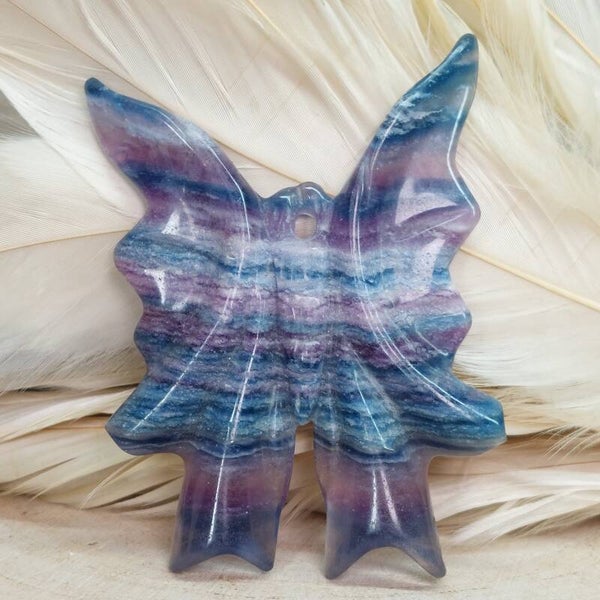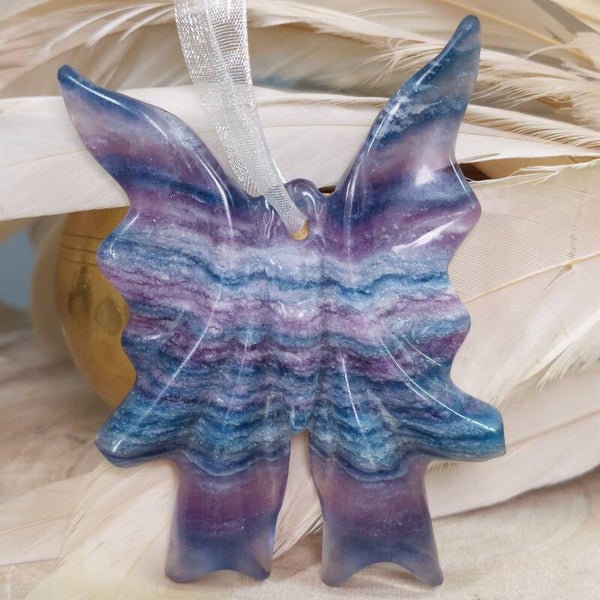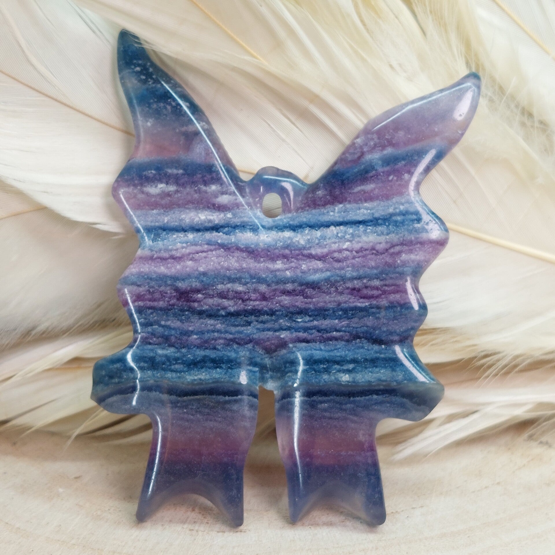 Prachtige vlinder van Fluoriet met zeer mooie kleuren en patronen. Wordt geleverd in cadeau doosje. De vlinder heeft een opening aan de bovenkant waardoor er gemakkelijk een hanger van gemaakt kan worden, ook voor de liefhebbers van grote juwelen kan deze vlinder ook ontpoppen als een prachtige hanger voor om je nek vlinder is diagonaal 8,8 en 7,5x5,5cm