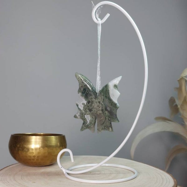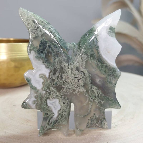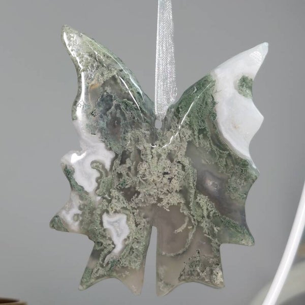 Prachtige Mosagaat vlinder met fantastische patronen. Wordt geleverd in cadeaudoosje. Door de opening bovenaan de vlinder is deze vlinder ook als hanger te gebruiken, voor o.a in de kerstboom, aan de muur, als raamdecoratie etc en als je van grote juwelen hangers houdt is deze zelfs ook als sieraad te gebruiken. Prachtige kwaliteit Mosagaat. Diagonaal is deze vlinder 9,5cm en 8x6,5cm