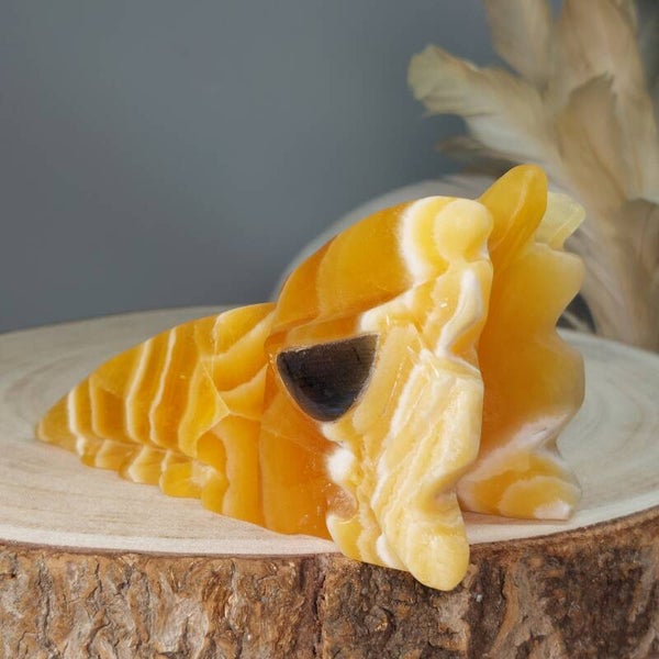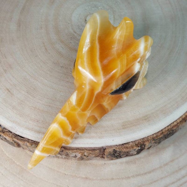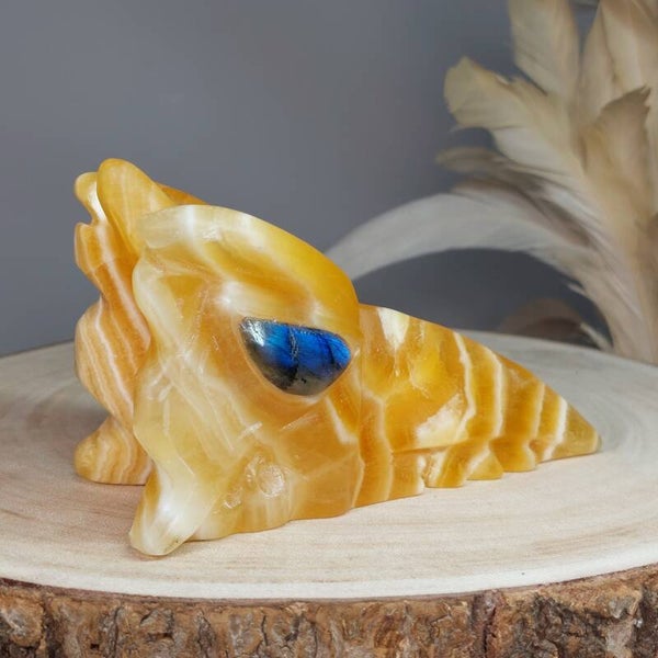Fantastisch mooie grote handgeslepen Feniks, gemaakt van prachtige kwaliteit gele Calciet en ogen van "magisch" mooie Labradoriet. Prachtige combinatie wat o.a staat voor positieve energie en bescherming.