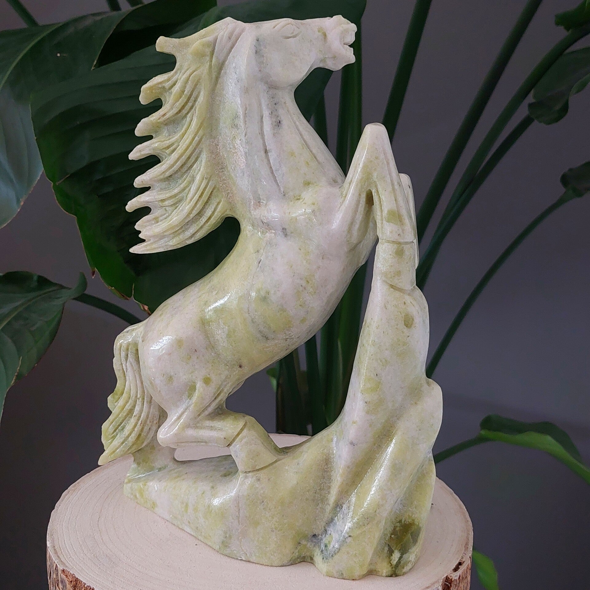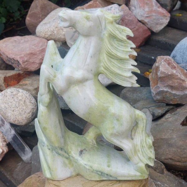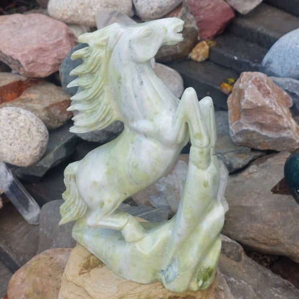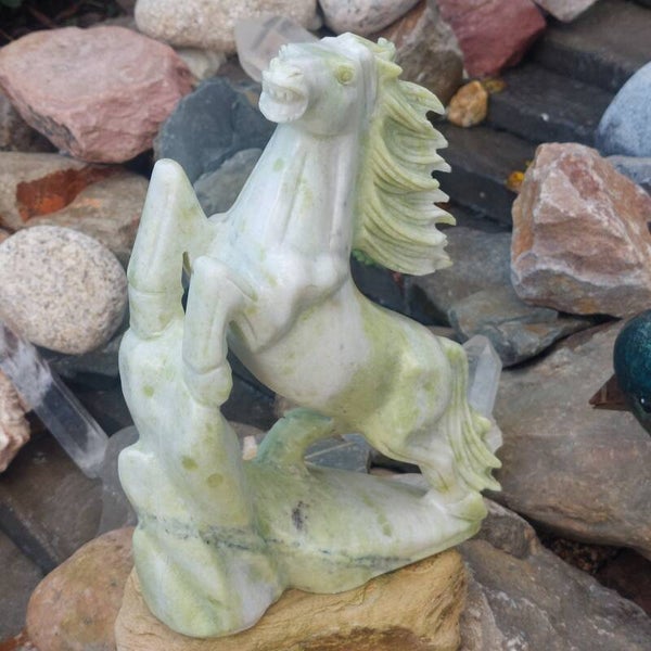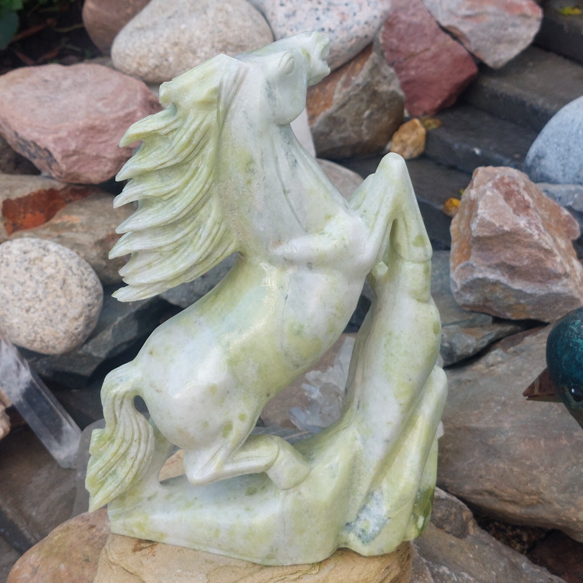 voor aarde-healers en magiërs die helpen bij het transformatieproces van onze aarde. Witte jade is de edelsteen van emotionele healing. De steen geeft nieuwe hoop en vertrouwen, en helpt om oud zeer en blokkades los te laten Witte Jade zorgt ervoor dat de energetische koorden die tussen jou en andere personen zijn ontstaan, worden gereinigd en waar nodig worden losgemaakt, zodat je vrijwel direct terug komt te staan in jouw eigen kracht. Het helpt je om de gezondere keuzes voor jezelf te maken, zonder teveel te piekeren. Witte Jade zorgt voor een optimale energetische doorstroming van de kosmos, door de kruinchakra, langs de ruggengraat de aarde in. Een perfecte reinigende werking waar je heerlijk rustig van kunt worden in tijden van stress. Aangezien Jade wat vettig/mat aanvoelt en deze witte variant meer gevoelig is om vies te worden door o.a stof is er een dun laklaagje over het paard gespoten zodat stof er makkelijk afgepoetst kan worden en het paard wat glans krijgt