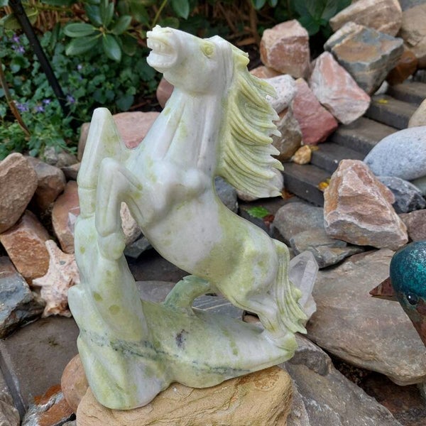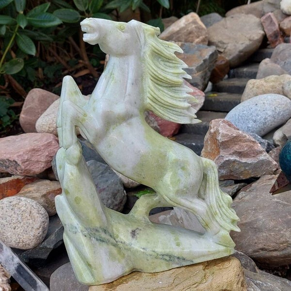 Fantastisch mooi, zeer groot paard van 3,7 kilo en 27 cm hoog. Gemaakt van Chinese Lantin Jade (witte Jade met Serpentijn). Een beeld waar je niet omheen kunt vanwege de prachtige vormgeving, formaat en fijne energie. Ook heel geschikt om als boekensteun te gebruiken. Je krijgt het paard wat alleen op de foto staat. Hij staat ook op de foto met zijn tweetjes maar je krijgt het prachtige exemplaar waar deze alleen op staat zodat je weet welke je gaat bestellen.