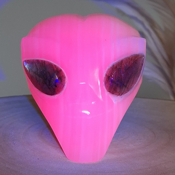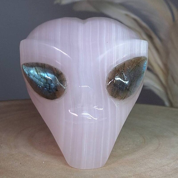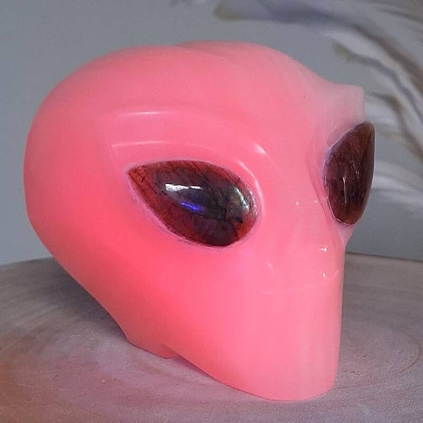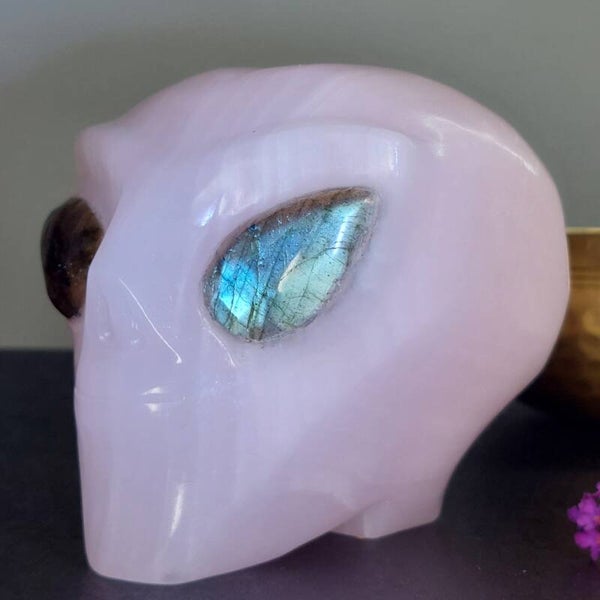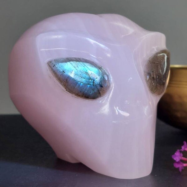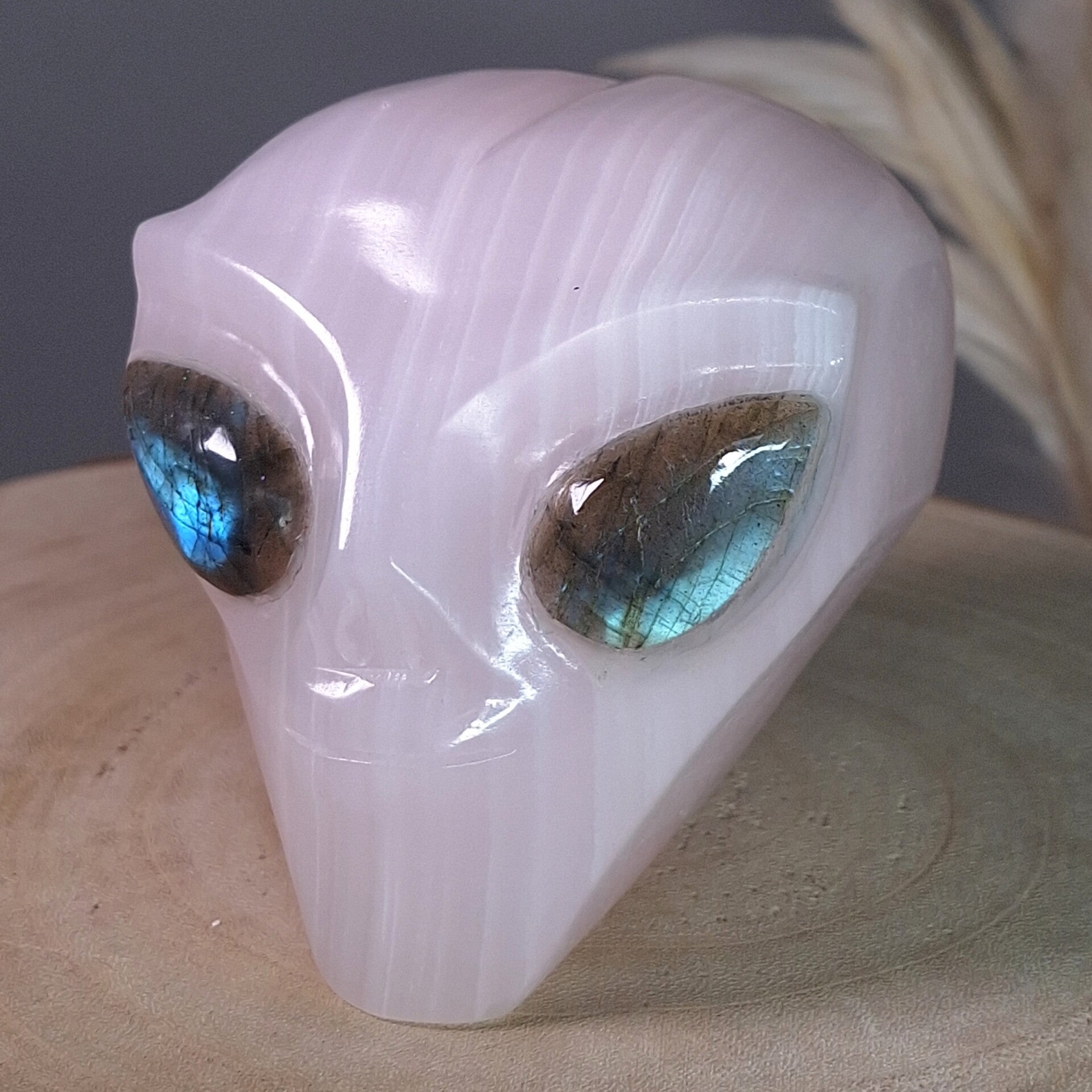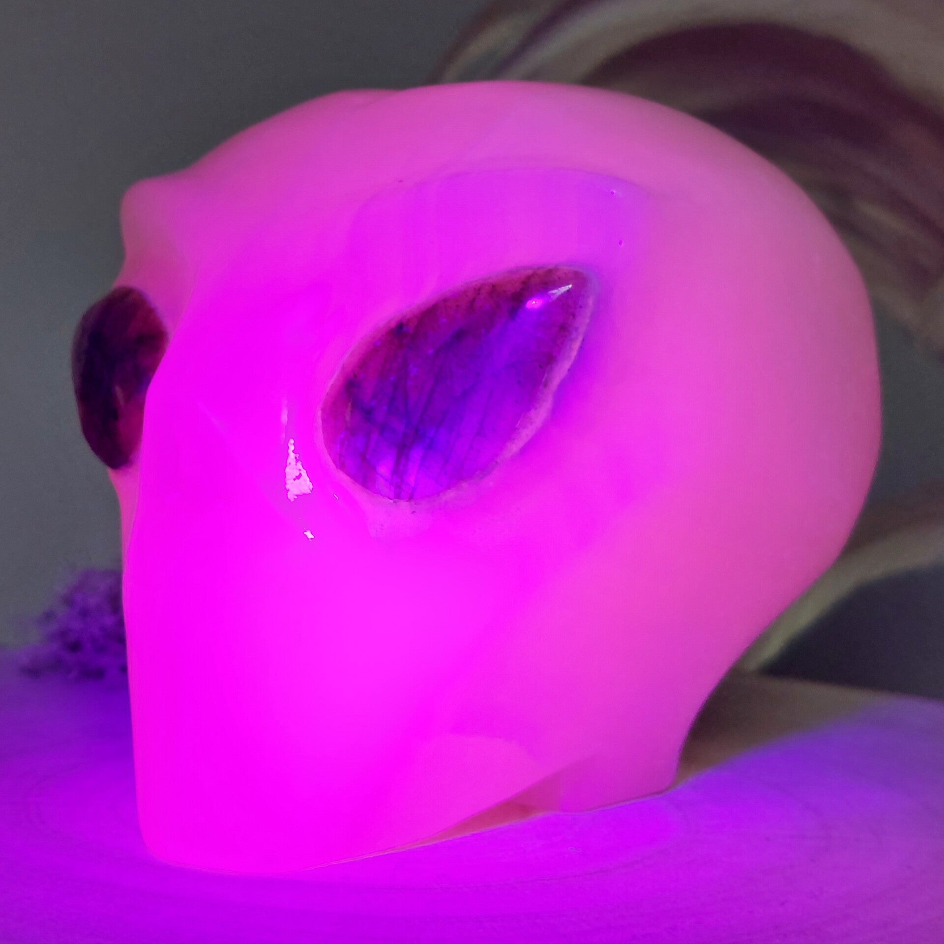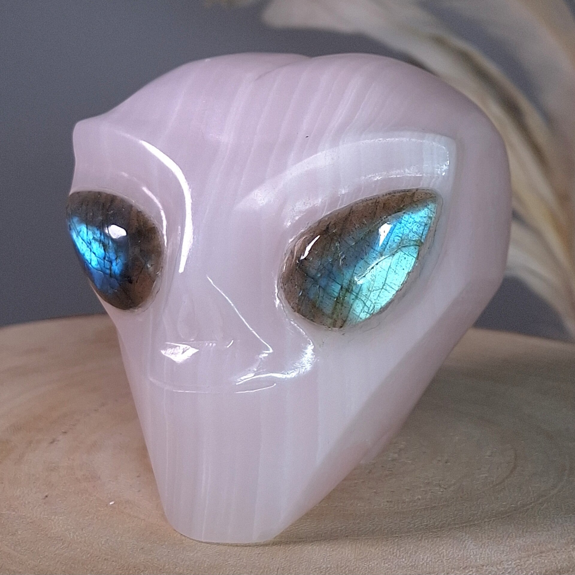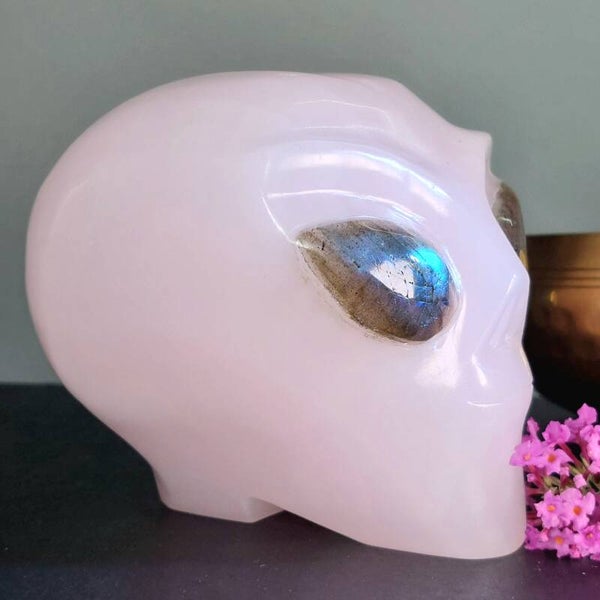 Mangano Calciet Alien / Star Being skull met Labradoriet ogen van bijna 1 kg.