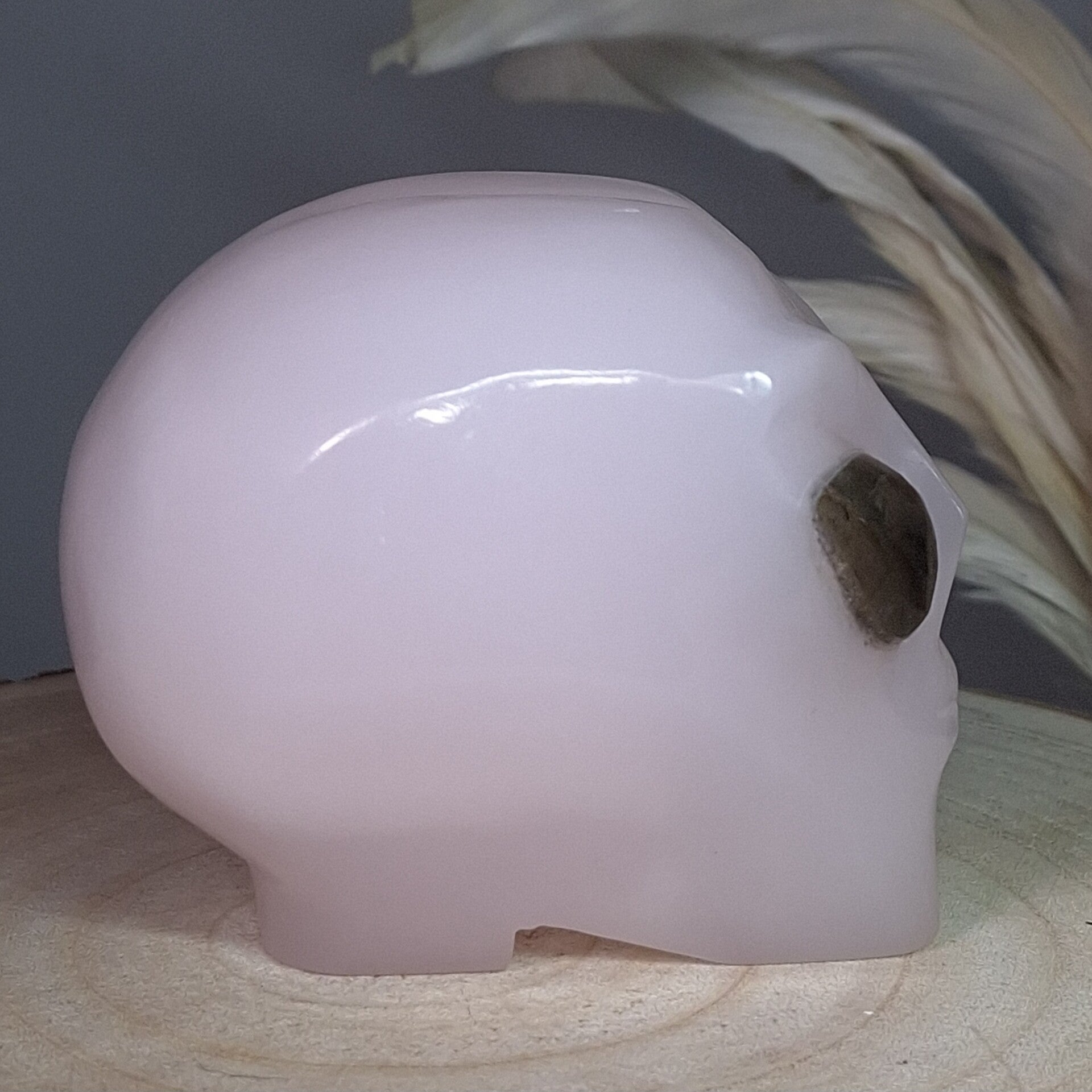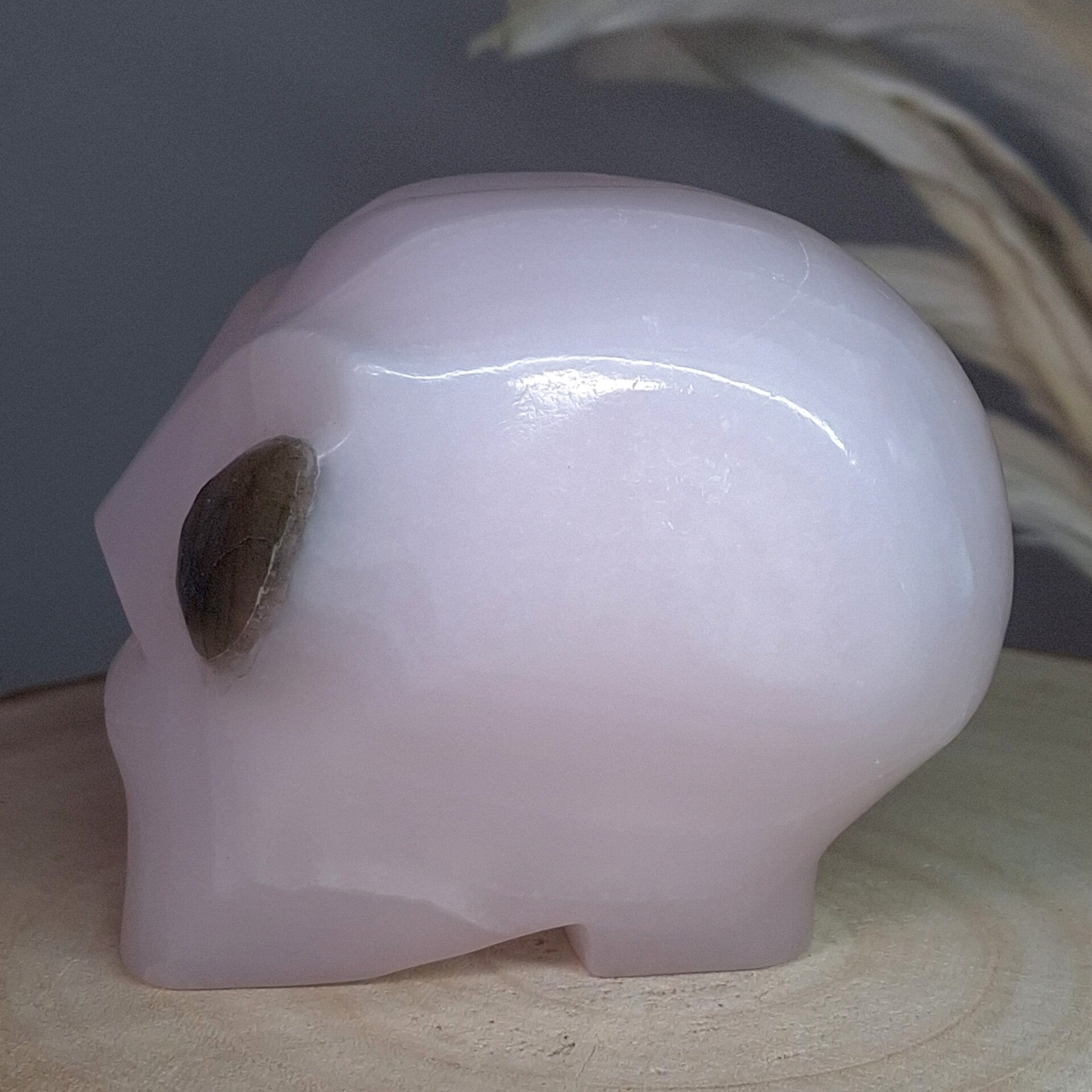Mangano Calciet Alien skull van top kwaliteit en met prachtige ogen van Labradoriet. De Skull heeft een mooi groot formaat van 10,7 cm en 900 gram.