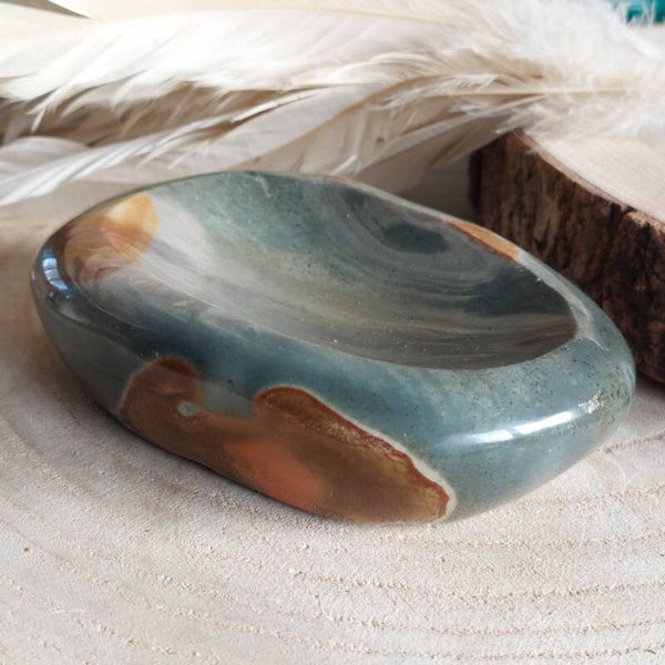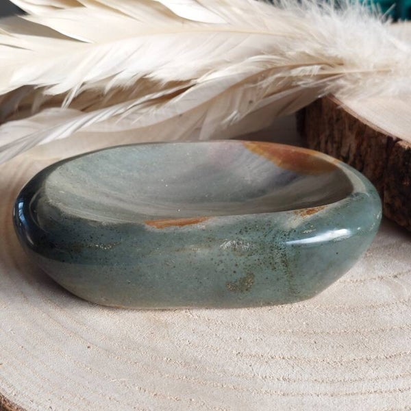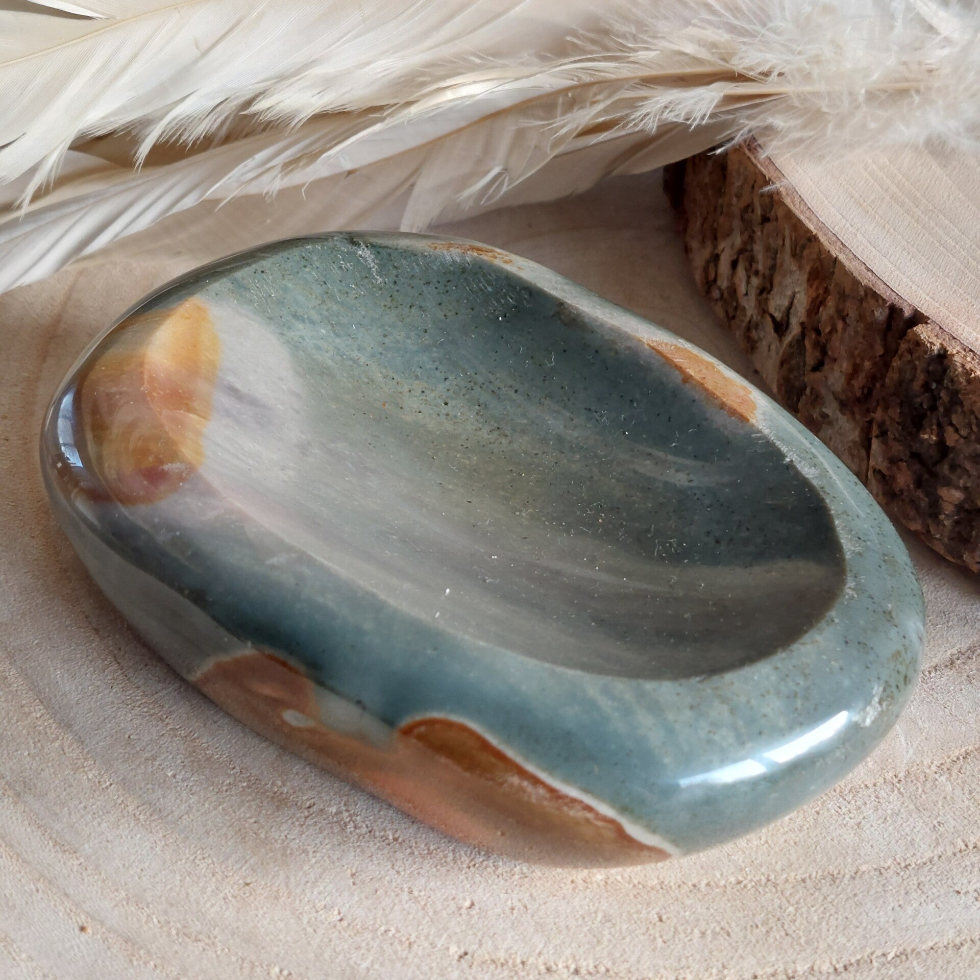 Prachtige Polychroom Jaspis schaal van 470 gram en c.a 12x8,5cm. Ideaal voor gebruik tijdens smudgen om as in op te vangen maar ook als bakje voor bijvoorberld zeep, sleutels, sieraden etc.