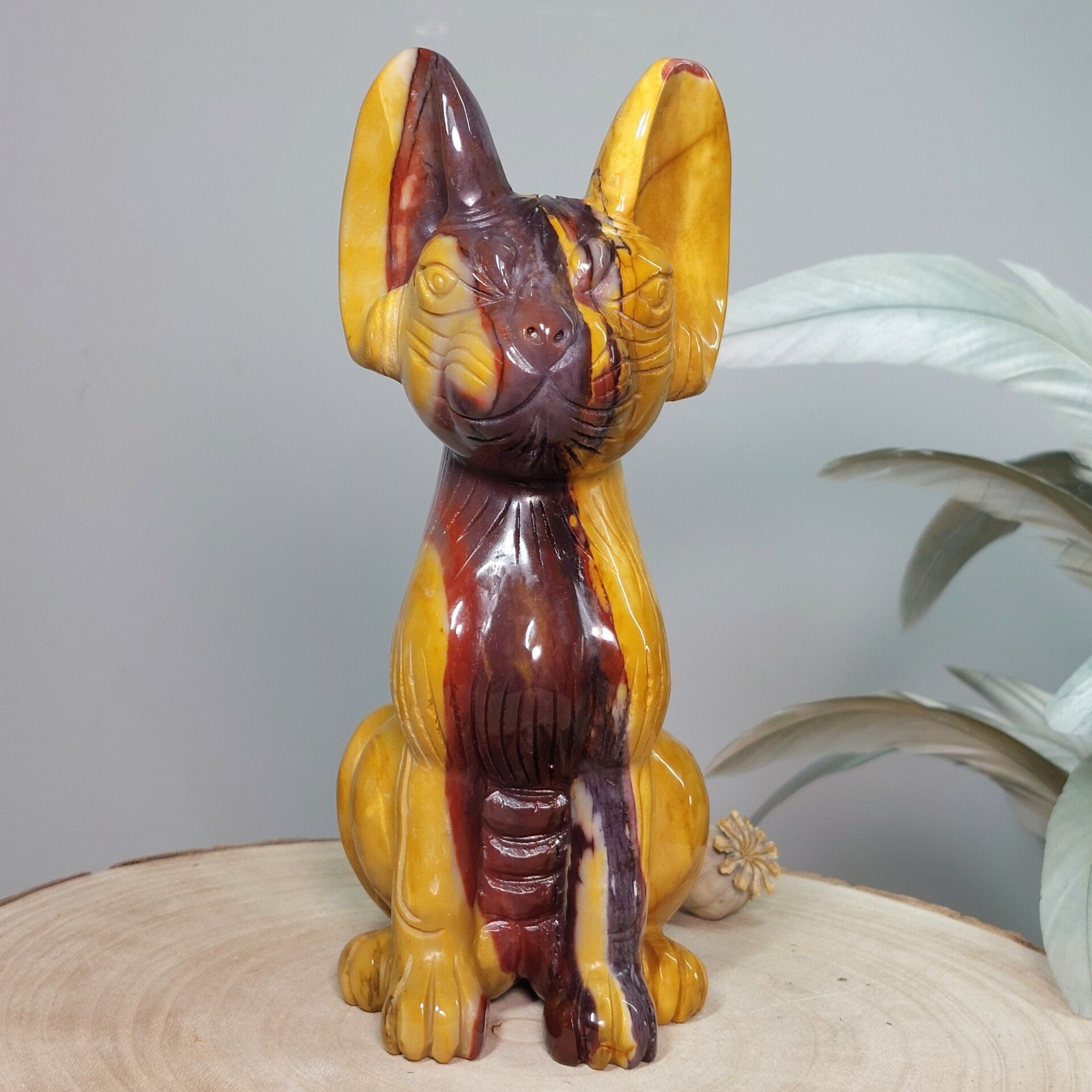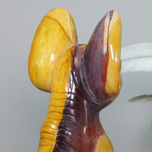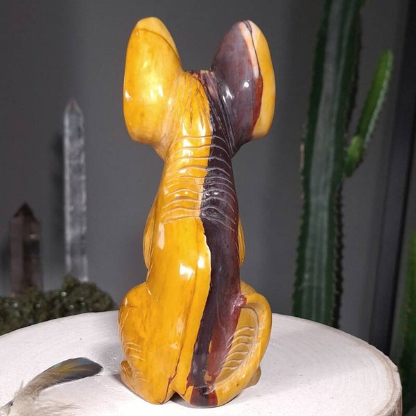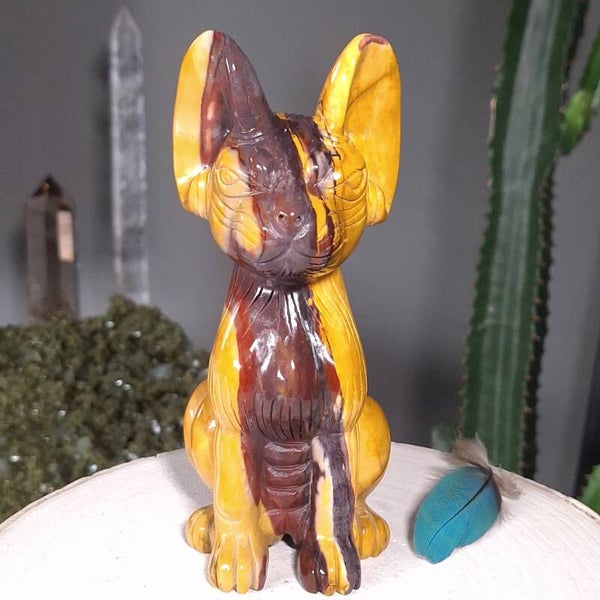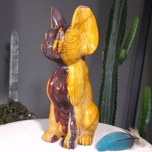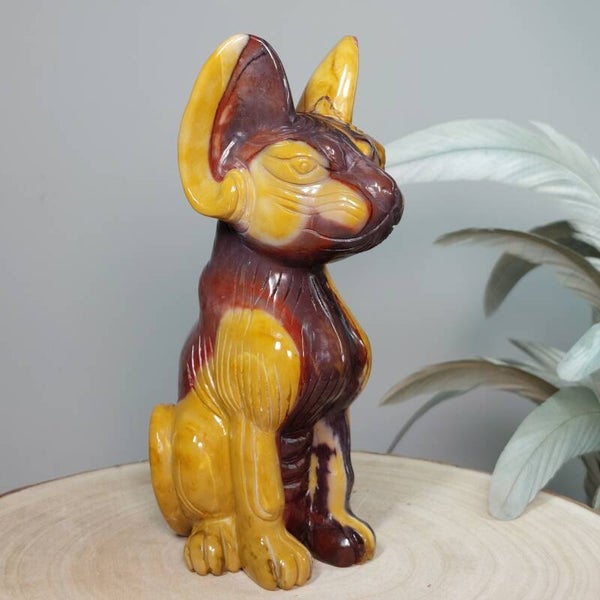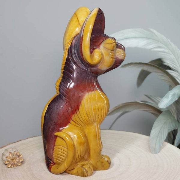 Uniek en magisch mooie handgeslepen Mookaiet Sphynx kat uit Madagaskar. Wat een plaatje is deze kat ♡ In het écht nog veel mooier dan op de foto's. Het lijkt alsof de kat is geschilderd door een kunstenaar, zo mooi zijn de kleuren en patronen maar uiteraard is dit niet het geval. De kleuren zijn puur natuur. Zeer bijzondere creatie van moeder aarde uit Australië. De Sphynx is van groot formaat van 18,5cm (van bovenkant oor tot onderkant staart gemeten) en 920 gram. Ik ben benieuwd bij wie deze bijzondere Sphynx mag gaan wonen. Blijft deze schoonheid door jouw gedachten gaan en ben je op slag verliefd dan is het de investering in jezelf zeker waard. Een "soul mate" voor het leven♡