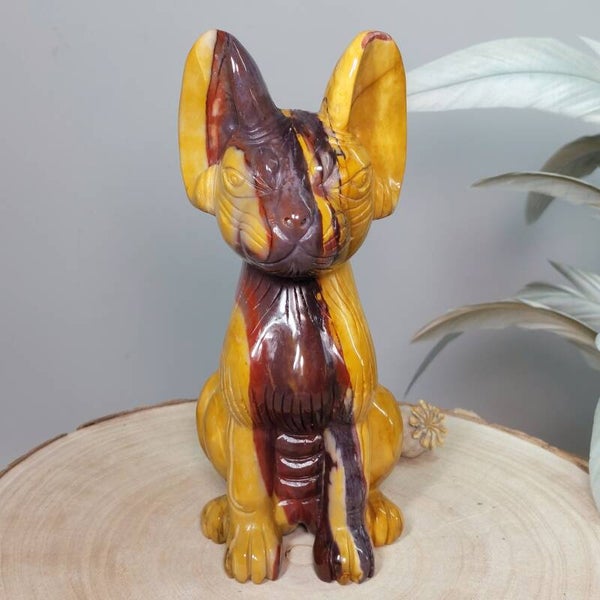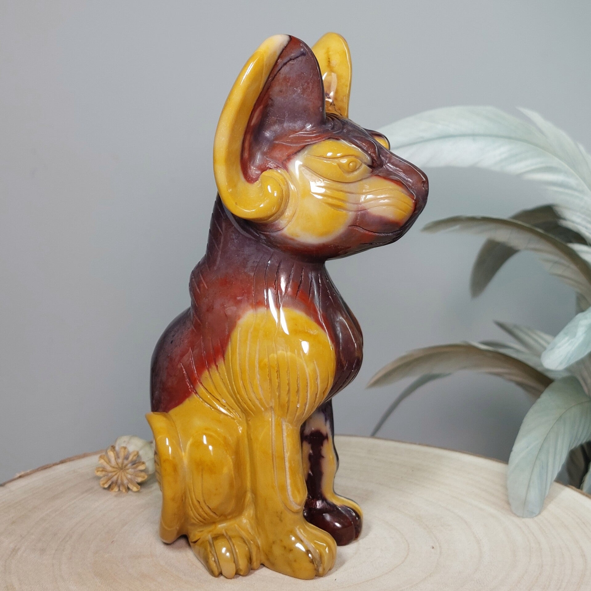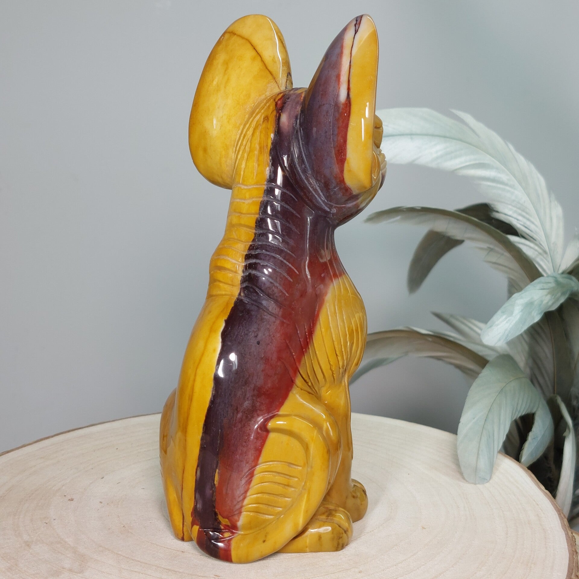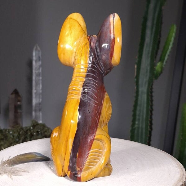 Uniek en magisch mooie handgeslepen Mookaiet Sphynx kat uit Madagaskar. Wat een plaatje is deze kat ♡ In het écht nog veel mooier dan op de foto's. Het lijkt alsof de kat is geschilderd door een kunstenaar, zo mooi zijn de kleuren en patronen maar uiteraard is dit niet het geval. De kleuren zijn puur natuur. Zeer bijzondere creatie van moeder aarde uit Australië. De Sphynx is van groot formaat van 18,5cm (van bovenkant oor tot onderkant staart gemeten) en 920 gram. Ik ben benieuwd bij wie deze bijzondere Sphynx mag gaan wonen. Blijft deze schoonheid door jouw gedachten gaan en ben je op slag verliefd dan is het de investering in jezelf zeker waard. Een "soul mate" voor het leven♡