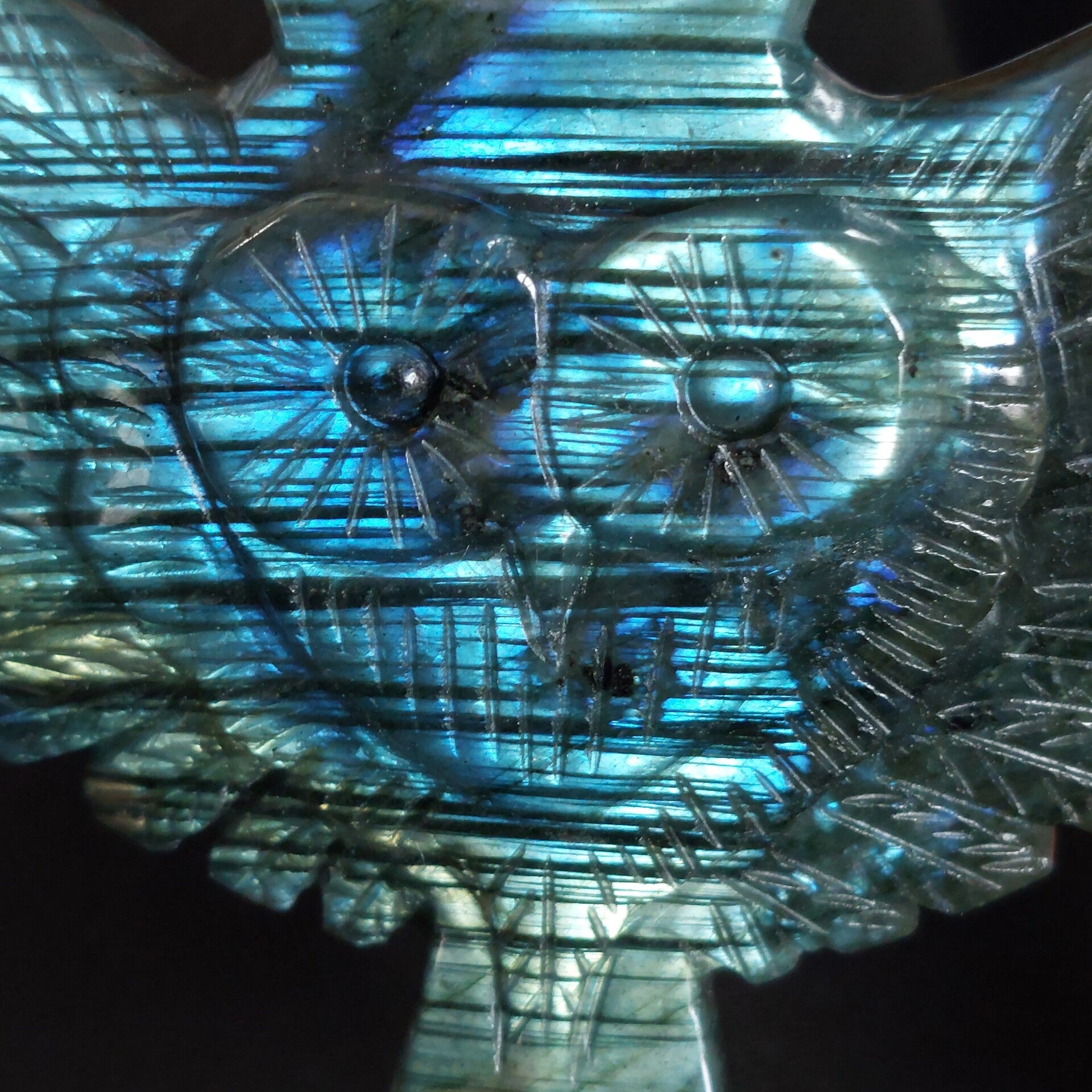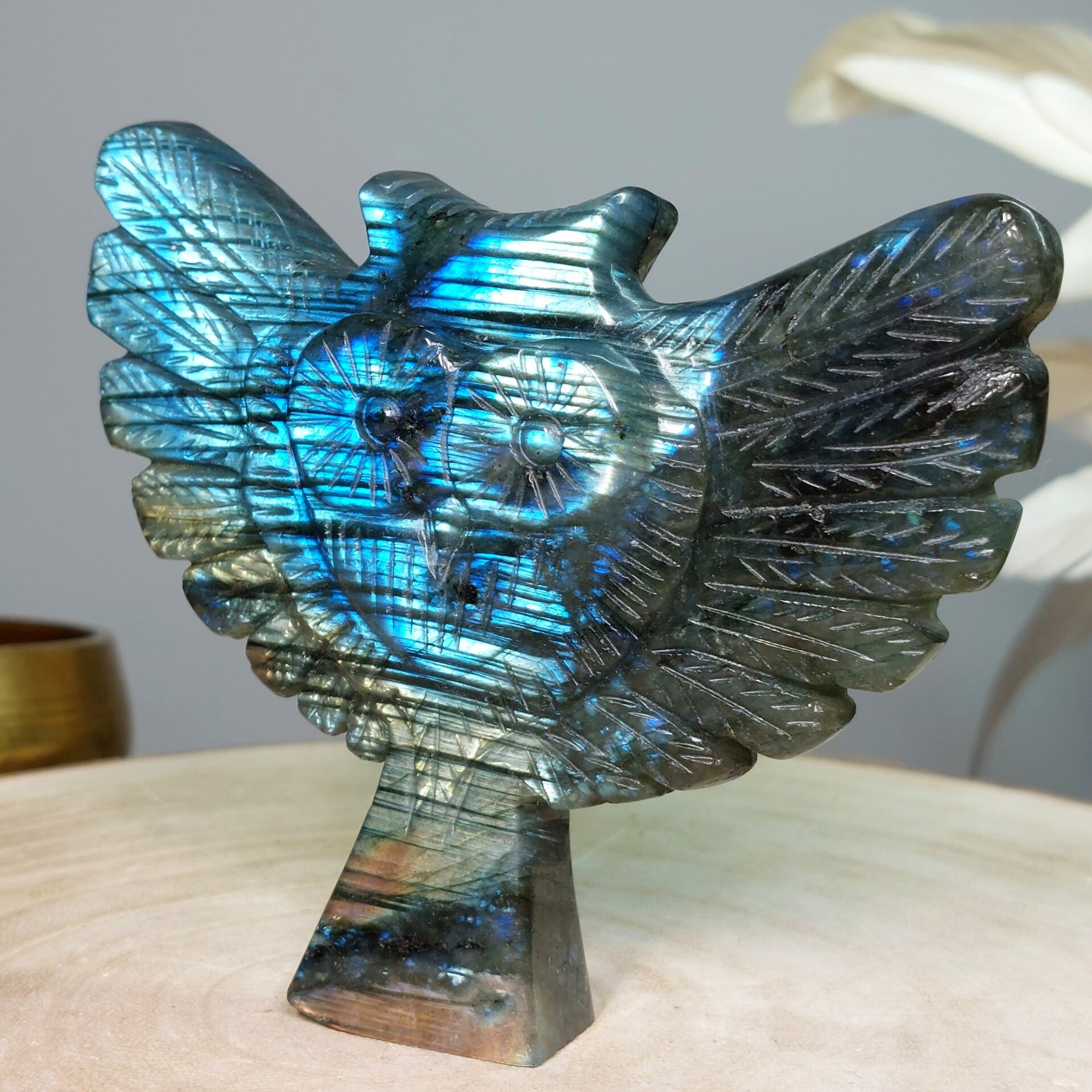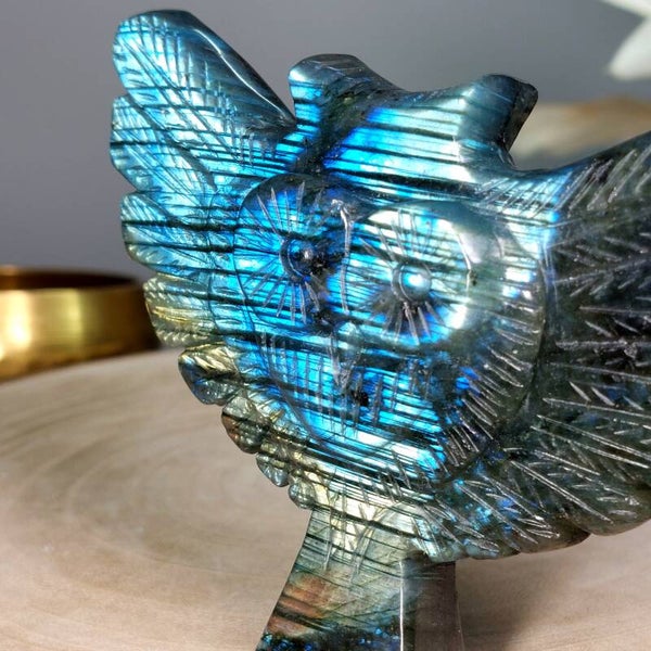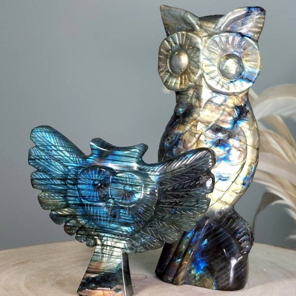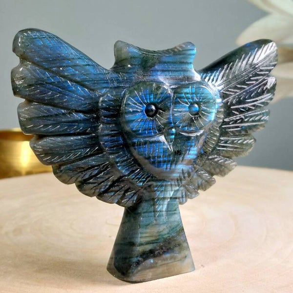 Prachtige Labradoriet uil van10,5 cm. Prachtige kwaliteit met vooral blauwe "flash". Het leuke aan deze uil is ook de vormgeving omdat het hoofd van de uil de vorm van een hart heeft.