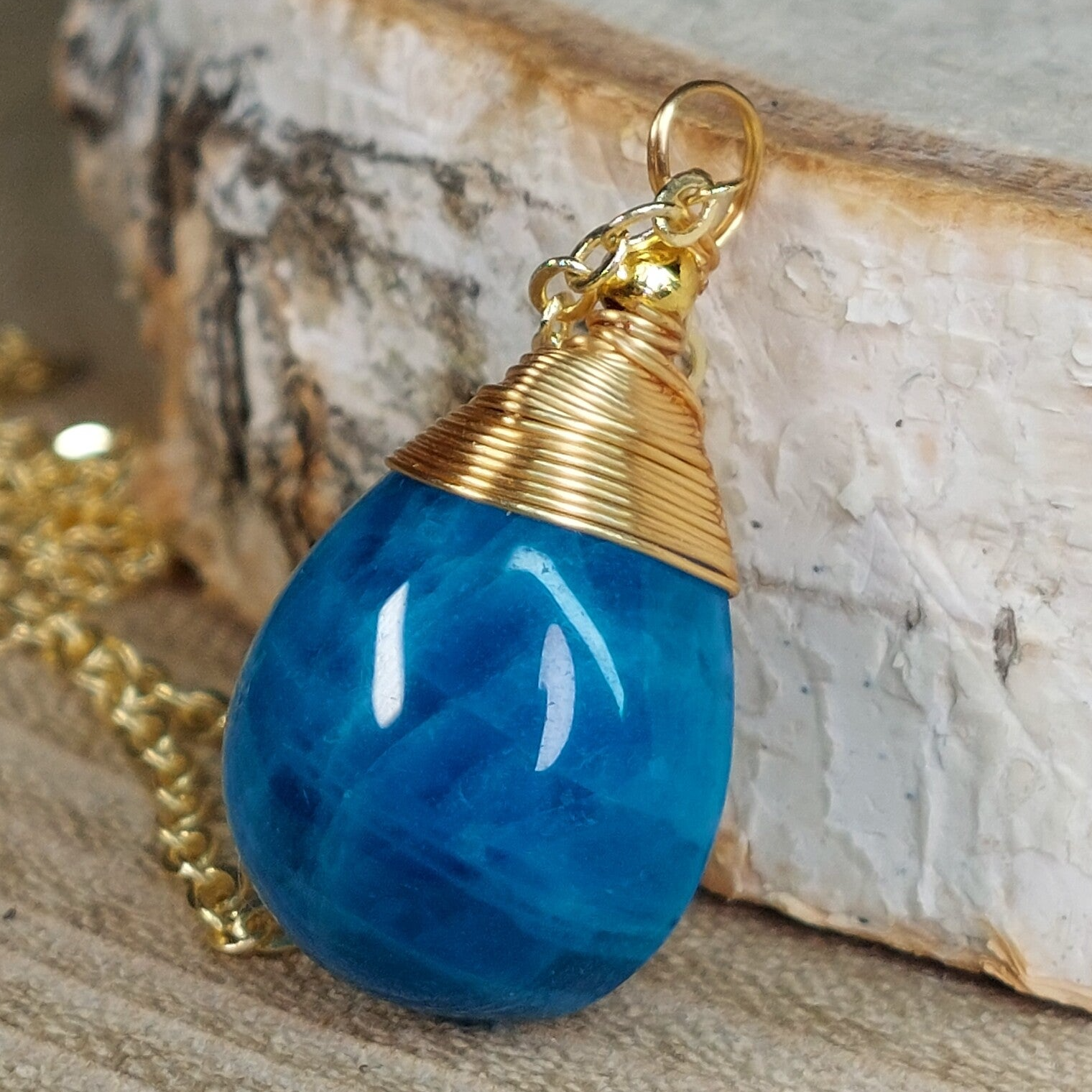 Prachtige hanger van Blauwe Apatiet van 2,3cm. Afwerking van de hanger en ketting is in verguld goud. Wordt geleverd inclusief ketting zoals afgebeeld op de foto.