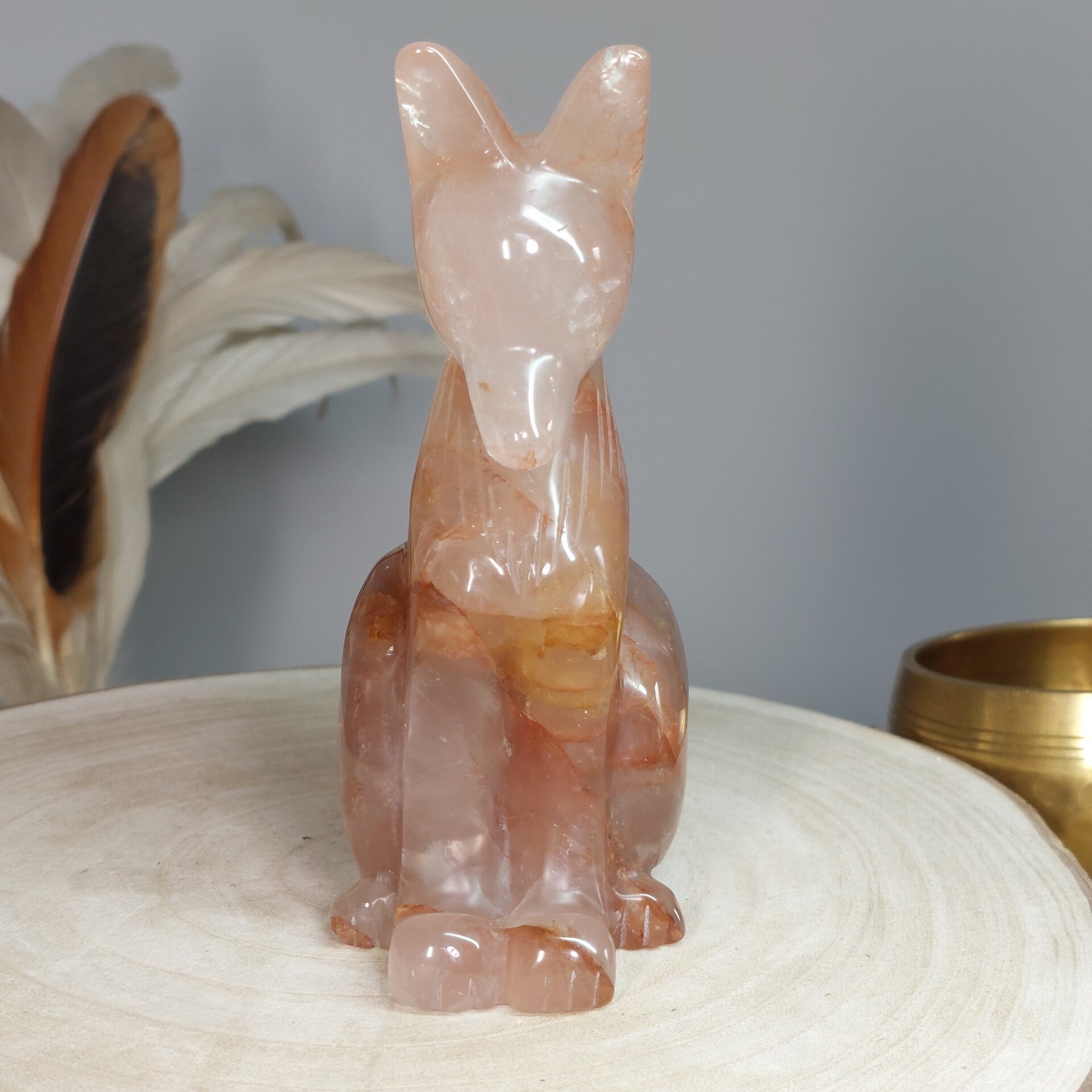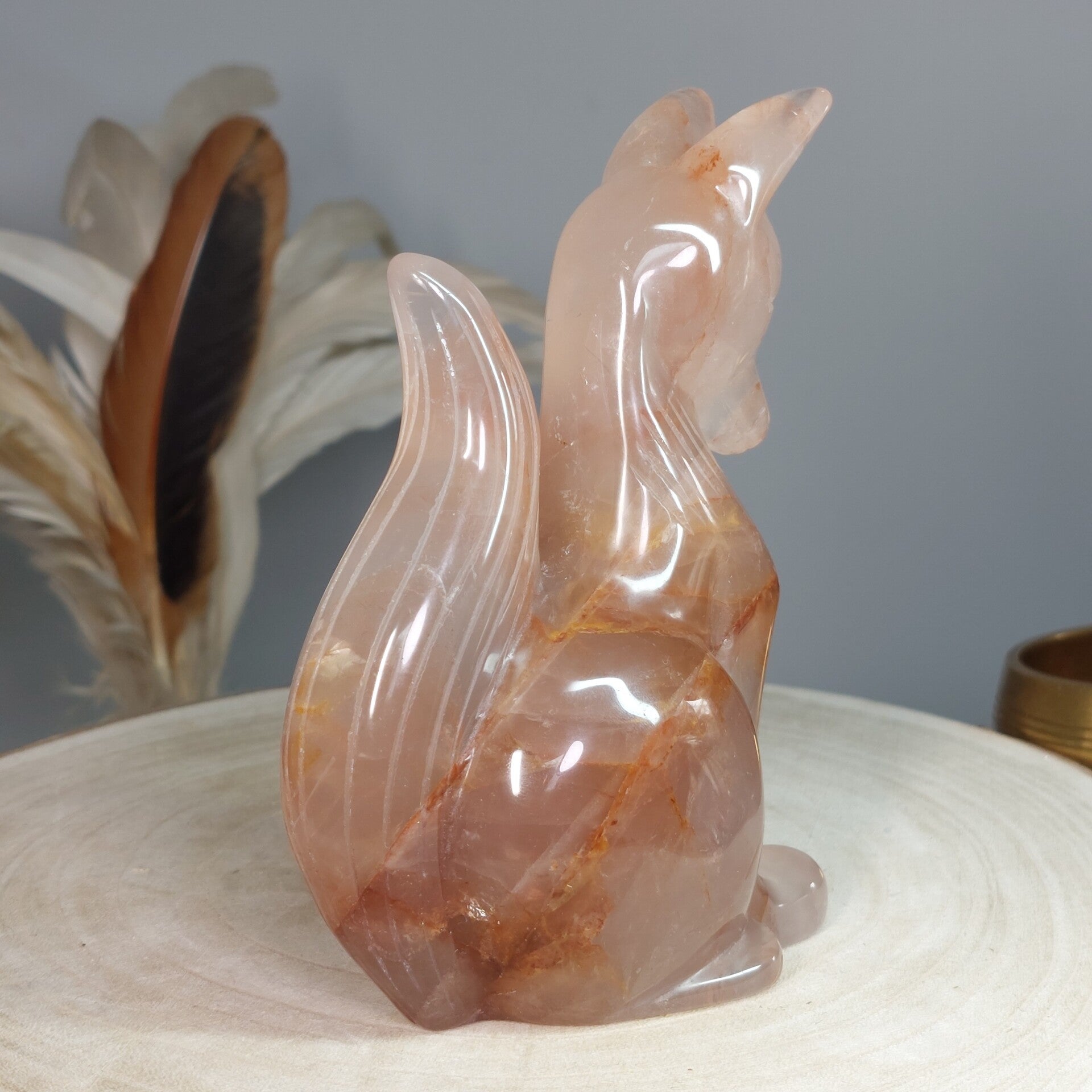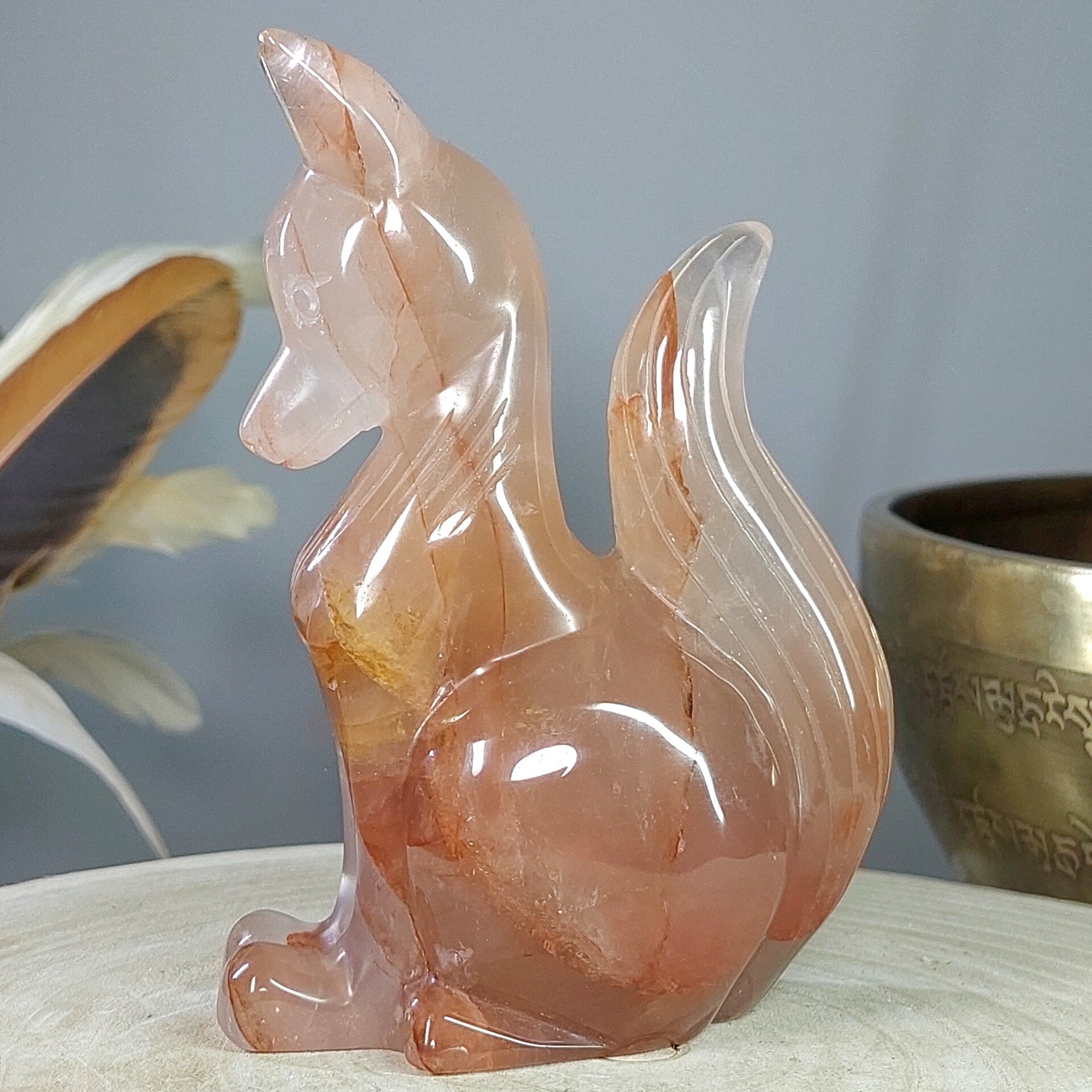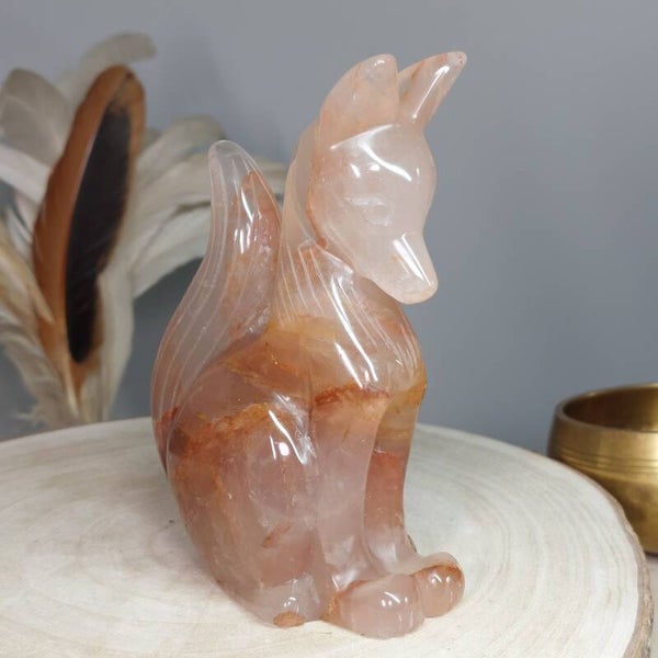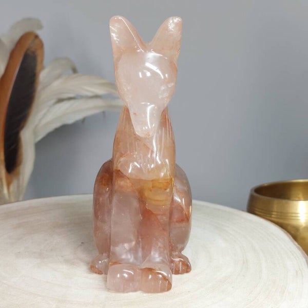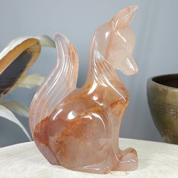 Hematietkwarts is een zeer goed aardend kristal. Het kalmeert je geest, waardoor je de tijd hebt om dingen goed te verwerken en op te lossen. Het is een kristal dat de onevenwichtigheden en negativiteiten in je leven oplost en je laat genieten van een meer gebalanceerde energie. Het inspireert tot creatief en origineel denken, en het verhoogt de focus en concentratie. Hematietkwarts helpt je ook om eenvoudige maar effectieve manieren te vinden om je problemen op te lossen. Het is een ideale steen voor wie regelmatig met complexe onderwerpen en technische zaken te maken heeft. Het verbetert ook de wilskracht en verhoogt het gevoel van eigenwaarde, eigenwaarde en zelfvertrouwen. Het stimuleert het verlangen naar vrede en oprecht geluk. Het helpt je te beseffen dat je kunt leren van je fouten uit het verleden en dat je er niet door moet worden gedefinieerd of verlamd. Bergkristal met Hematiet dat afkomstig is van Lemurisch kristal wordt ook wel Maria Magdalena kristal genoemd. Deze Bergkristal bevat vaak zwemen van hematiet, zoals bij deze prachtige vos goed zichtbaar is. Hierdoor is het prachtige Bergkristal met Hematiet verbonden met de roze/oranje straal die in verbinding staat met de lijn van de Godinnen zoals Guanyin /Quan Yin, Maria en Isis. Deze kristallen staan erom bekend dat ze je kunnen verbinden met de Goddelijke vrouwelijke energie♡ Of deze vos daadwerkelijk van Lemurisch kristal afkomstig is kan ik helaas niet bewijzen omdat de kenmerkende streepjes van Lrmurisch kristal niet zichtbaar zullen zijn doordat de vos is glad gemaakt. Wel voel ik zelf de liefdevolle, vrouwelijke energie bij deze mooie vos wat zo kenmerkend is voor dit soort kristal.