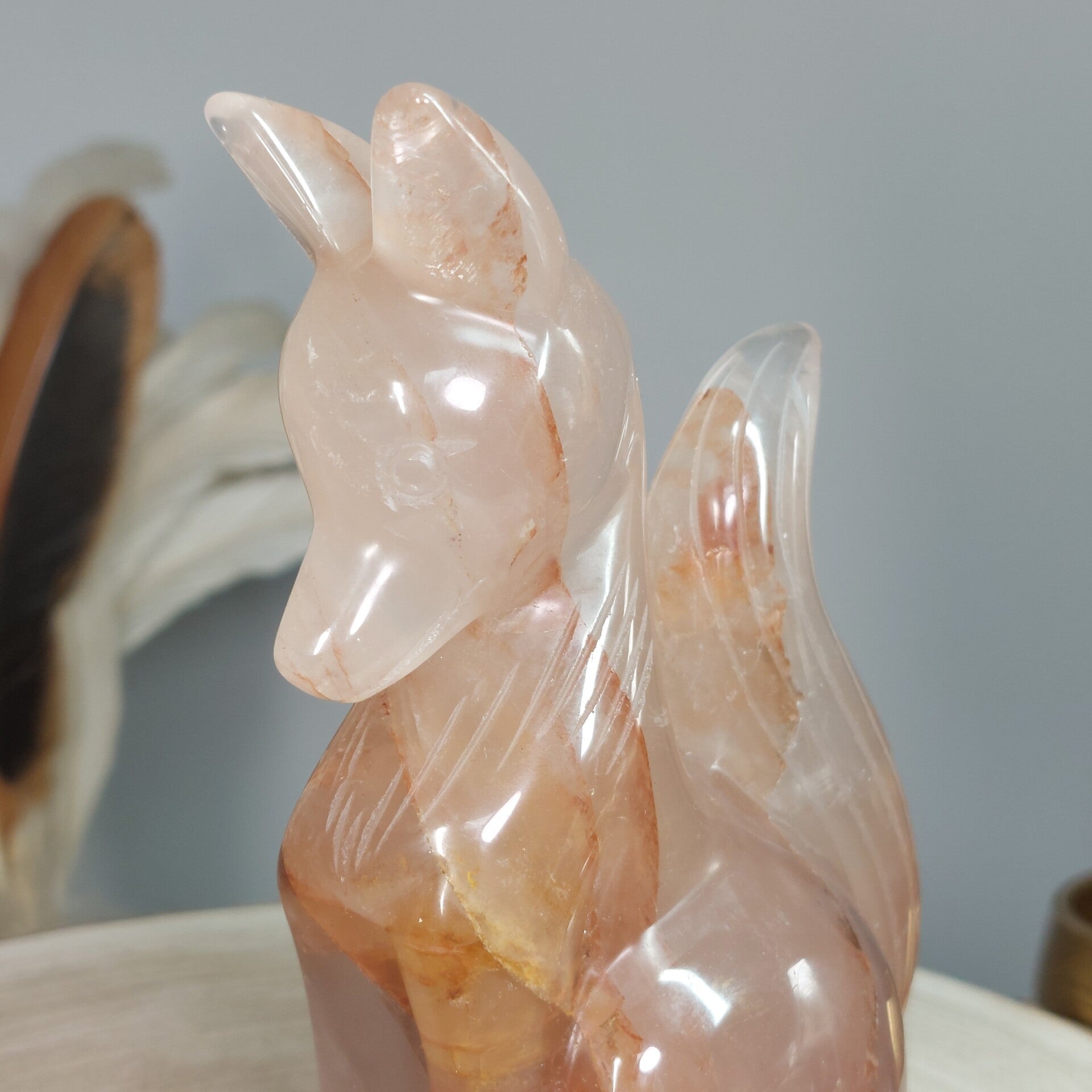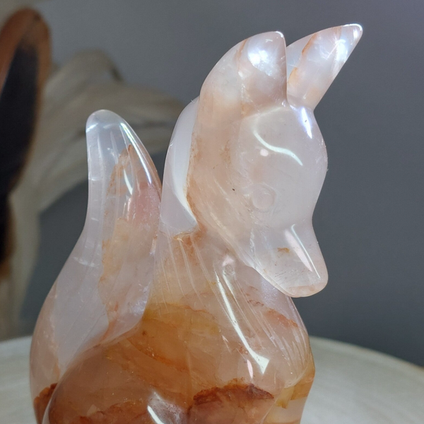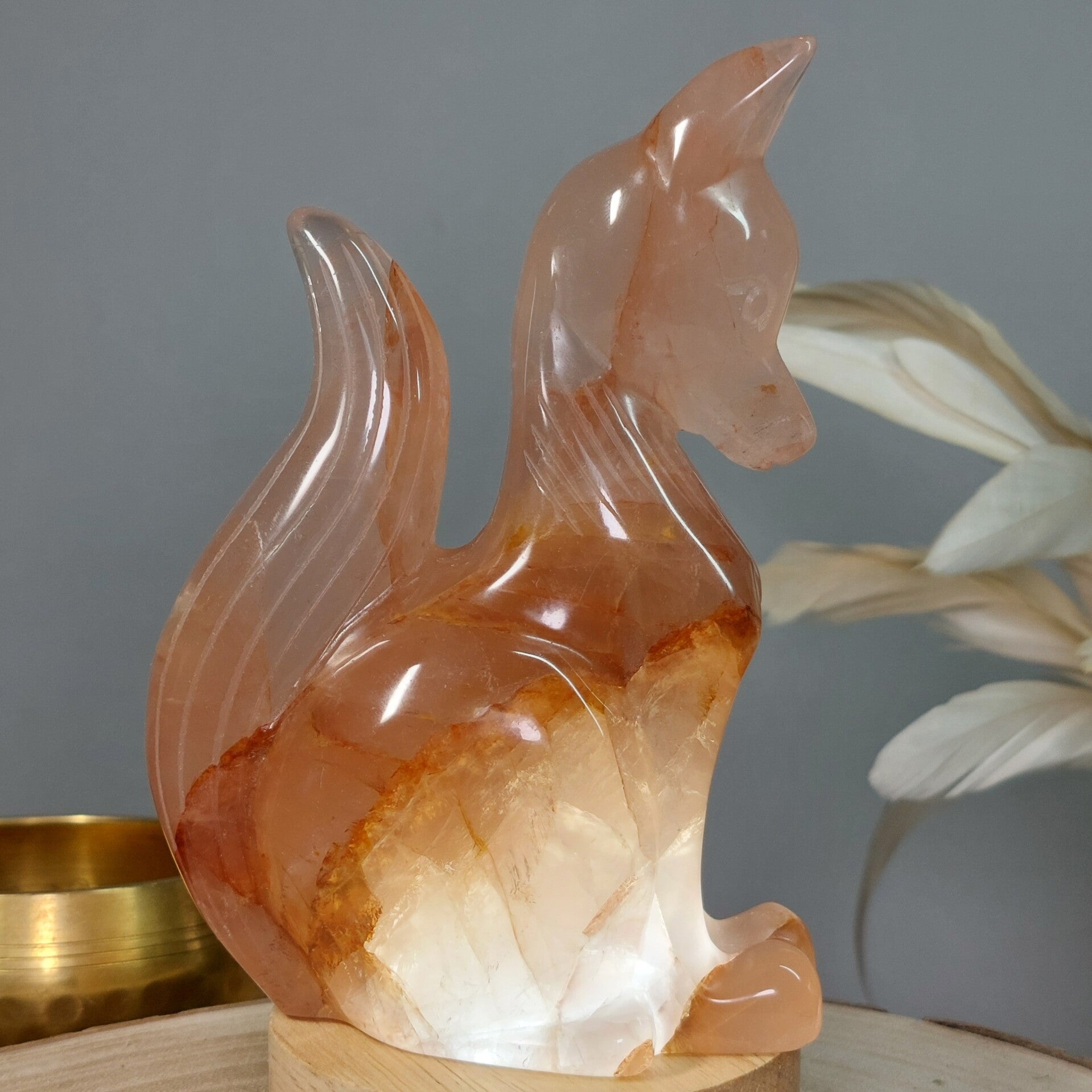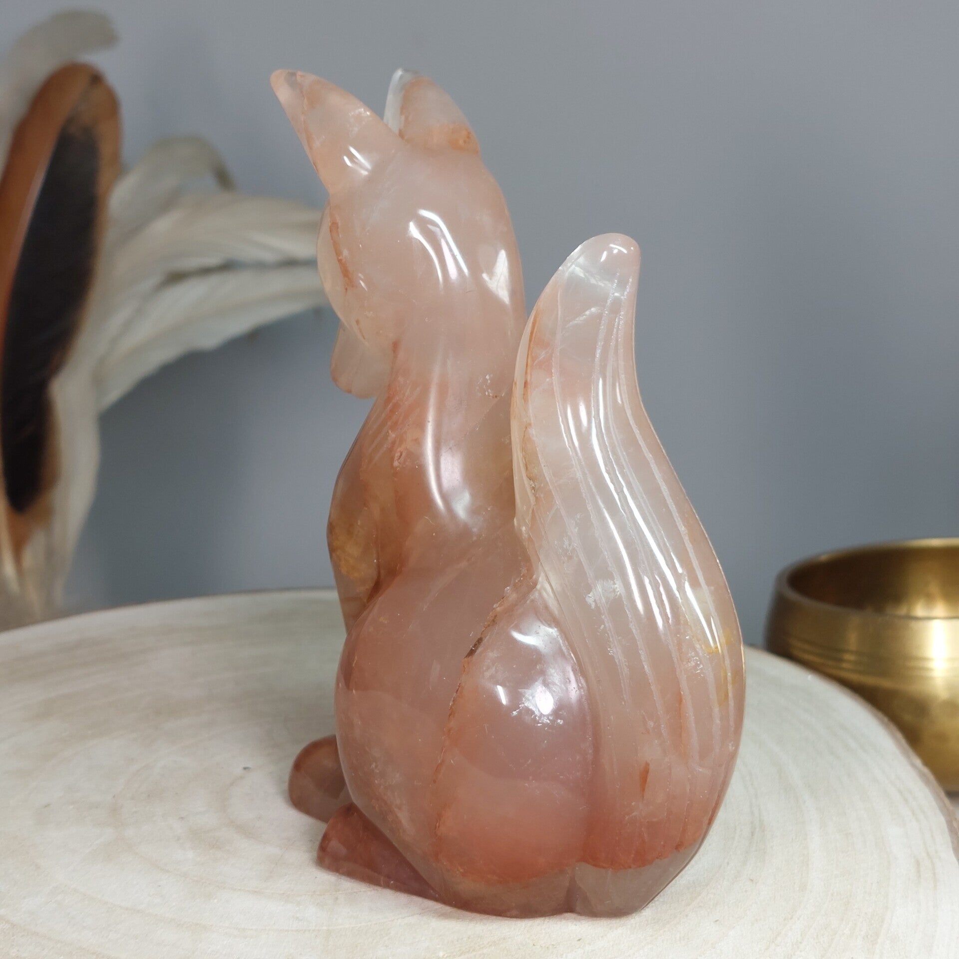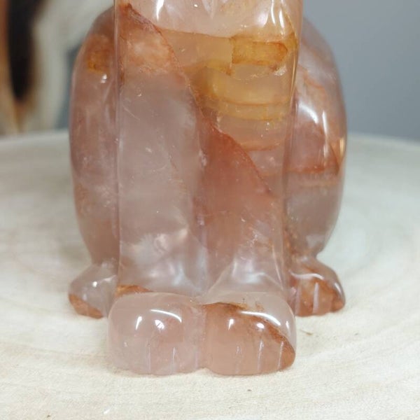 Hematietkwarts is een zeer goed aardend kristal. Het kalmeert je geest, waardoor je de tijd hebt om dingen goed te verwerken en op te lossen. Het is een kristal dat de onevenwichtigheden en negativiteiten in je leven oplost en je laat genieten van een meer gebalanceerde energie. Het inspireert tot creatief en origineel denken, en het verhoogt de focus en concentratie. Hematietkwarts helpt je ook om eenvoudige maar effectieve manieren te vinden om je problemen op te lossen. Het is een ideale steen voor wie regelmatig met complexe onderwerpen en technische zaken te maken heeft. Het verbetert ook de wilskracht en verhoogt het gevoel van eigenwaarde, eigenwaarde en zelfvertrouwen. Het stimuleert het verlangen naar vrede en oprecht geluk. Het helpt je te beseffen dat je kunt leren van je fouten uit het verleden en dat je er niet door moet worden gedefinieerd of verlamd. Bergkristal met Hematiet dat afkomstig is van Lemurisch kristal wordt ook wel Maria Magdalena kristal genoemd. Deze Bergkristal bevat vaak zwemen van hematiet, zoals bij deze prachtige vos goed zichtbaar is. Hierdoor is het prachtige Bergkristal met Hematiet verbonden met de roze/oranje straal die in verbinding staat met de lijn van de Godinnen zoals Guanyin /Quan Yin, Maria en Isis. Deze kristallen staan erom bekend dat ze je kunnen verbinden met de Goddelijke vrouwelijke energie♡ Of deze vos daadwerkelijk van Lemurisch kristal afkomstig is kan ik helaas niet bewijzen omdat de kenmerkende streepjes van Lrmurisch kristal niet zichtbaar zullen zijn doordat de vos is glad gemaakt. Wel voel ik zelf de liefdevolle, vrouwelijke energie bij deze mooie vos wat zo kenmerkend is voor dit soort kristal.
