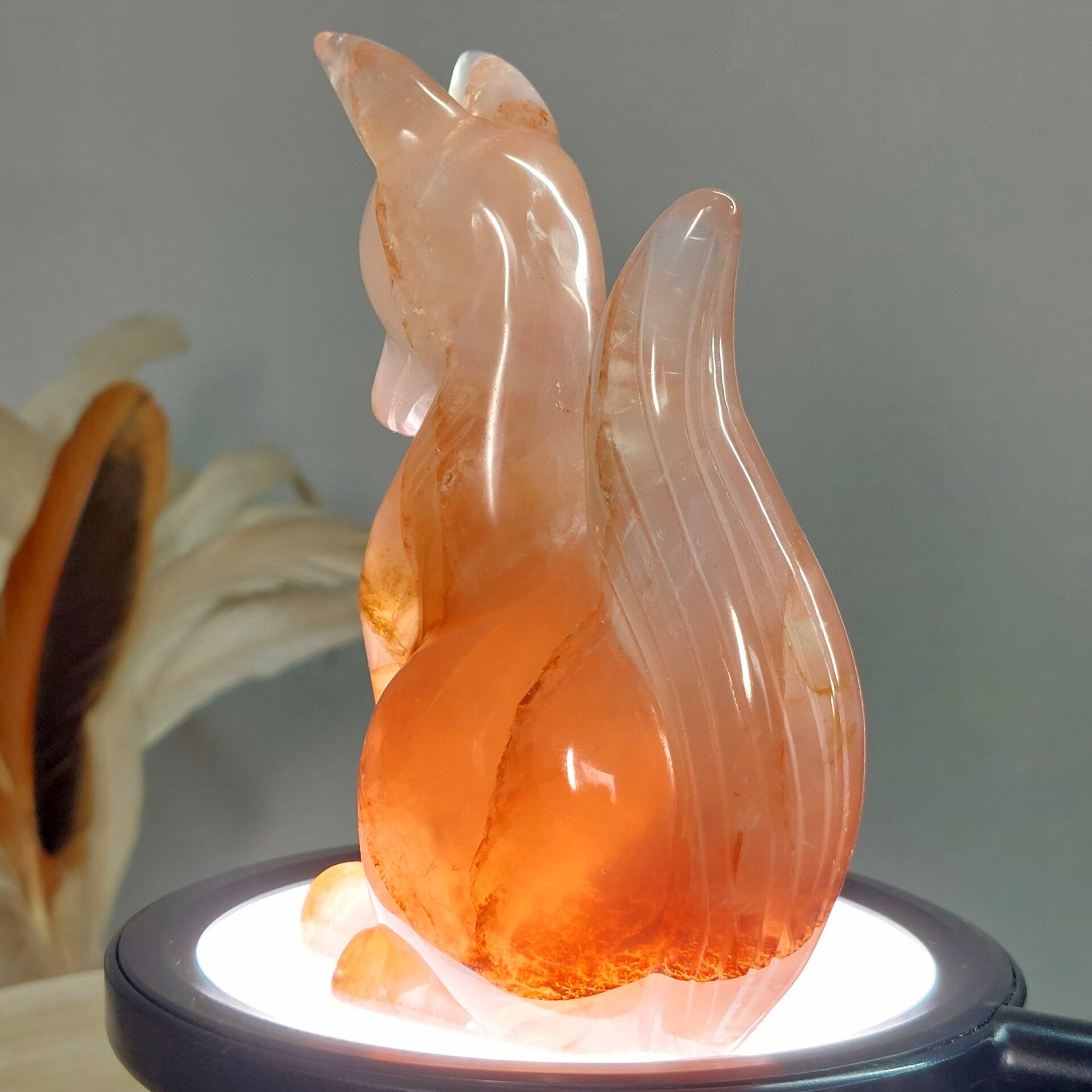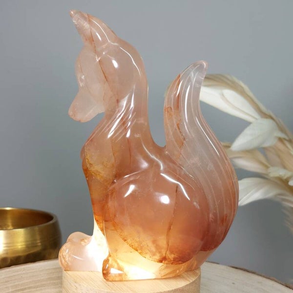 Prachtige vos van Hematoïde kwarts / Hematietkwarts ook wel bekend als Fire kwarts. Bergkristal met Hematiet dat fkomstig is van Lemurisch kristal wordt ook wel Maria Magdalena kristal genoemd. Deze handgedlepen vos heeft een geweldige uitstraling en heerlijke liefdevolle energie. De vos schijnt prachtig door als deze op een lichtbron wordt gezet. De insluitsels van Hematiet zijn hierdoor nog beter zichtbaar en het geeft een soort van "magisch" effect. Het houten usb lampje van de foto wordt meegeleverd zodat je meteen kan genieten van de "sfeer verlichting" Deze vos is van oor tot onderkant staart 14cm en 9cm breedt