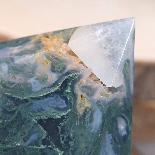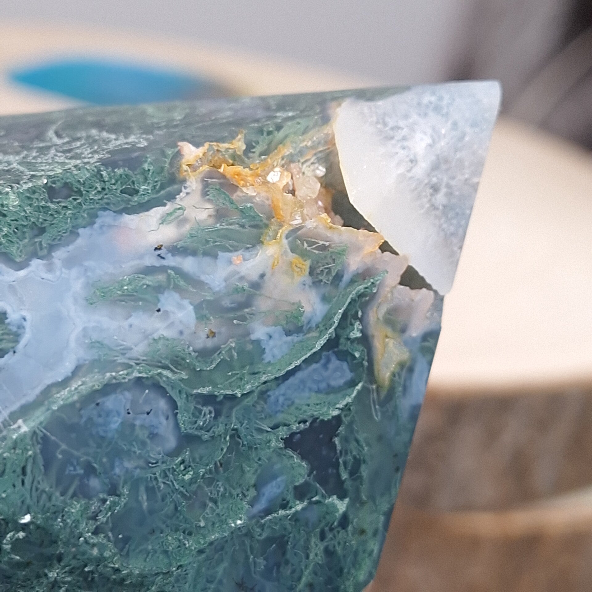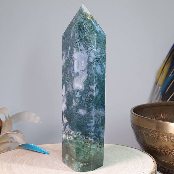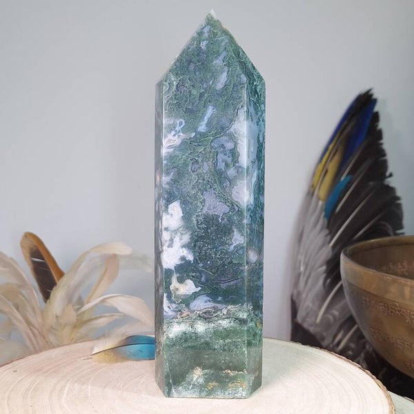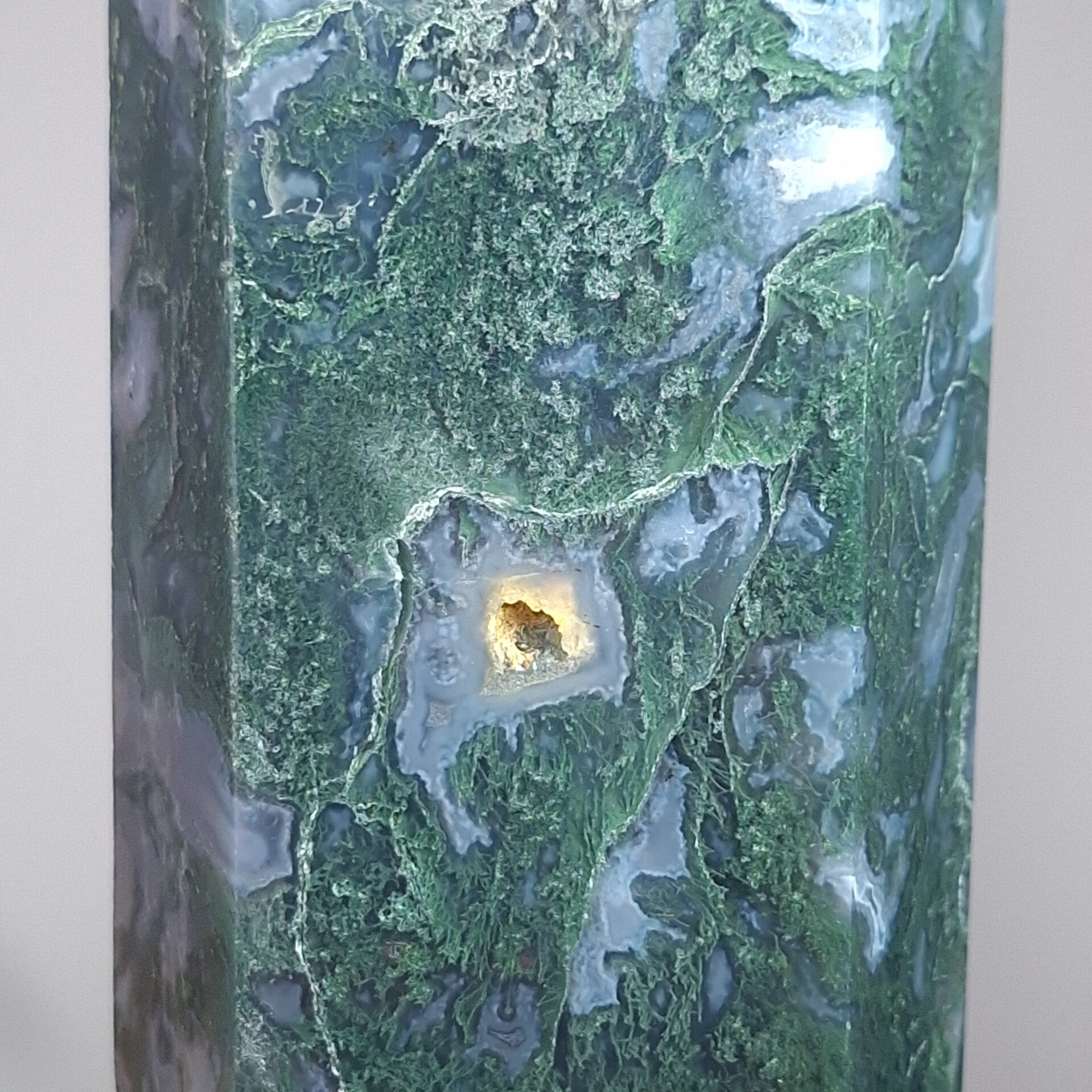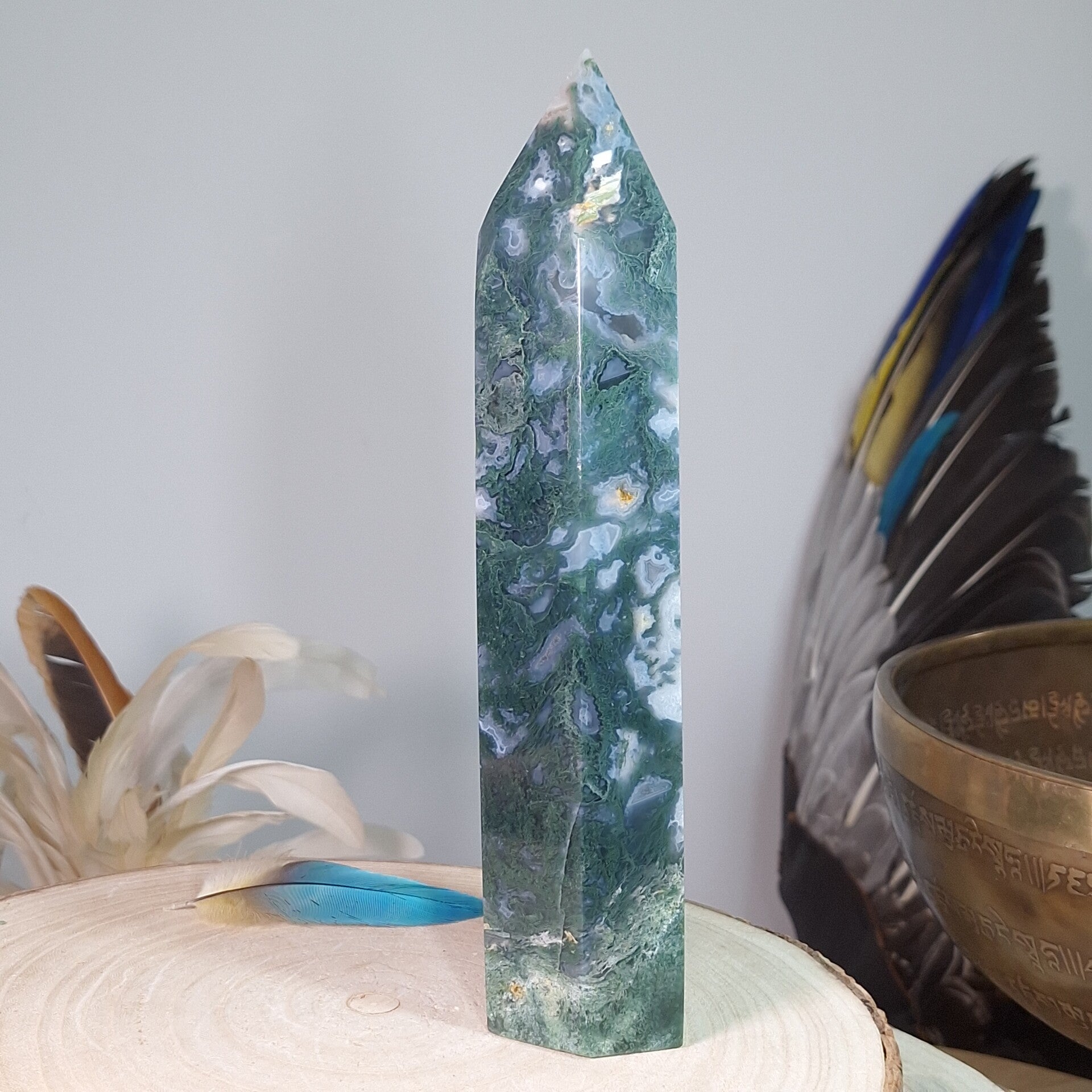 Prachtige grote Mosagaat toren van 1413 gr en 23,3x6,8cm. Robuste toren met een zeer bijzondere top/punt. Met haar prachtige uiterlijke en heerlijke aardende, liefdevolle energie is ze een ware aanvulling voor het interieur in o.a huis, praktijk, kantoor en salon. Mooie investering om een ruimte met positieve energie te vullen. Een echt statementpiece, pronkstuk! Aan alle kanten is deze fantastische toren een streling voor het oog.