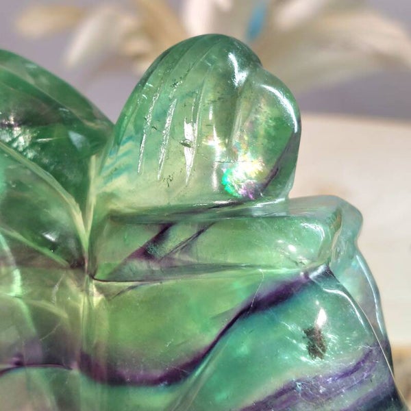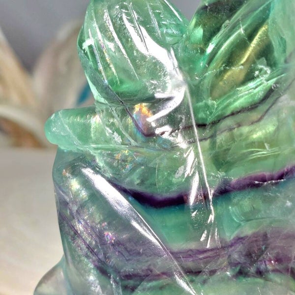 Laat je betoveren door deze prachtige Regenboog Fluoriet Fairy. Deze Fluoriet is heel mooi helder en heeft fantastisch mooie regenboogjes. Ze reageert op uv licht en dat geeft een prachtig effect in schemer en in het donker. Er wordt een uv lampje meegeleverd zodat je meteen kunt genieten van dit "magisch" mooie effect. Zeer mooie handgeslepen Fairy van 13 cm en 434gram.
