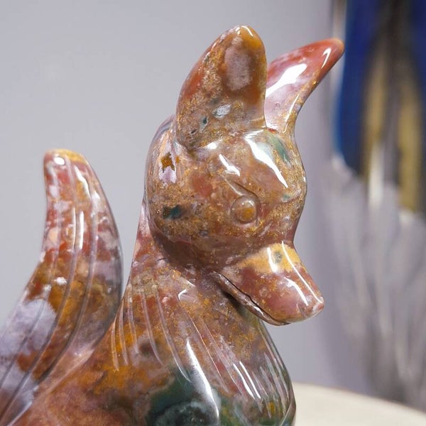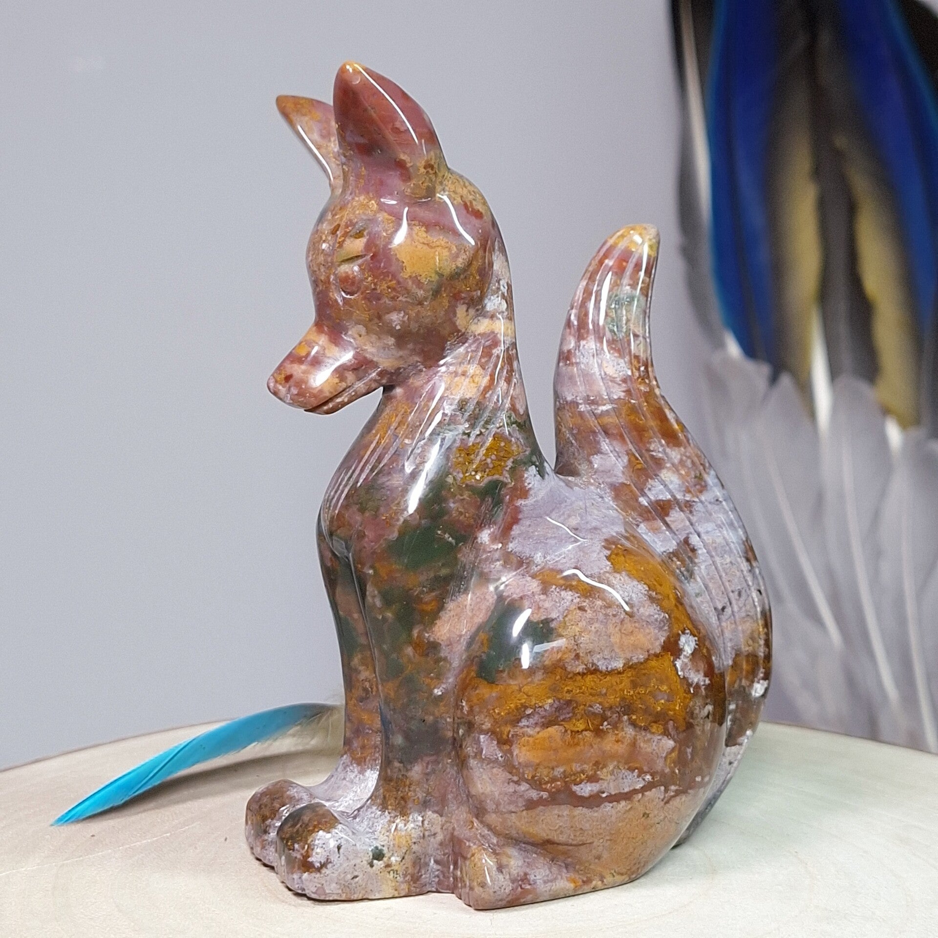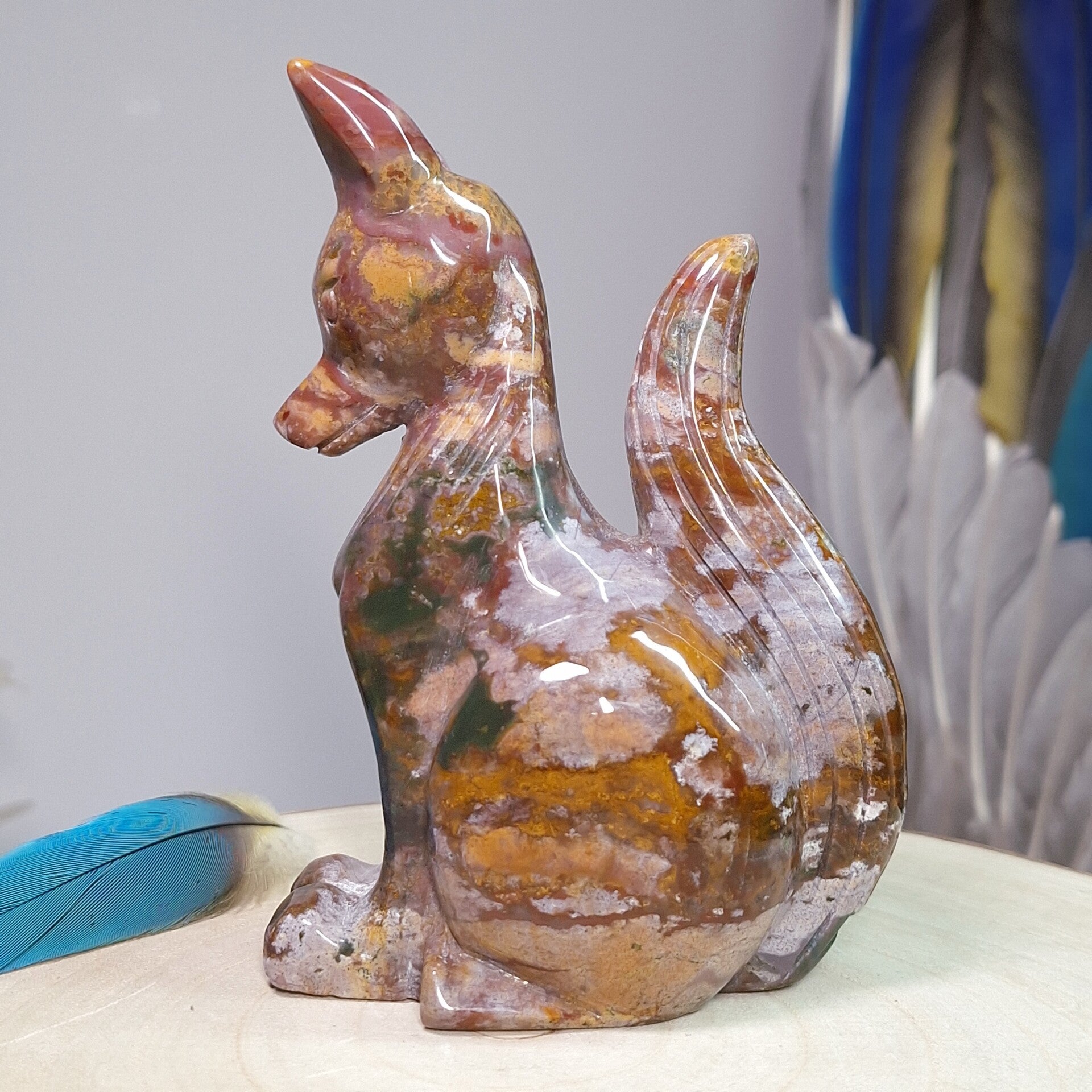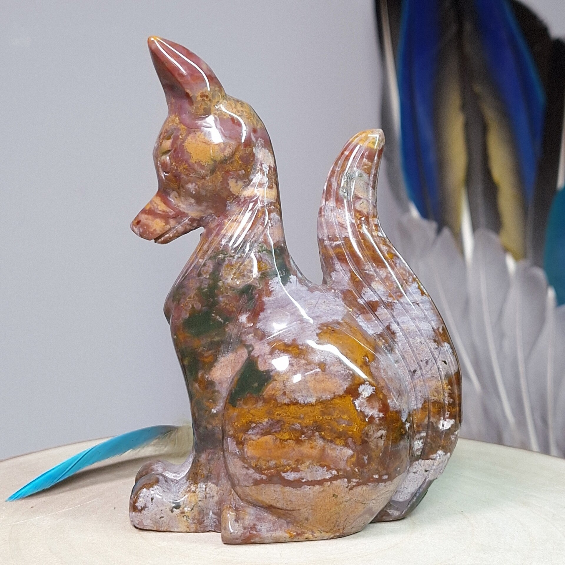 Oceaan Jaspis vos. Zeer mooi getekend met prachtige kleuren. Bijzonder uniek exemplaar van 14,3cm