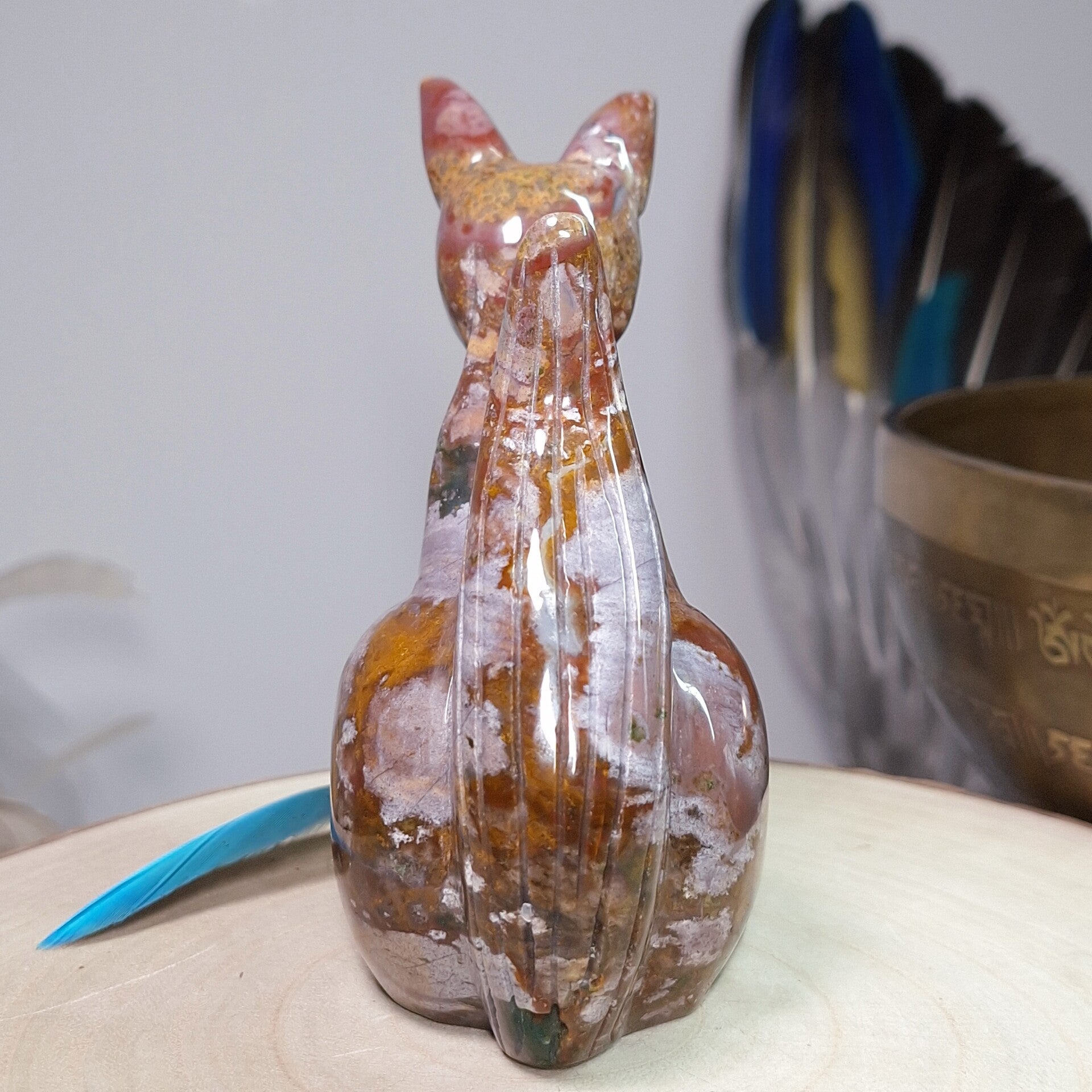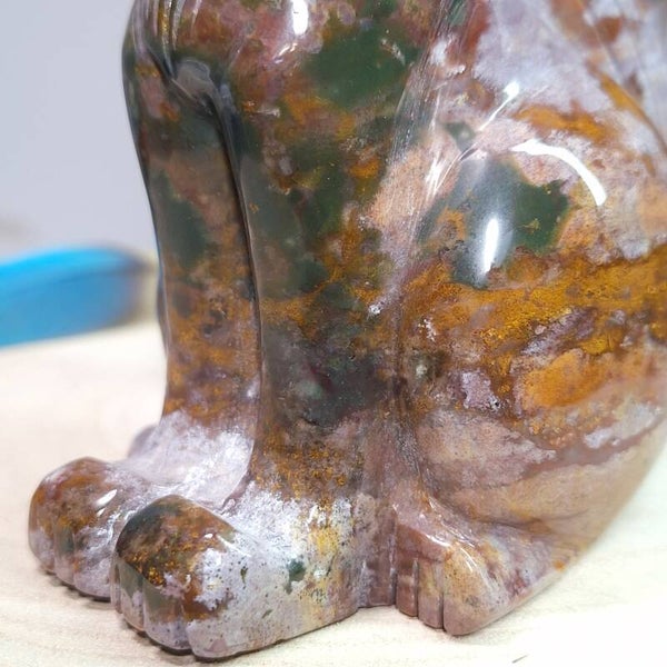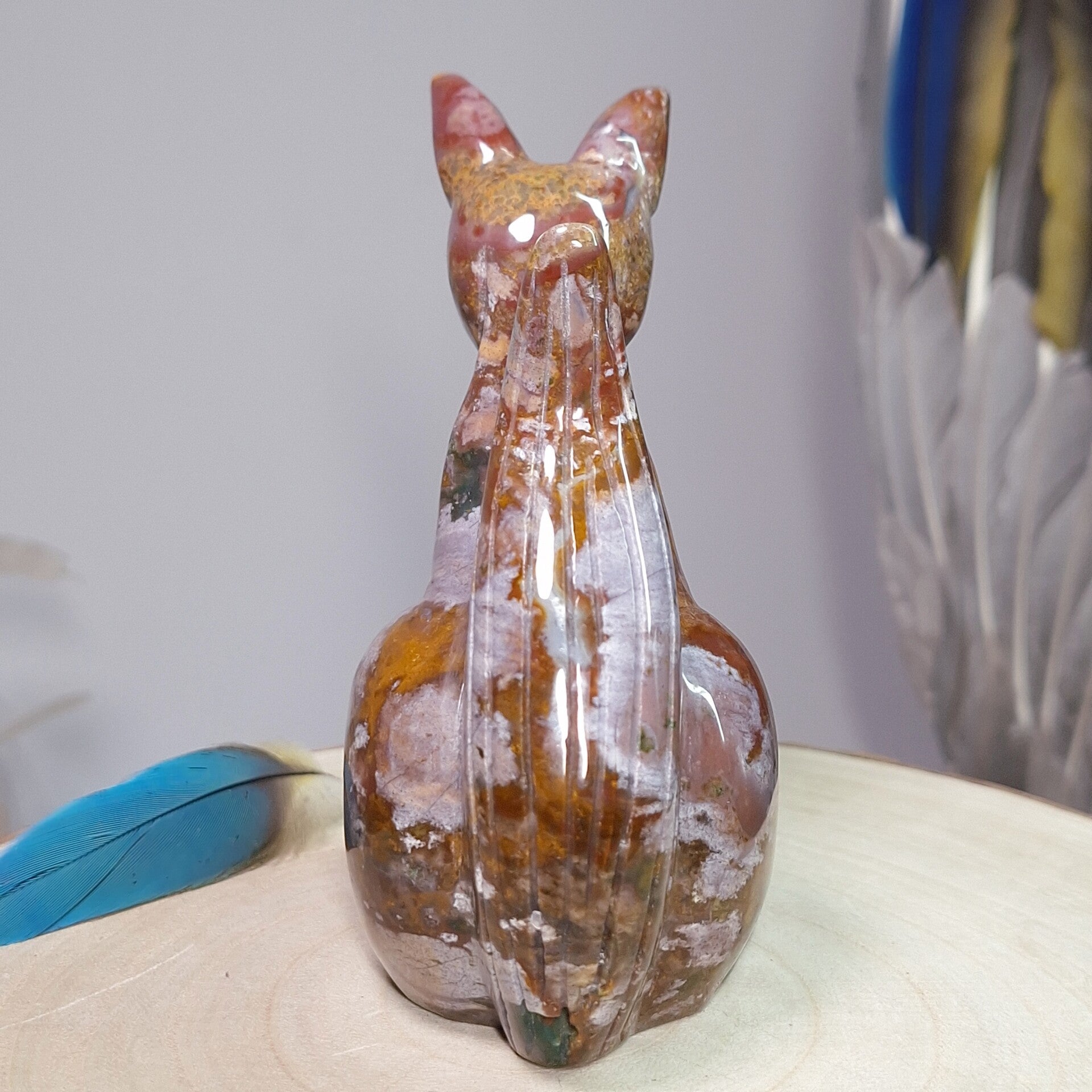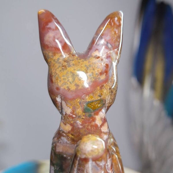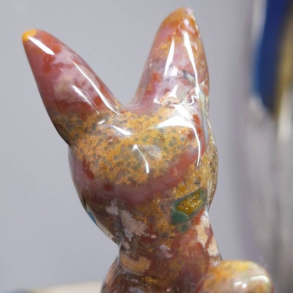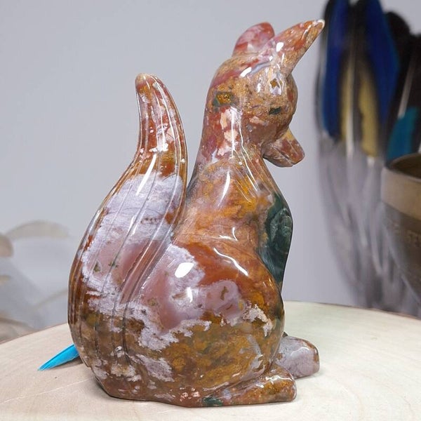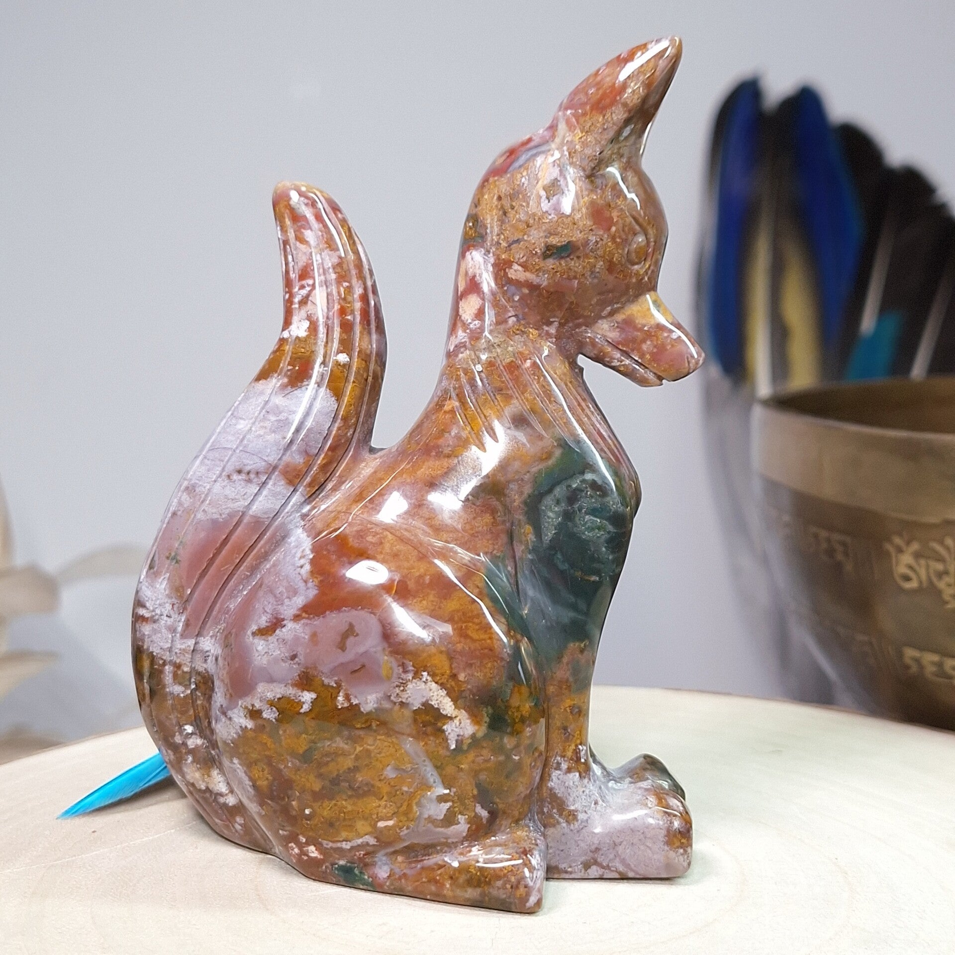 Zeer fraai, elegant en uniek is deze handgeslepen kleurrijke Oceaan Jaspis vos. Deze beauty heeft prachtige tekening en kleuren, een ware schoonheid met heerlijke energie. Deze Vos is 575 gram en 14,3cm