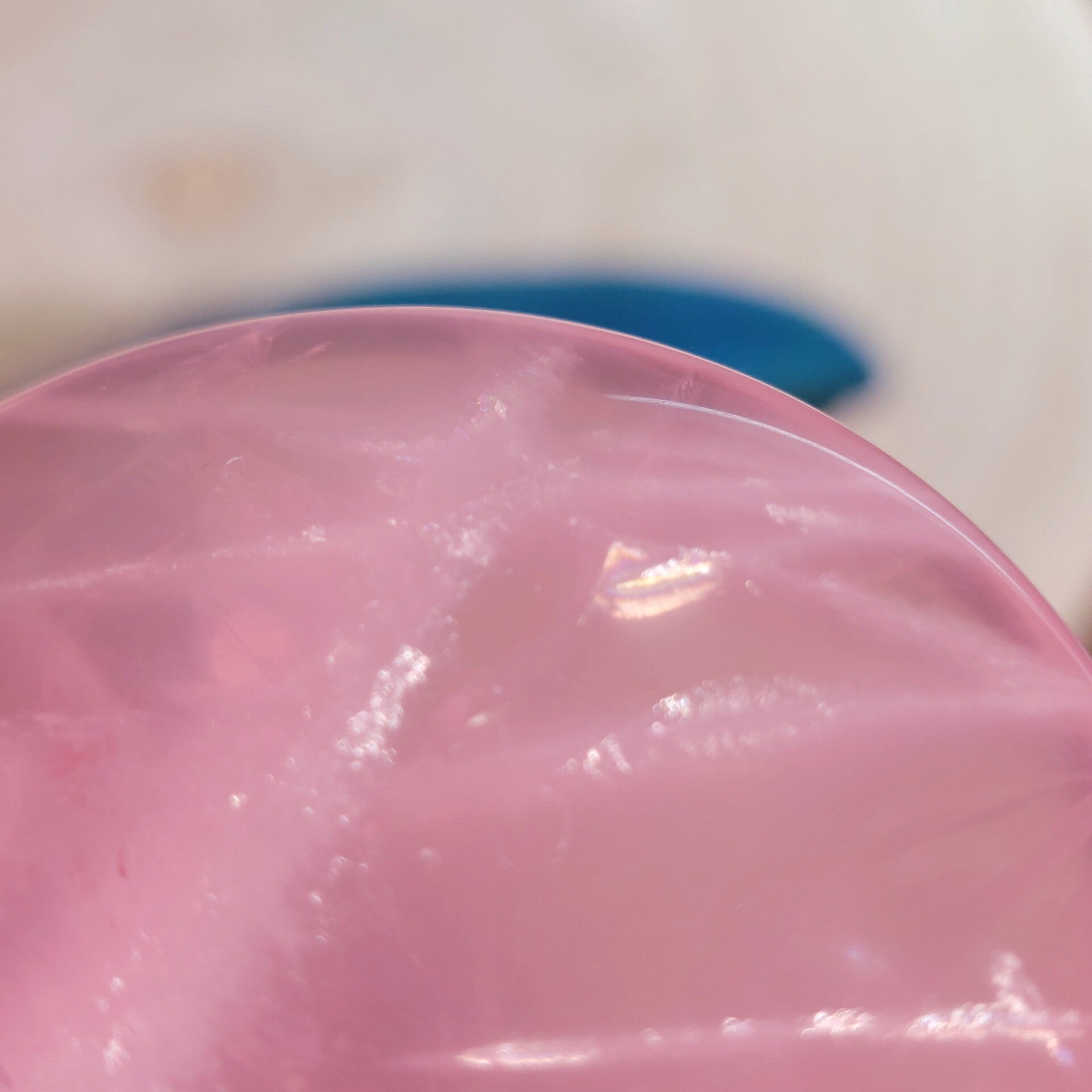 Rozenkwarts maan. Deze maan is gemaakt van fantastische kwaliteit Rozekwarts uit Madagaskar. Ze heeft mooie transparante delen en is prachtig roze van kleur met wat regenboogjes. 5,1cm