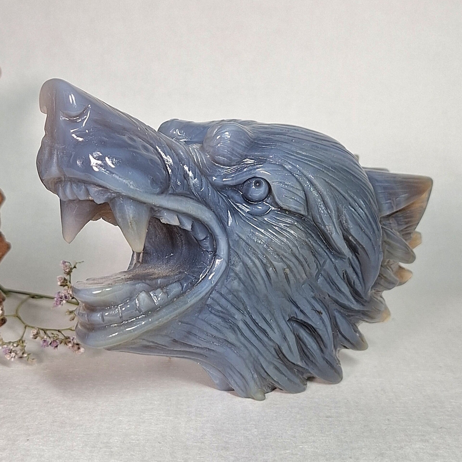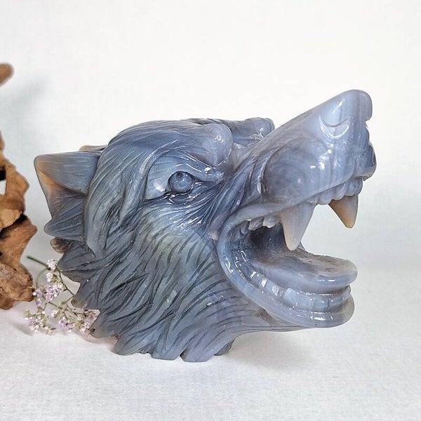 Prachtige handgeslepen Agaat wolf van maar liefst 12,7 cm en 550 gram.