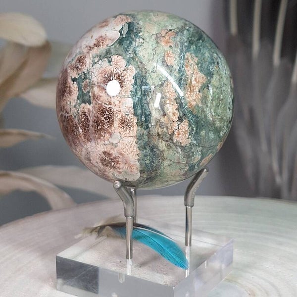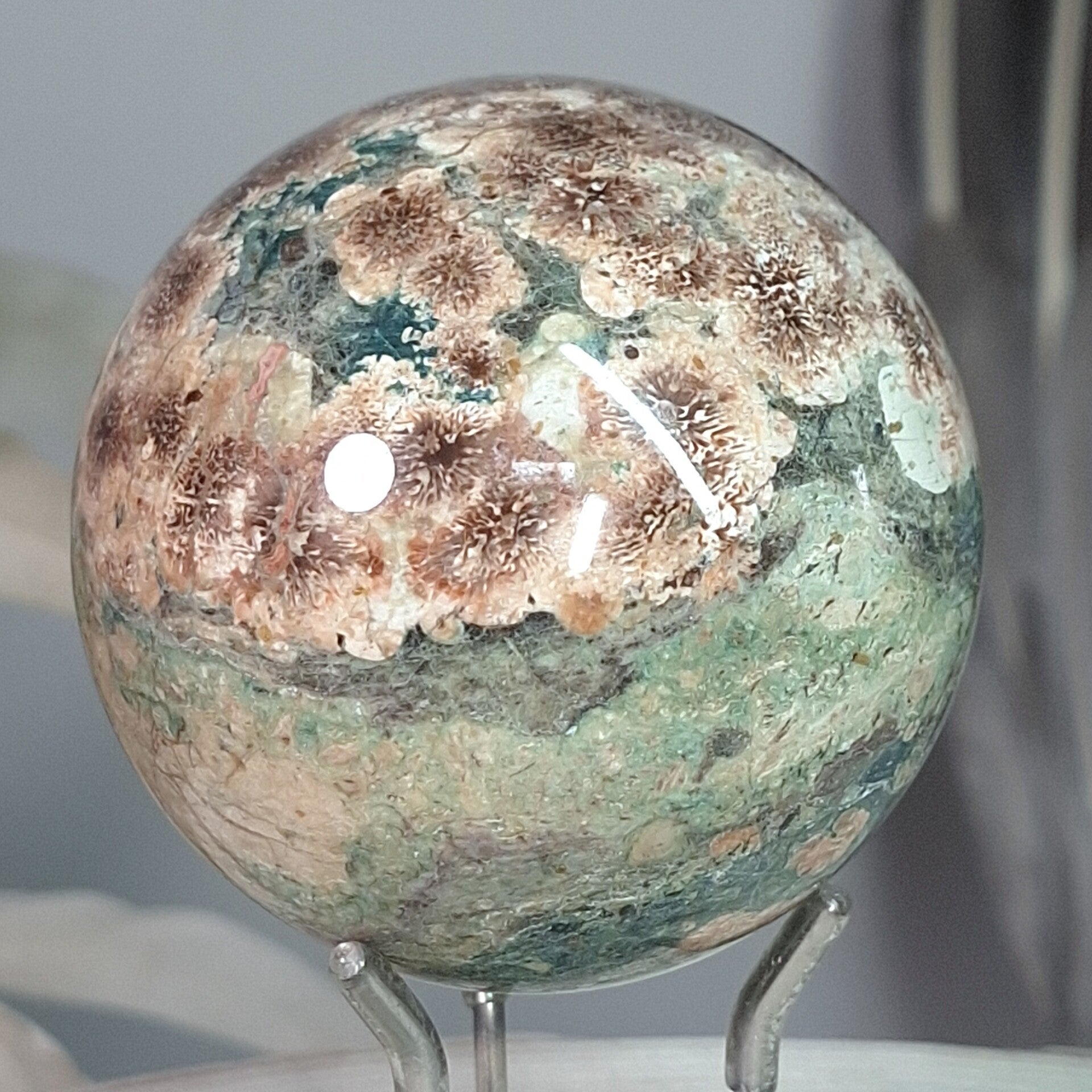 Prachtige bol met bijzonder mooie tekening. Zeer mooie kwaliteit. 0,4kilo en 6,5cm. Vrolijk worden wij van deze schilderachtige "steen" soort. Ik moet denken aan het voorjaar met bloesem aan de bomen. De prachtige kleuren en bloesemachtige patronen lijken wel op de bol te zijn geschilderd maar uiteraard is dit niet het geval. Deze schatten van moeder aarde zijn puur natuur♡namen die hiervoor zijn gebruikt zijn o.a Sakura Bloem Agaat ♡ Flower Rhyolite Jasper ♡ Groene Kersenbloesem Agaat etc