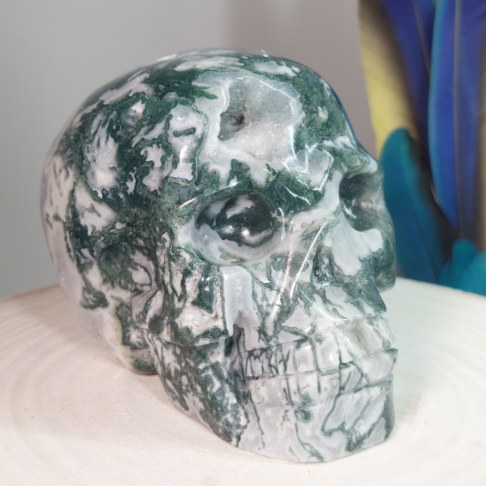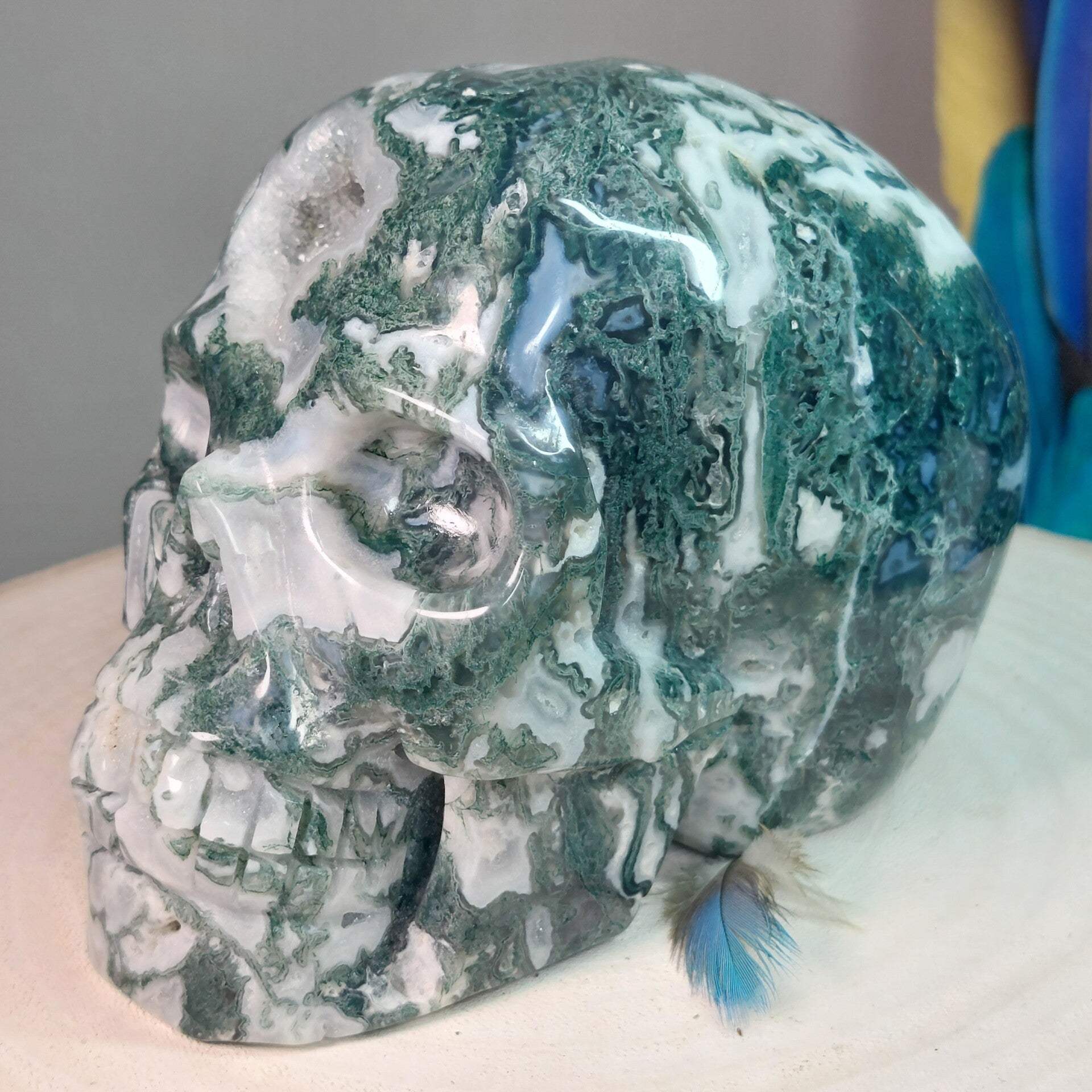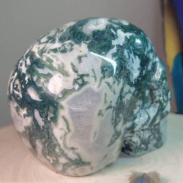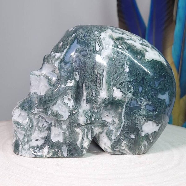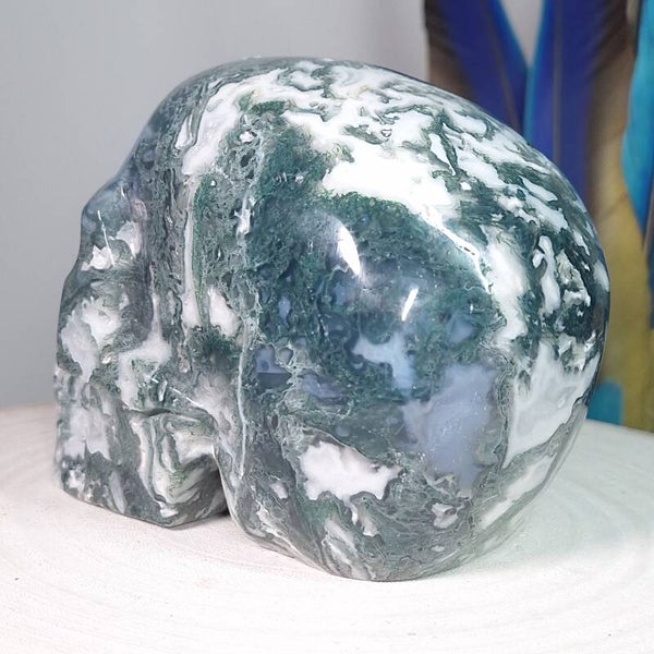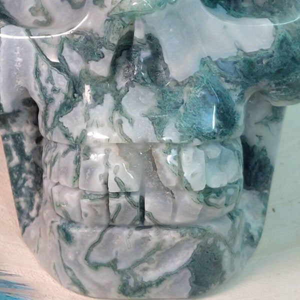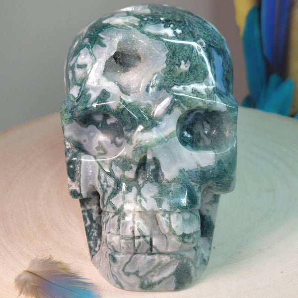 Fantastisch mooie grote handgeslepen Mosagaat skull van 13,5 cm en 1283 gram met prachtige patronen, Blauwe Chalcedoon en geodes met bergkristal / kwarts kristalletjes. Bekijk de video hieronder die buiten in daglicht is gemaakt en krijg een beter beeld van deze "magisch" mooie, zeer aardende Skull met heerlijke energie.