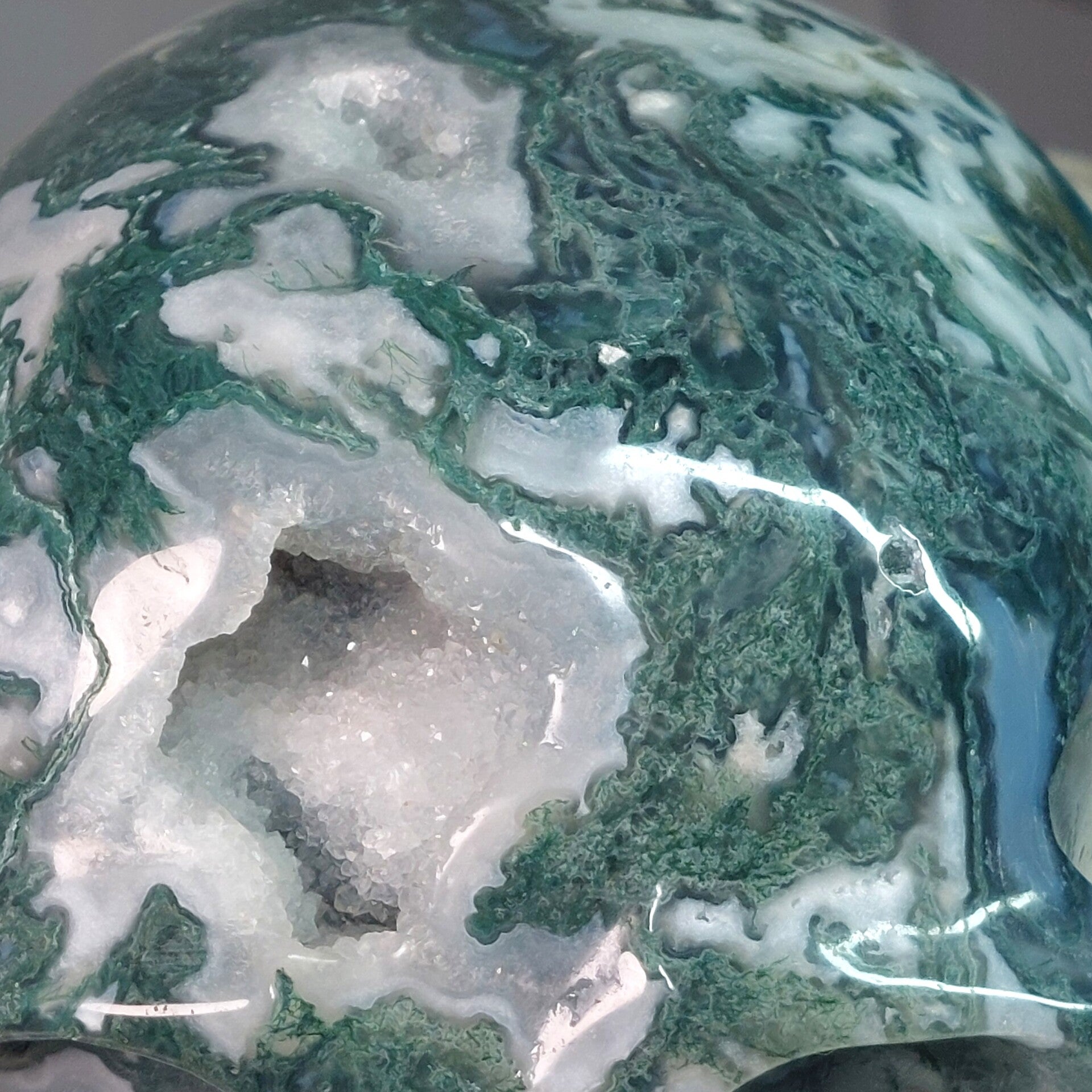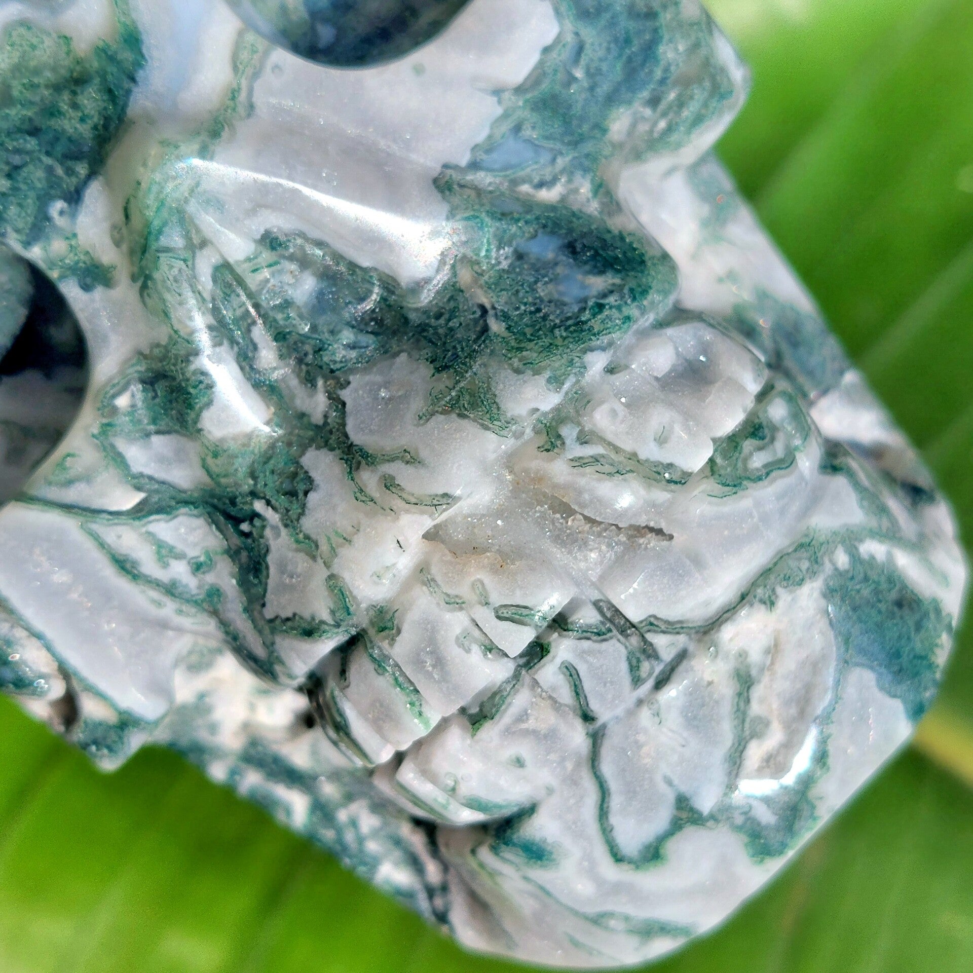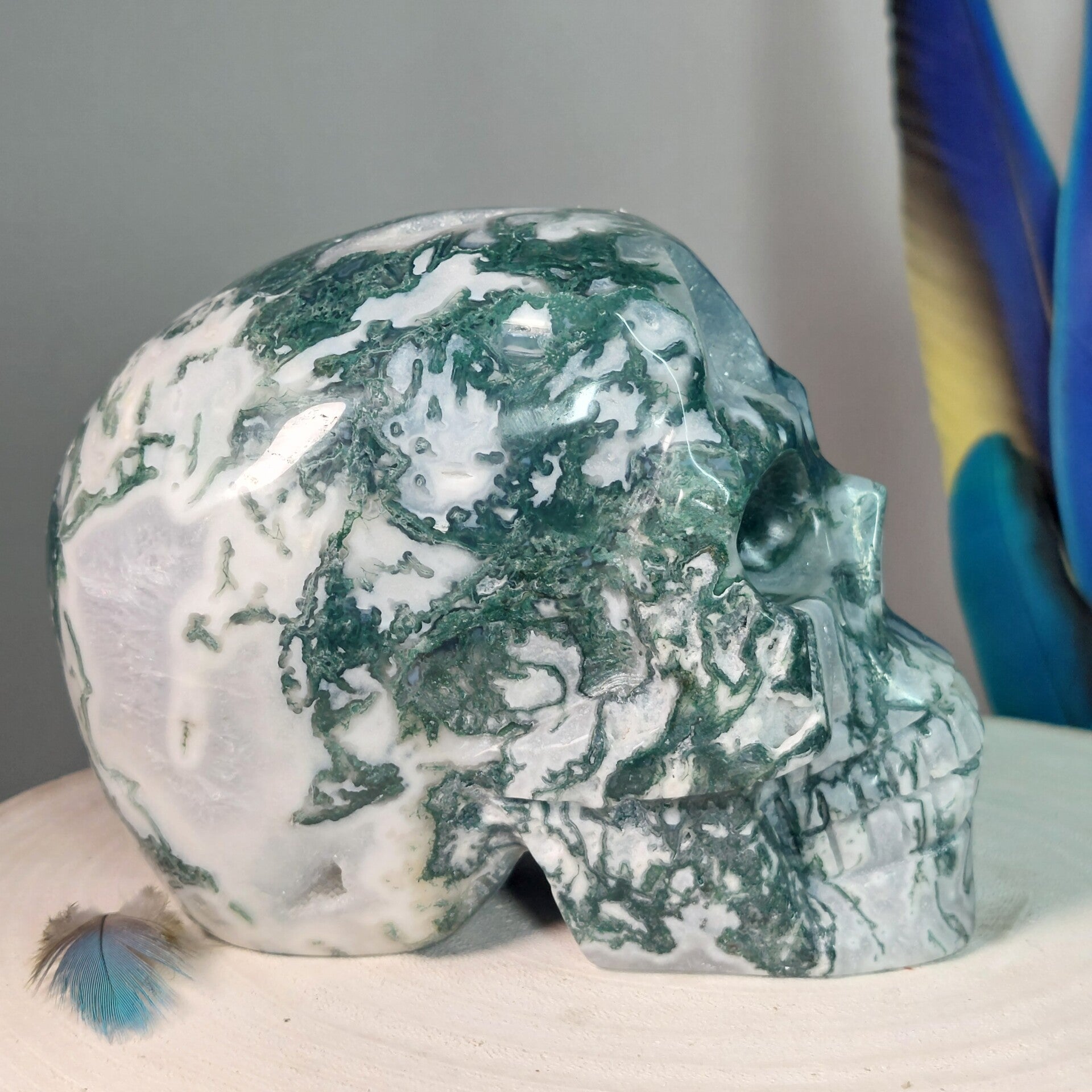 Fantastisch mooie grote handgeslepen Mosagaat skull van 13,5 cm en 1283 gram met prachtige patronen, Blauwe Chalcedoon en geodes met bergkristal / kwarts kristalletjes. Bekijk de video hieronder die buiten in daglicht is gemaakt en krijg een beter beeld van deze "magisch" mooie, zeer aardende Skull met heerlijke energie.