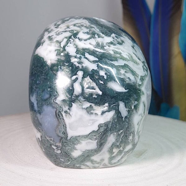 Mosagaat helpt je om zorgen los te laten en te ontspannen. Maakt actief en vitaal. Mosagaat geeft rust en helderheid, maakt bevalling makkelijker, positieve invloed op de ontwikkeling van de foetus, stimuleert wilskracht en werklust, zorgt voor meer uithoudingsvermogen, opent het hart voor universele liefde, geeft energie en helpt om beter te aarde. Mosagaat heeft een positieve werking op de weerstand, het immuunsysteem, hart en bloedvaten en de longen. De energieën zijn bescheiden maar heilzaam. Hij werkt stabiliserend en aardend. De energie van deze steen zorgt ervoor dat lichaam, geest en ziel naar hun natuurlijke evenwicht worden gebracht zodat je meer rust kunt ervaren op alle niveaus. Mos agaat helpt je te herstellen na ziekte en om weer tot jezelf te komen na een periode van emotionele onrust. Mosagaat werkt goed tegen angsten en stress. Helpt tegen straling. Mosagaat is heel goed voor mensen met schrik en angsten en fobieën of straatvrees, door het dragen krijg je meer eigenwaarde en gevoel van onaantastbaarheid, hij helpt je om overal weer de schoonheid van in te zien. Deze steen is zeer goed voor alle mensen die met planten en gewassen werken.Het is een steen voor een nieuw begin en helpt bij het opheffen van blokkades. Bij een scheiding, overlijden of intens verdriet geeft de mosagaat een steuntje in de rug, hij helpt je ook bij het afscheid nemen van het verleden en geeft rust in lichaam en geest. Mosagaat is een steen van rijkdom en trekt overvloed aan.Hij helpt ook mensen die erg in hun hoofd zitten bij hun gevoel te komen. De steen helpt om met andere mensen om te gaan en deze ruimte tot groei te geven. Geestelijk bevordert hij zelfexpressie en communicatie. Deze optimistische steen is zeer behulpzaam voor mensen die depressief zijn vanwege hun levensomstandigheden of door een onbalans in de hersenen, hij geeft dan inzicht in de achterliggende oorzaken. Mosagaat is goed bij ongemakken aan de neus_ en keelholten, ook zorgt hij voor het beter oplossen van slijm, ontkrampt de maag, darmen en blaas. Ook goed voor de seksuele organen en maakt ze gelijktijdig actief. De steen gaat ontstekingen tegen, reinigt de bloedsomloop en versterkt het immuunsysteem. Goed voor het lymfesysteem en als elixer op de huid aangebracht behandelt Mosagaat schimmelinfecties en andere huidinfecties. Goed voor huid, haren en bevordert spijsvertering