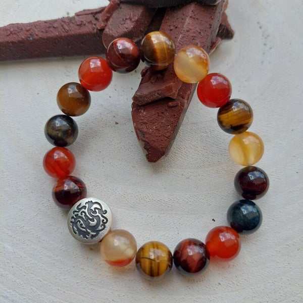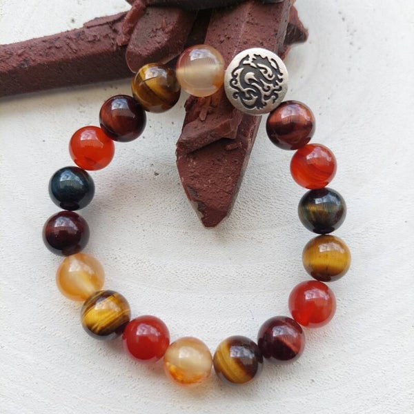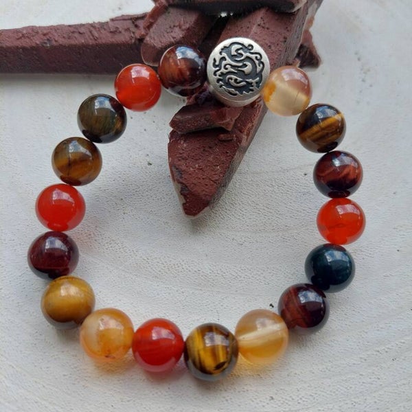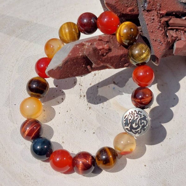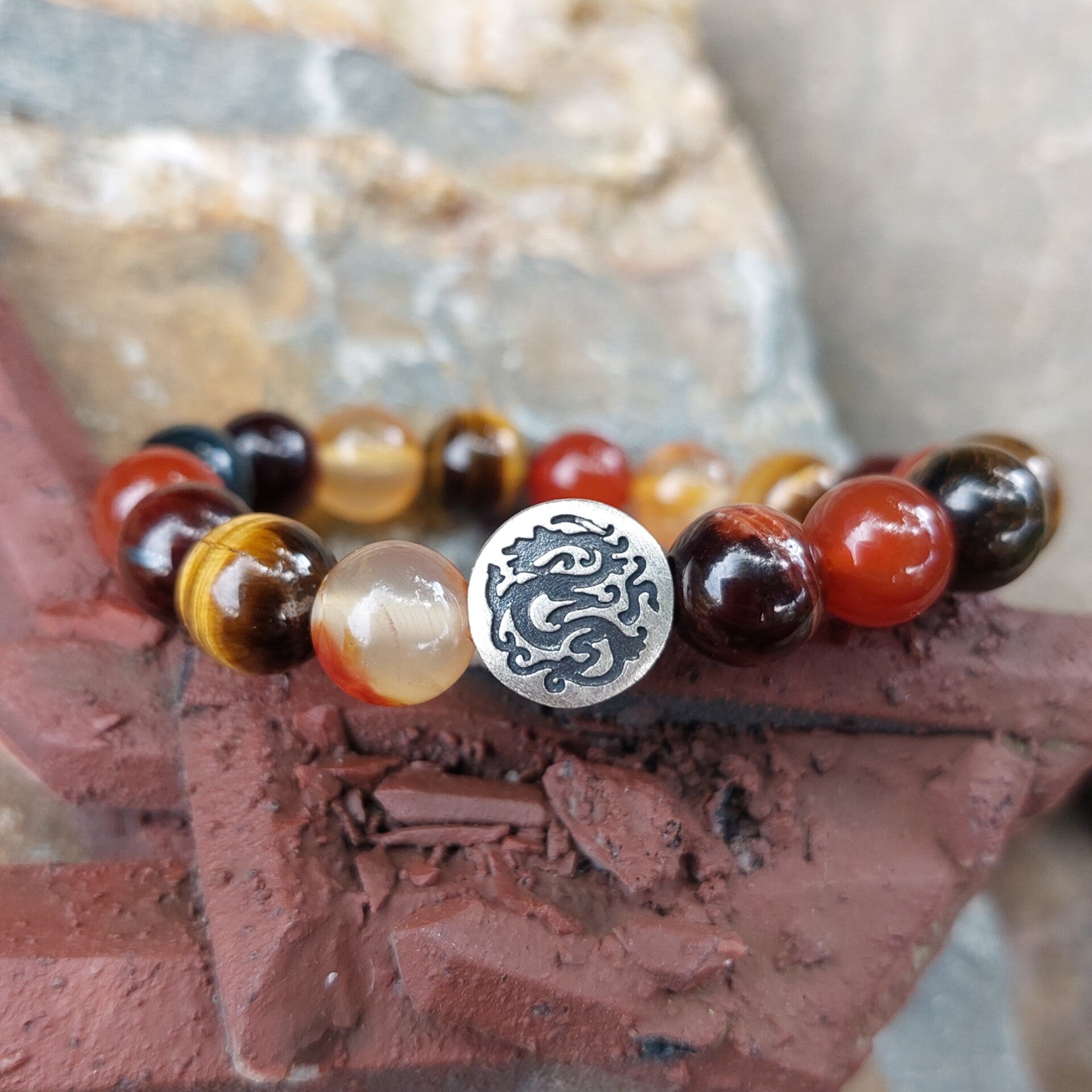 Tijgeroog, Tijgerijzer, Valkenoog en Carneool Armband met 17 kralen van 10mm en zilveren 925 bead Draak 13mm