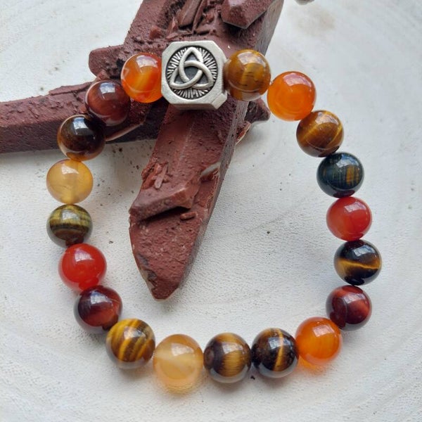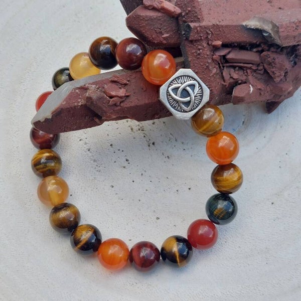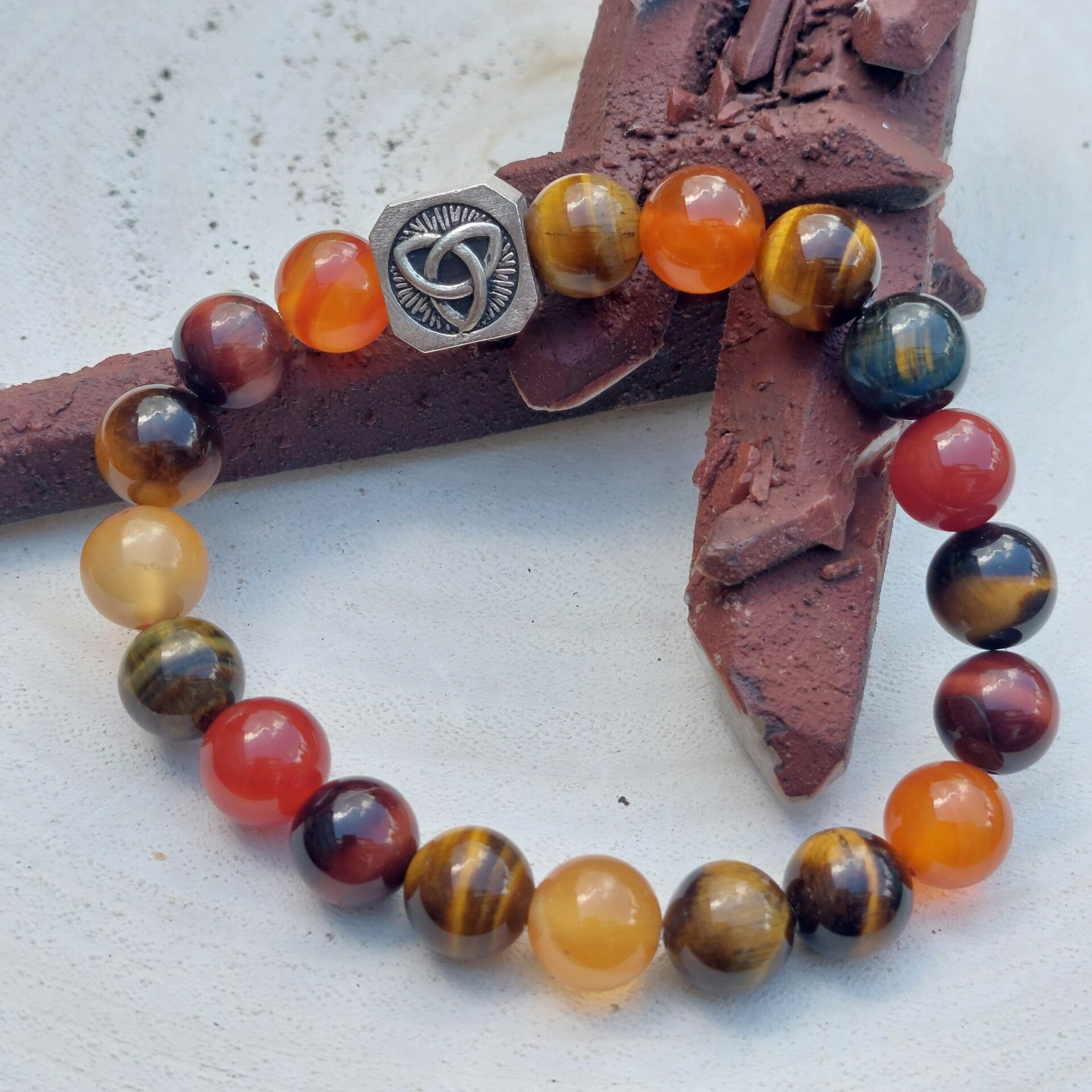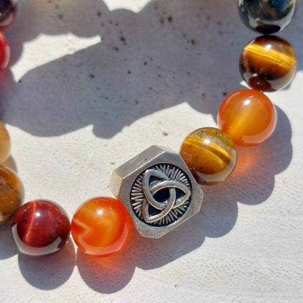 Tijgeroog, Tijgerijzer, Valkenoog en Carneool Armband 19 stuks 10mm kralen met zilveren 925 bead "Celtic Spiral" Keltische knoop