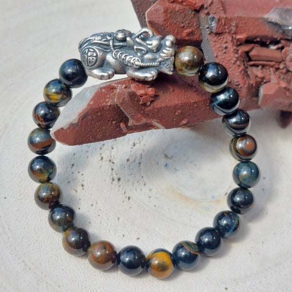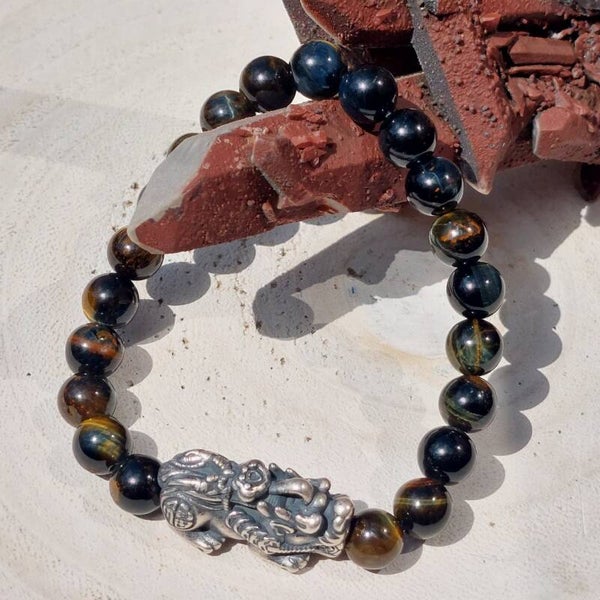 Armband met 21 kralen van combinatie Tijgeroog en Valkenoog van 8 mm met prachtige "flash". De armband heeft een unieke 925 zilveren Bixi / Kylin bead van 26mm. Deze staat symbool voor bescherming, voorspoed, geluk en rijkdom. Mijn polsomtrek is 16 cm, deze armband zit ruim om mijn pols maar zit niet te los. Is ook geschikt voor een iets grotere maat pols dan 16cm.