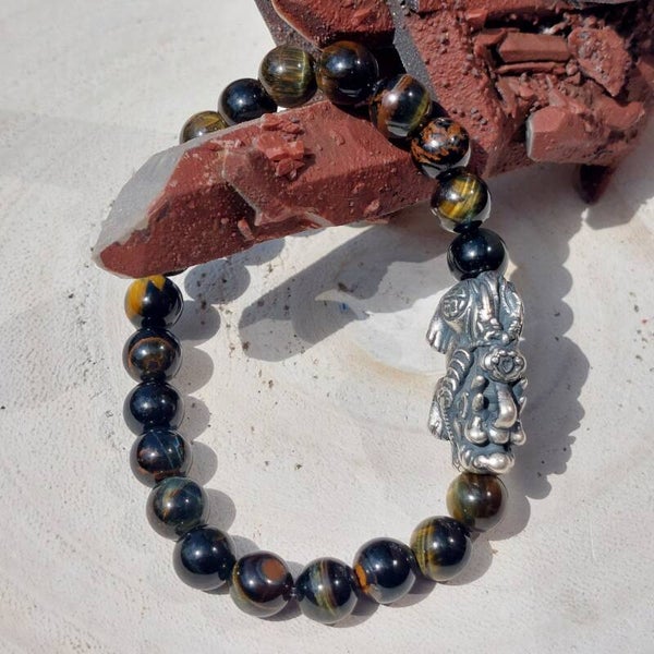 Tijgeroog met Valkenoog Armband 21x 8mm met zilveren 925 Bixie / Kylin bead van 2,6cm