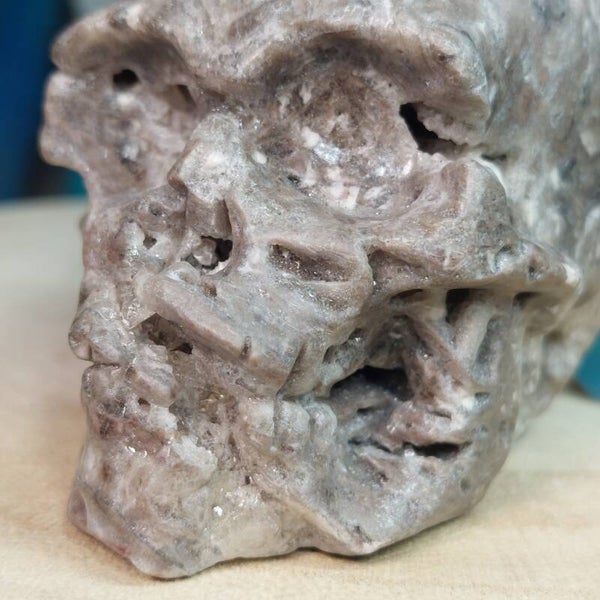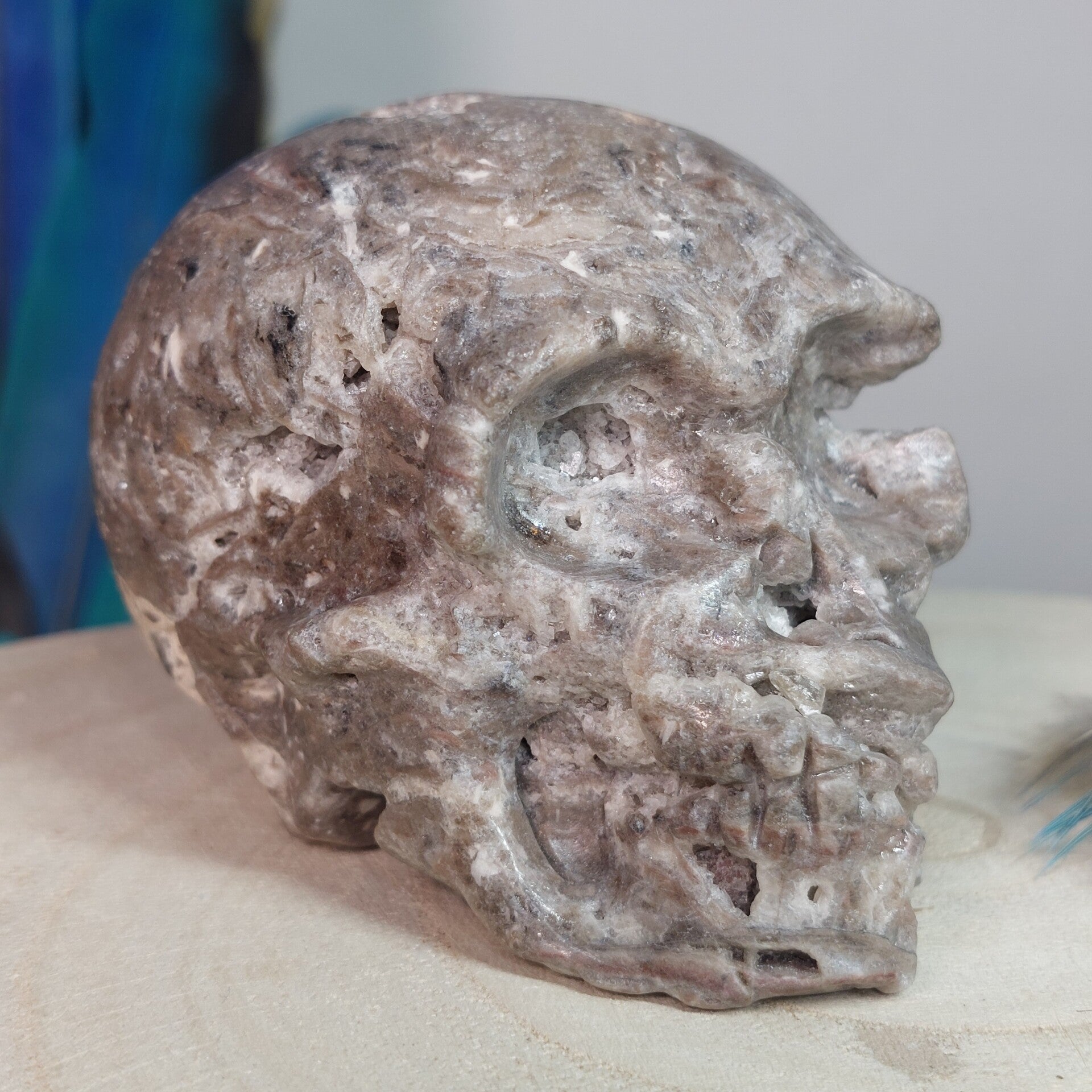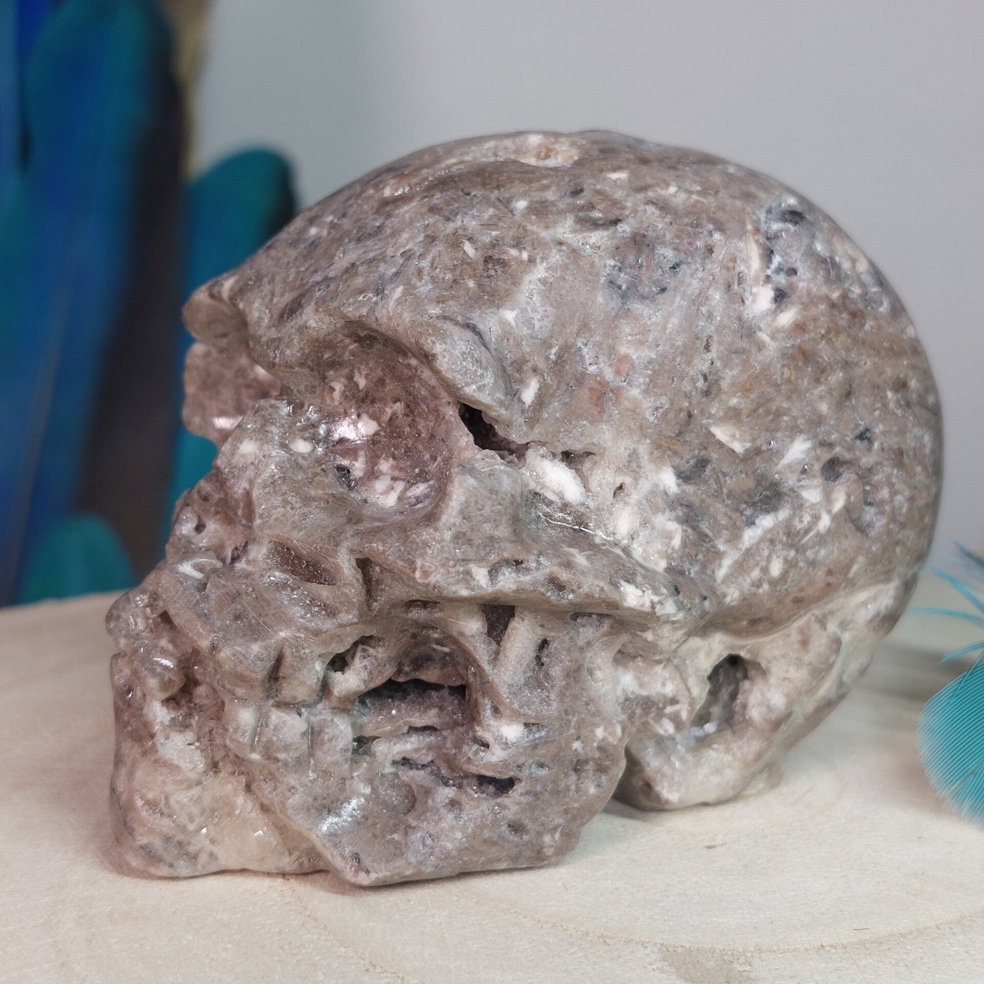 Prachtige handgeslepen skull van 8,5cm gemaakt van Chalcedoon met Goethiet, Mangaan en kwarts. Deze schedel heeft een prachtig "raster" patroon met allemaal holle delen hier binnenin zie je hier en daar sprankelende kristalletjes.