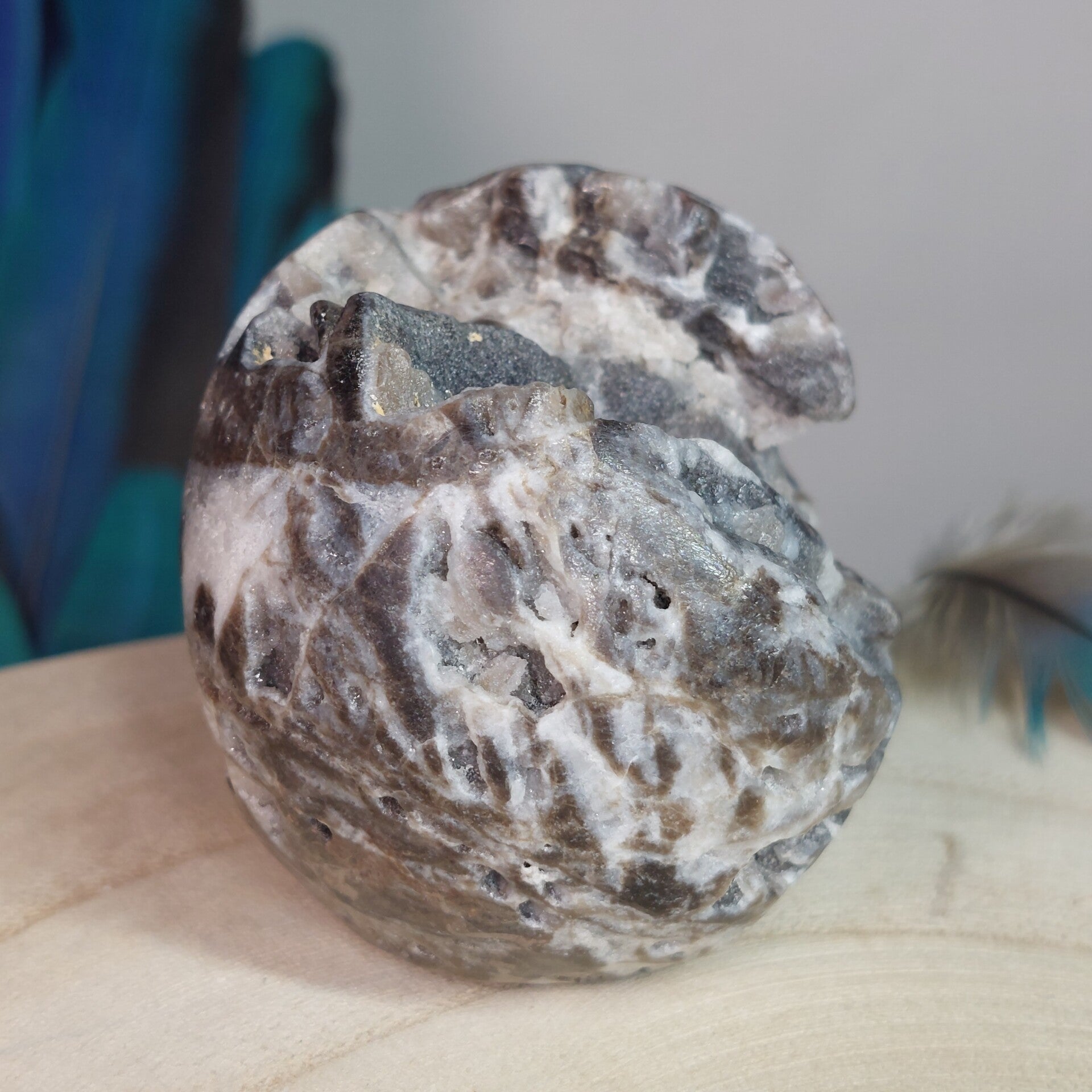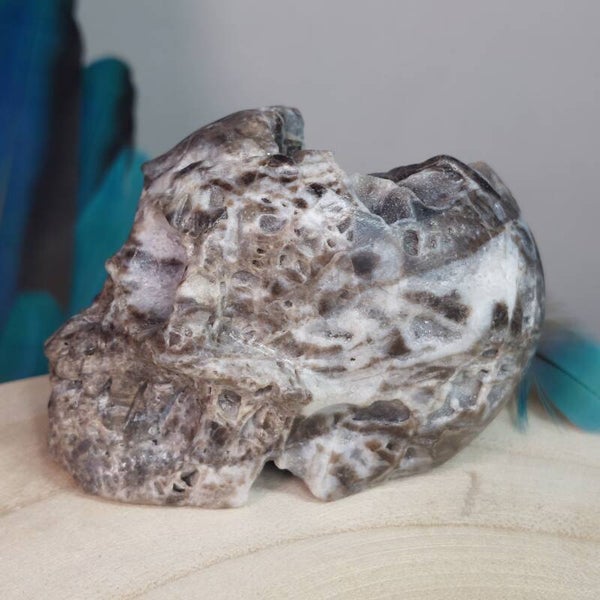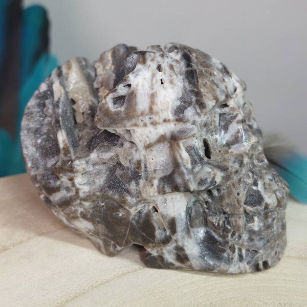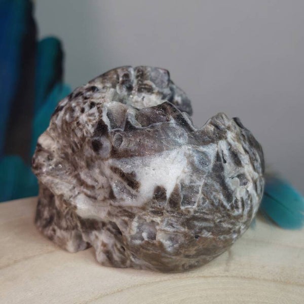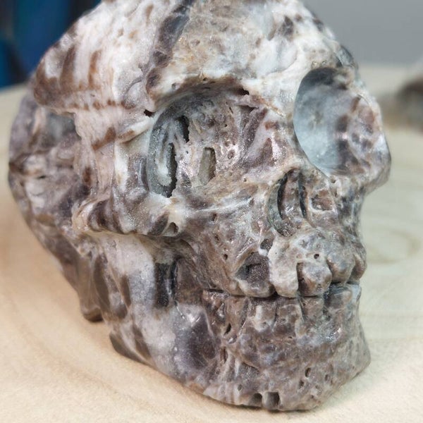 Prachtige handgeslepen skull van 8,3cm gemaakt van Chalcedoon met Goethiet, Mangaan en kwarts. Deze schedel heeft een prachtig "raster" patroon met allemaal holle delen hier binnenin zie je hier en daar sprankelende kristalletjes.