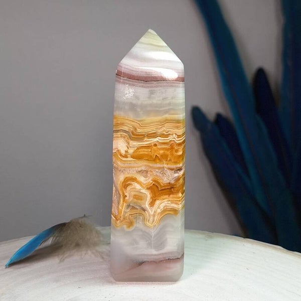 Prachtige toren van roze gestreepte calciet met ruwe geel/bruine Aragoniet uit Pakistan. Zeer bijzondere toren. Pink banded calcite. 215gram 10,7x3cm