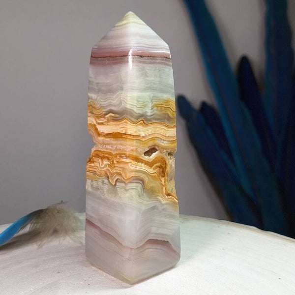 Roze gestreepte Calciet met ruwe gele aragoniet. Prachtige forse toren 11 x 4cm