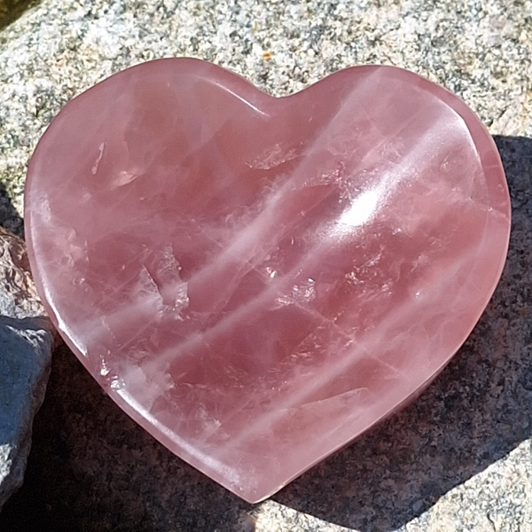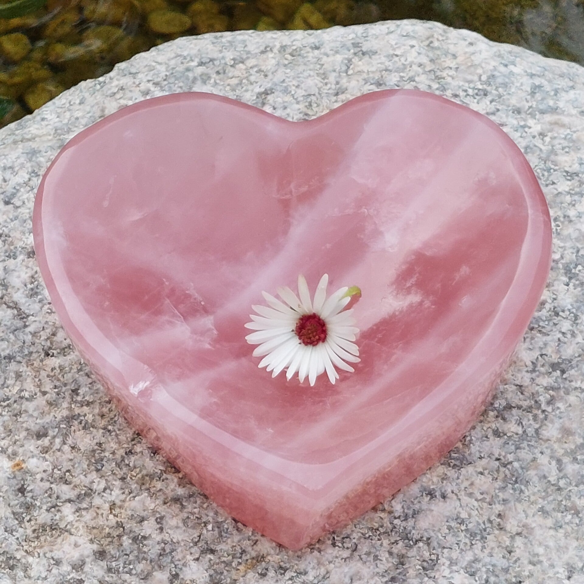 Zeer mooie kwaliteit Rozekwarts, de kleur is intens roze en van enorm hoge kwaliteit. Het hart is maar liefst 4cm dik waardoor deze ook op de zij geleged kan worden. Omdat het een schaal is is deze ook te gebruiken om dingen in te leggen. De schaal is maar liefst 10,2x9,9x4cm . De schaal heeft aan de rand een kleine beschadiging waardoor deze in prijs is verlaagd.