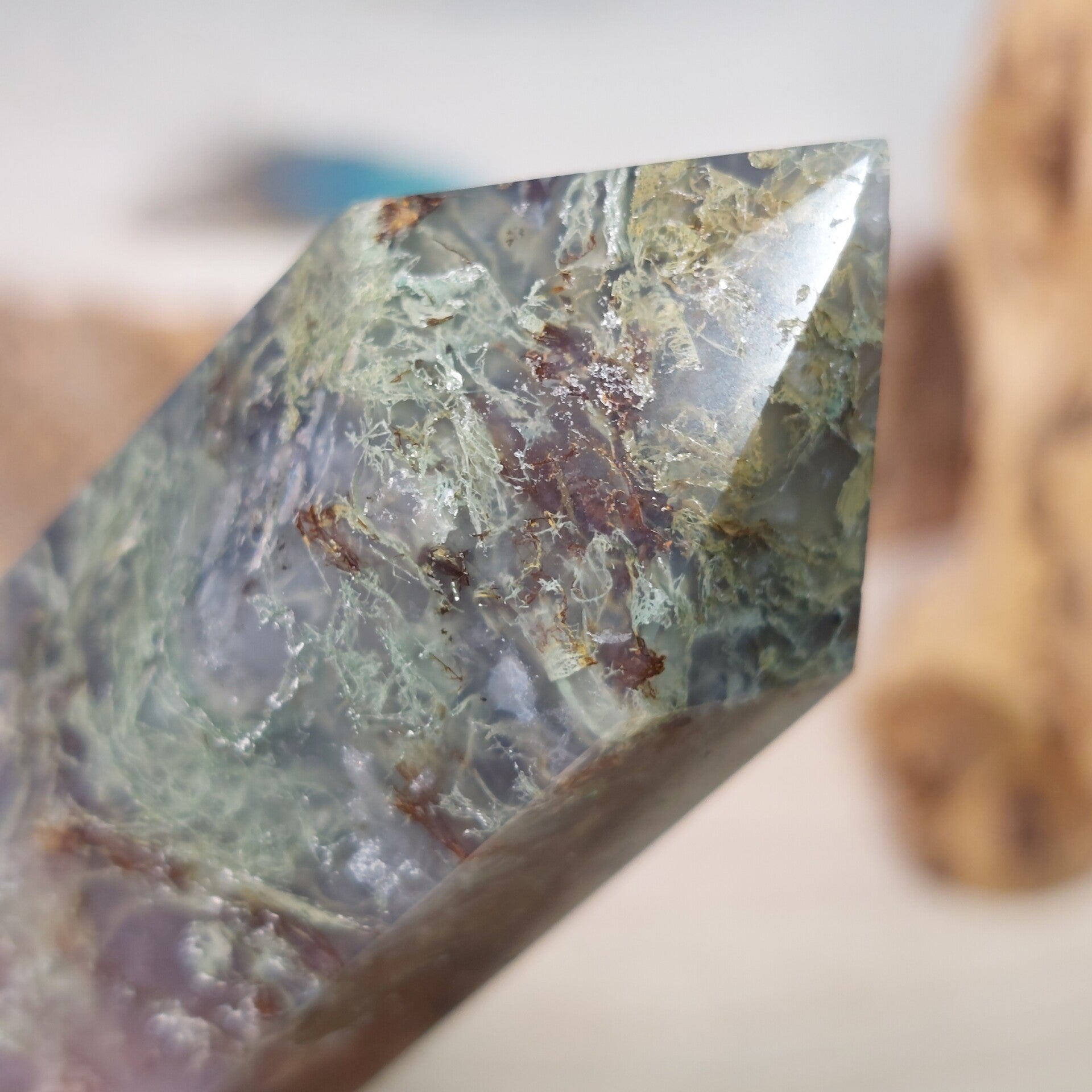 Prachtige dubbel einder van 8,8 x3 cm van mooie Mosagaat met regenboogjes. Deze mosagaat heeft zowel boven als onderkant een geslepen punt waardoor deze extra geschikt is voor bijvoorbeeld te gebruiken in een grid.
