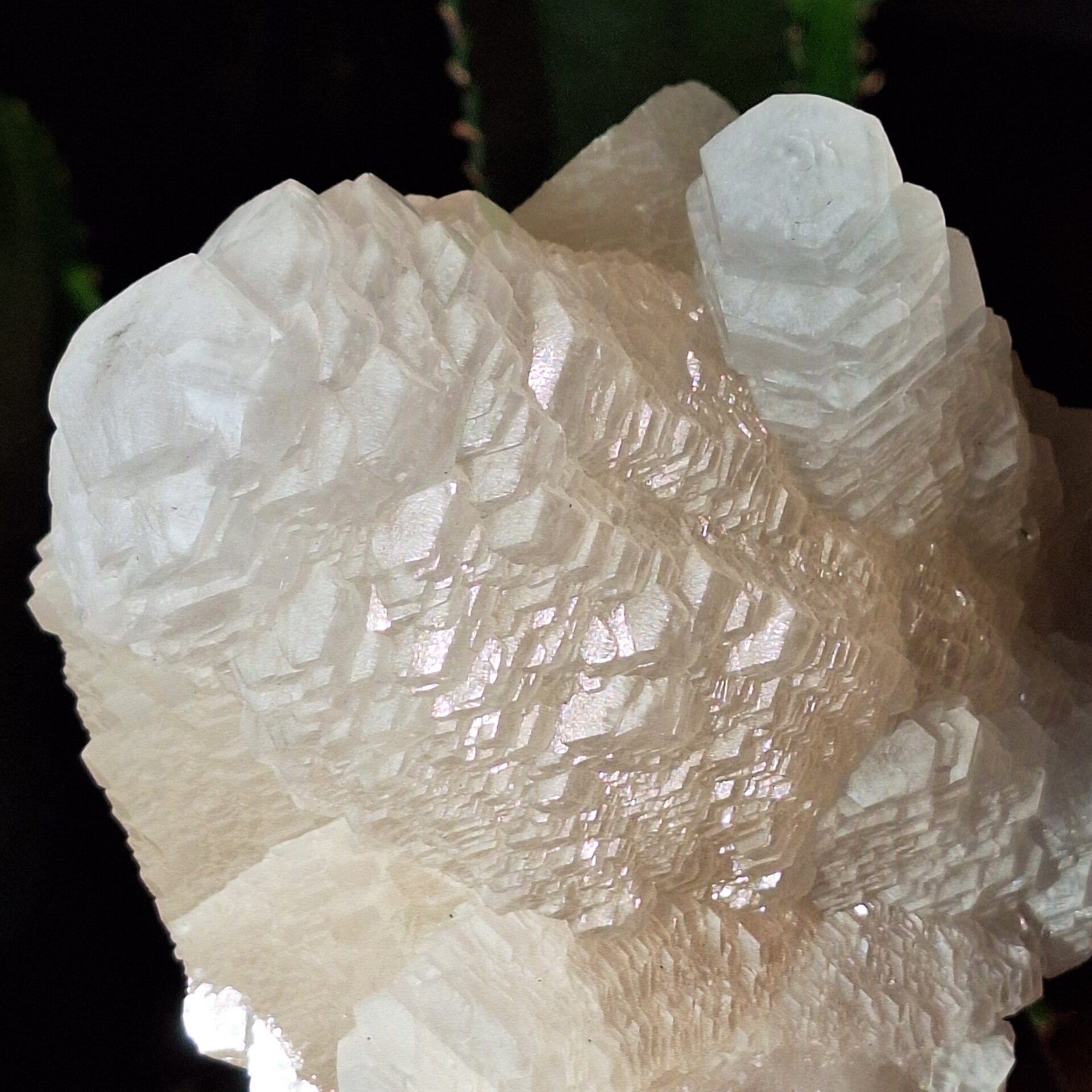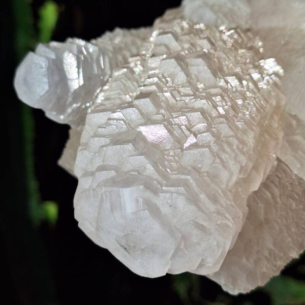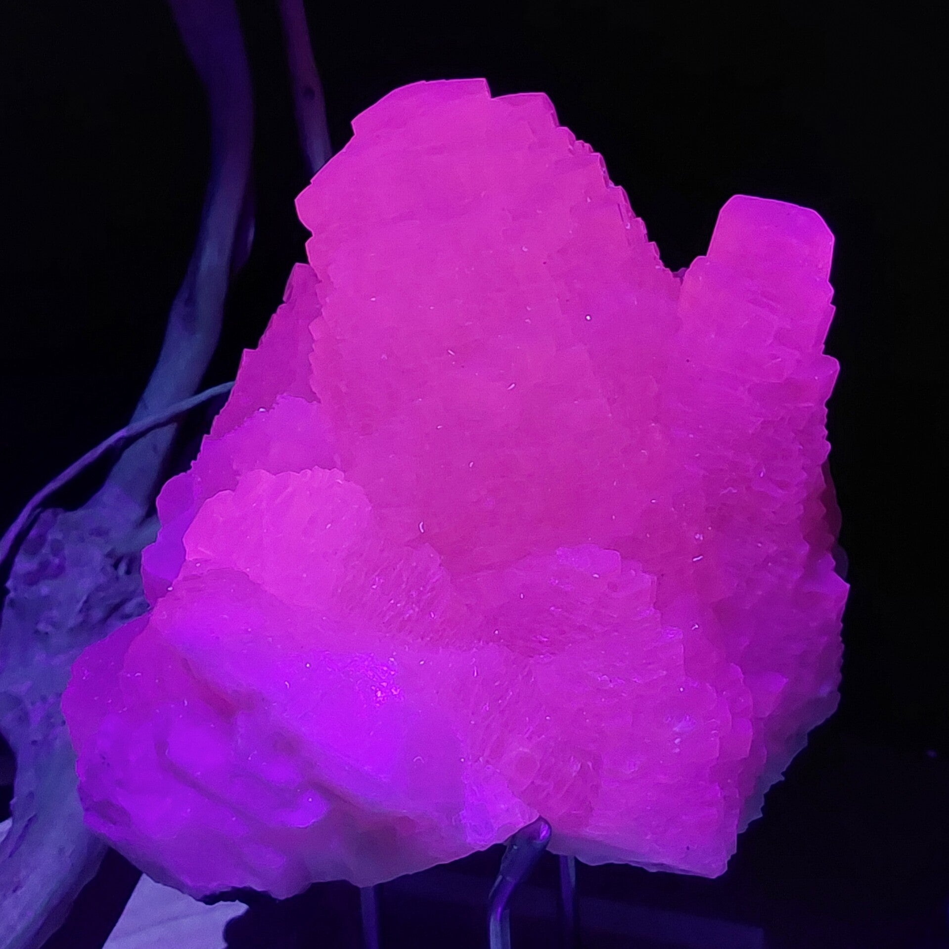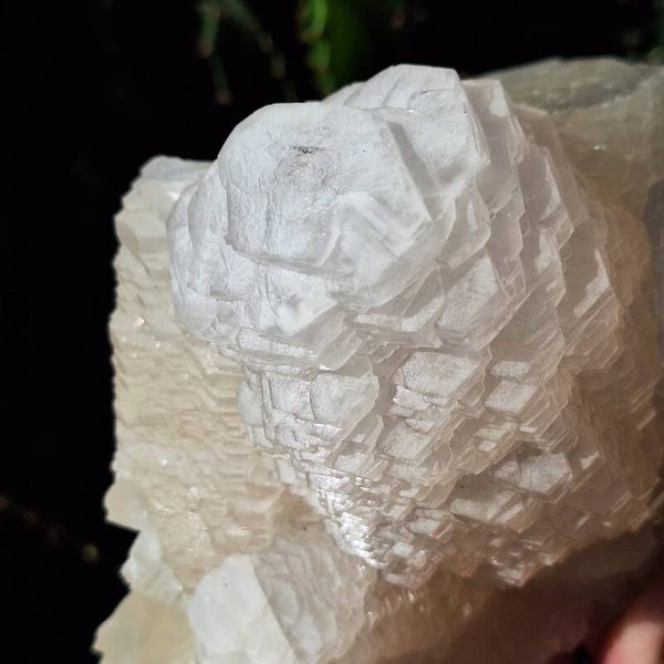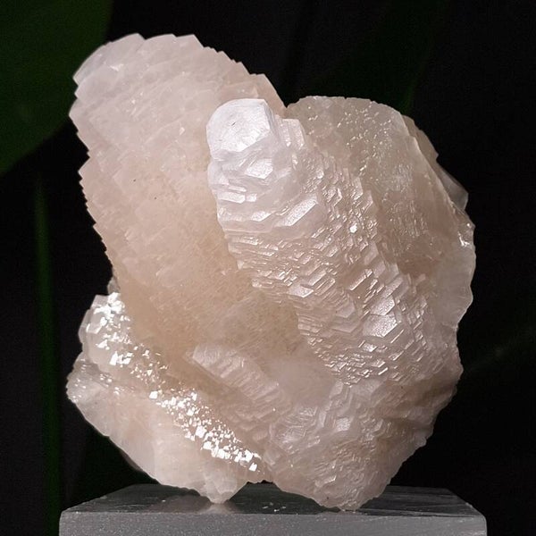Prachtige Pagoda calciet cluster uit Longyan Fujian China. Top.kwaliteit, grote cluster van 1260 gr 14cm. In zeer mooie staat. Ik verwonder mij telkens weer over de verschillende soorten Calciet die er bestaan met ieder zijn eigen kristal groei en vormen. Sommige soorten reageren op uv licht en veranderen van kleur. Zo ook deze unieke Pagoda cluster. Ze reageert krachtig op uv licht, zowel uv licht op golflengte 365nm (geeft oranje kleur) als 395nm (geeft roze kleur). Kleine uv lampjes worden meegeleverd om meteen te kunnen genieten van het prachtige effect. Beste effect is te zien in schemer en donker waarbij er een explosie van kleurverandering lijkt te ontstaan. Deze Calciet heeft een zijde-achtige glans en is van prachtige kwaliteit.